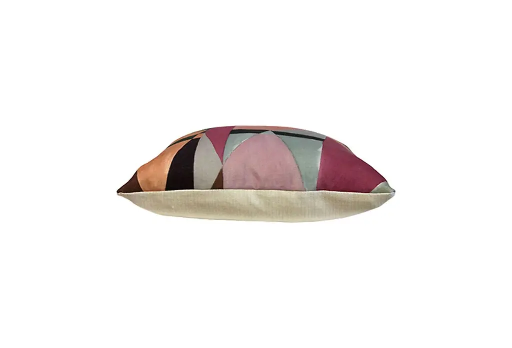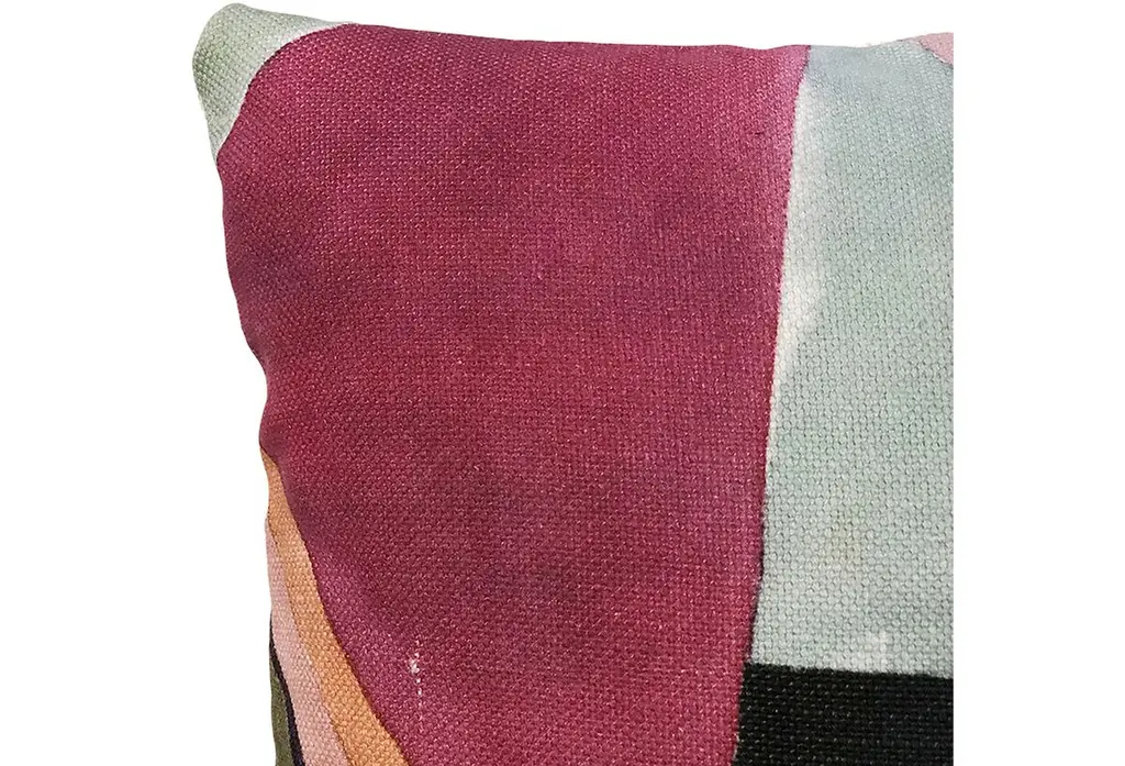 Perfect for updating the sofa with a pop of pattern, this linen-blend pillow features a colorful geometric abstract motif on one side and a solid cream back. Insert included. Zipper closure.