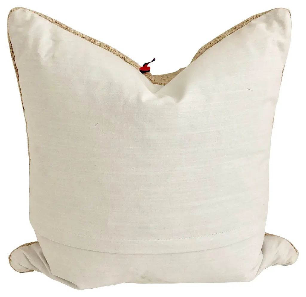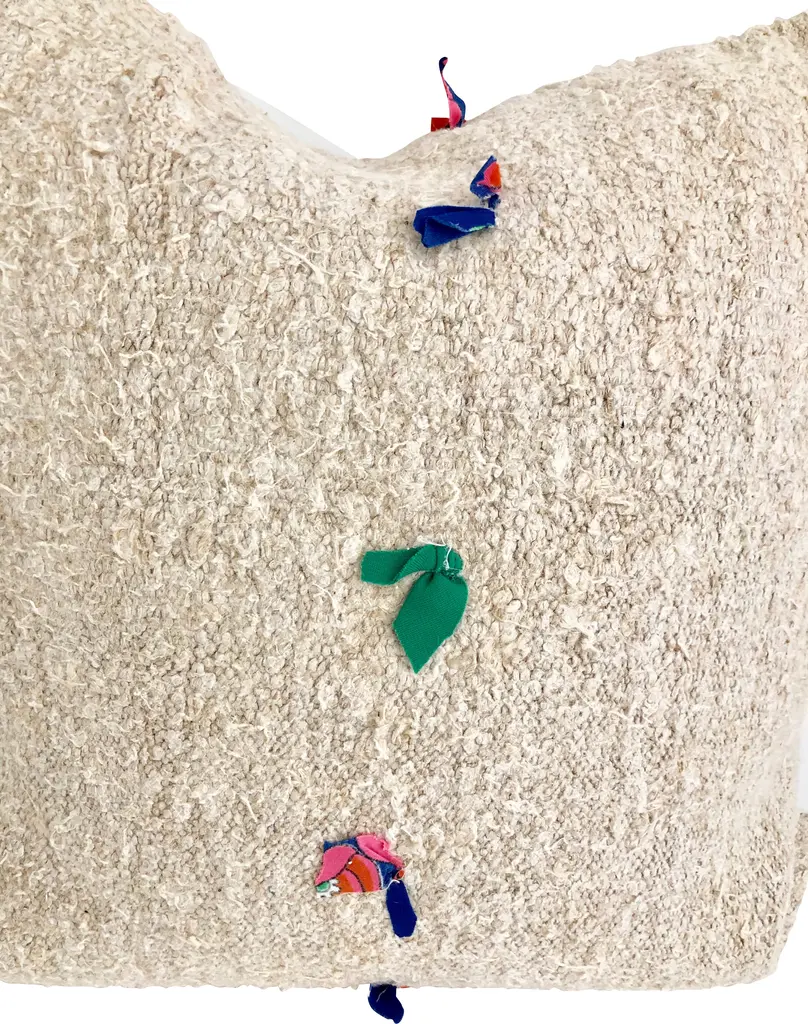 Pillow made from a vintage Turkish kilim festooned with swatches of fabric ties.Linen back. Zipper closure. Feather-and-down insert included.