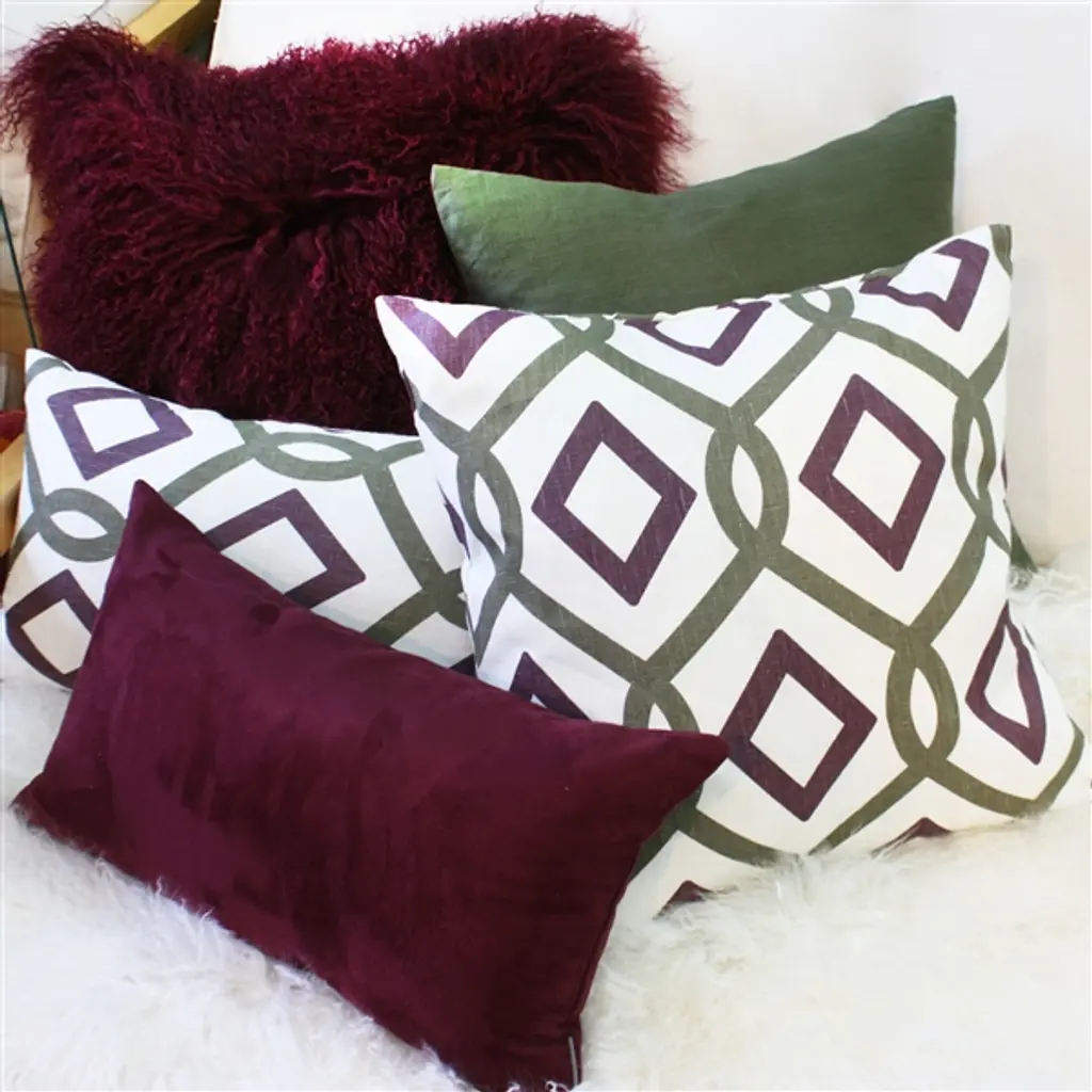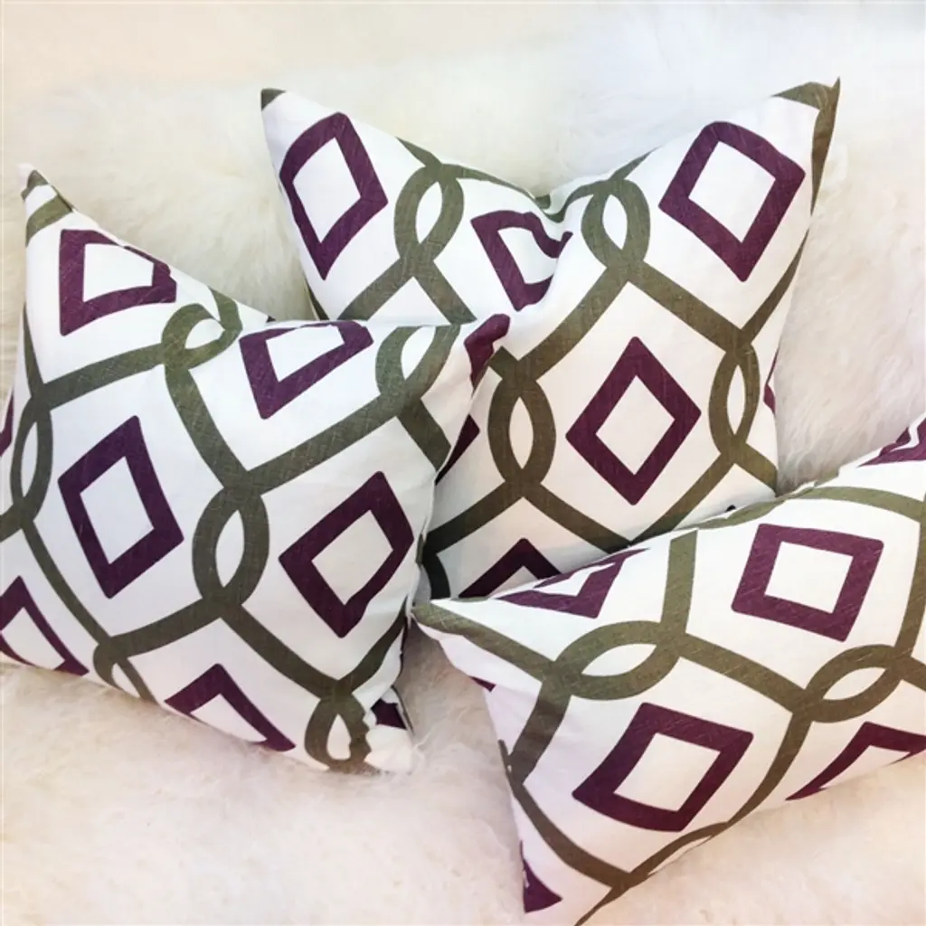 These 100% linen pillows feature a classic diamond and pattern in dark dusty purple and sage green on an off-white background. This contemporary design with a retro twist makes for a beautiful home decor accent. Size: 19"x19" Square Fabric: 100 % Linen Same fabric front and back Knife edge seems Color matched, hidden zipper closure Dry clean only Made in Canada: Designed and made in Pillow Decor's Vancouver workroom.