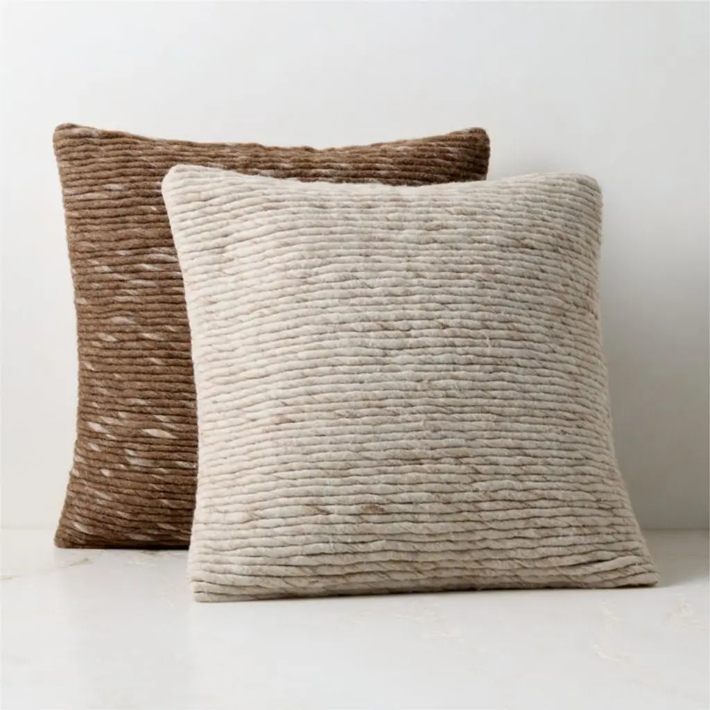 Throw pillow by Kravitz Design showcases an artful composition of twisted wool applique across the front, creating a dynamic interplay of color and texture. Each strand adds depth and dimension to evoke a sense of movement and richness. Natural cotton-linen back offers a soft contrast while a brass zipper and tailored knife edge provide a refined finish. CB2 pillows include a pillow insert in your choice of feather down or down alternative. CB2 exclusive.