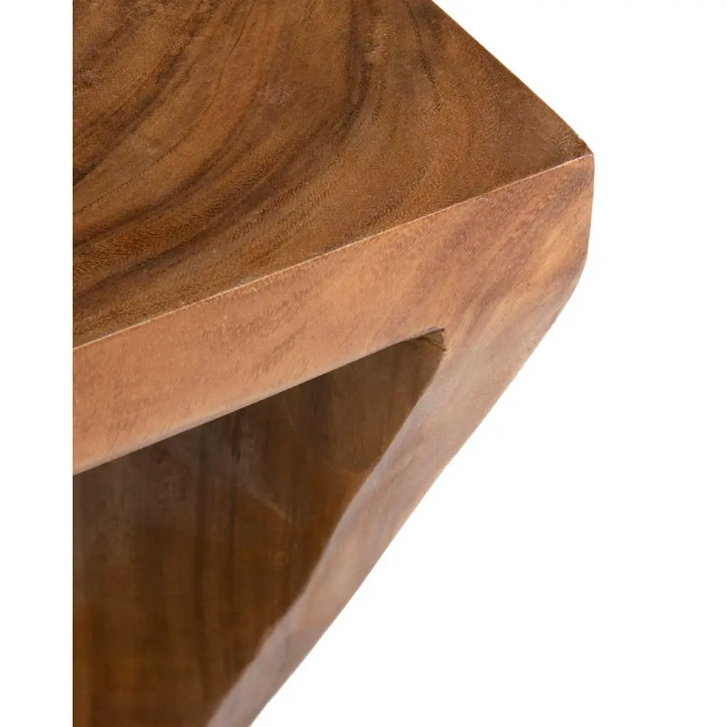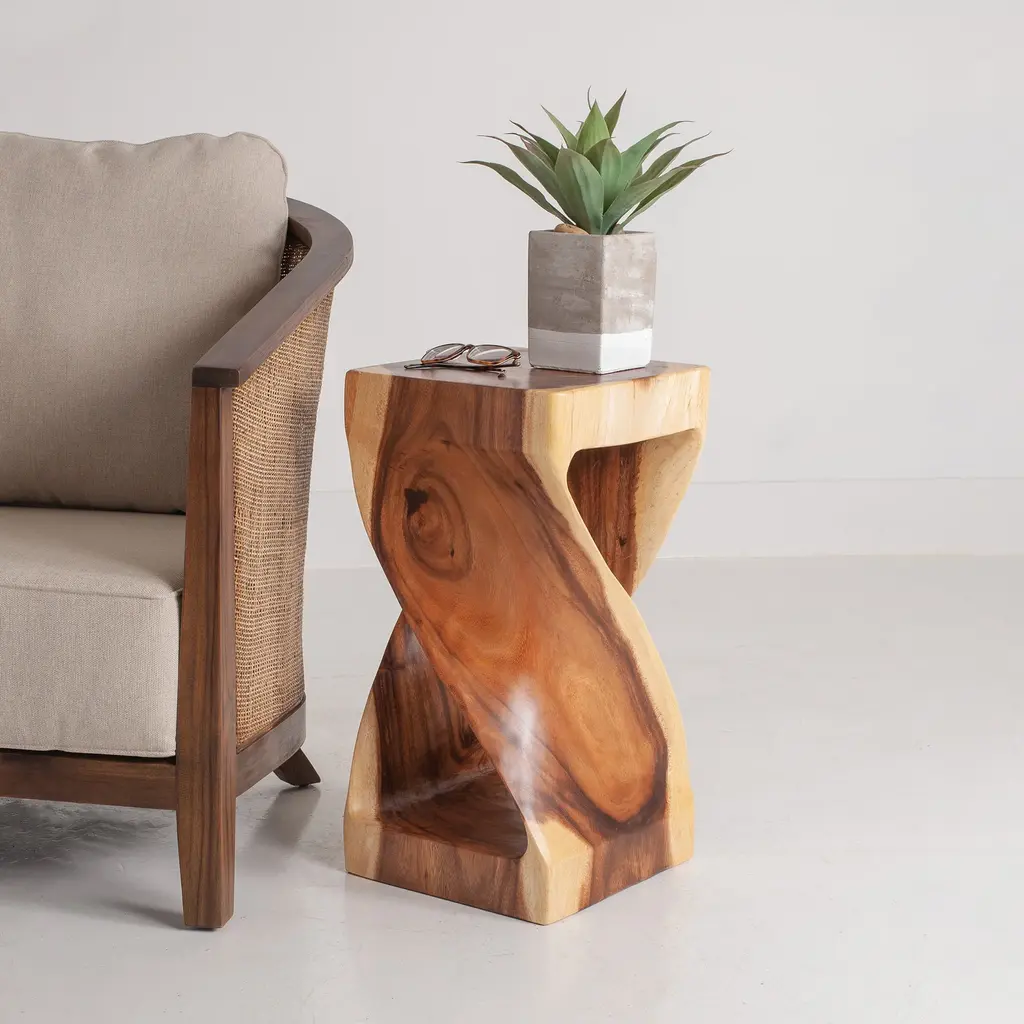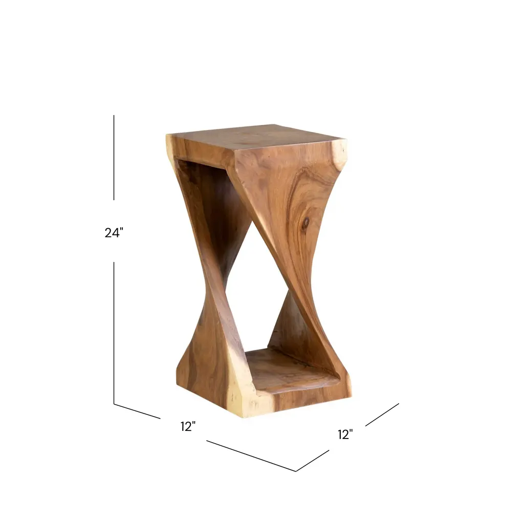 Hand-carved from solid wood, this end table is a striking accent for any living space. The twisted sides beautifully showcase the natural wood grains, creating a truly one-of-a-kind piece. Its open base offers a clever spot to tuck away an extra blanket or throw pillow. Thanks to the unique characteristics of the natural materials, no two pieces are alike. Pair it with a cozy sectional and loveseat for a timeless addition that enhances your everyday moments.