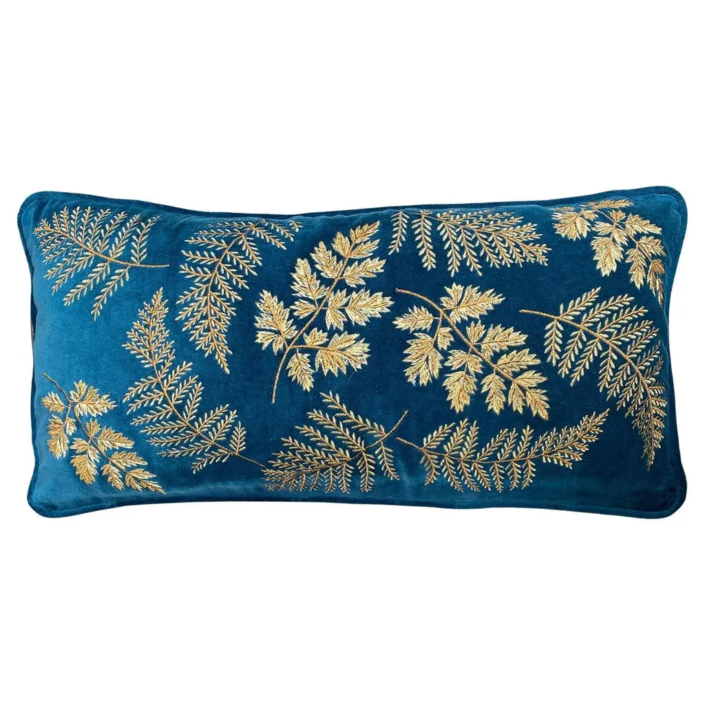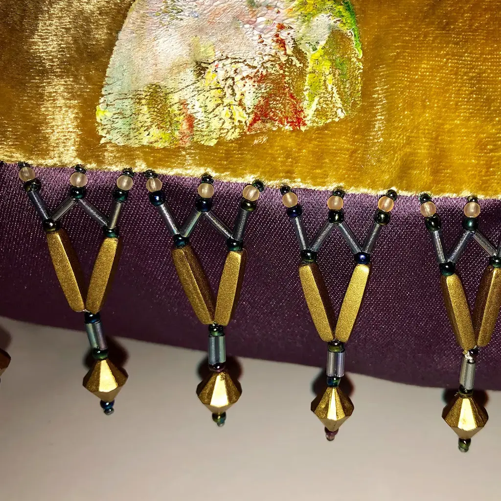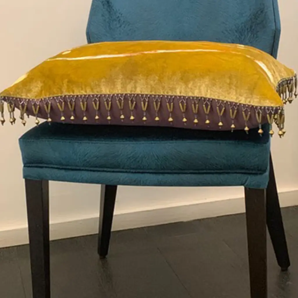 Delightfully artistic and beautifully luxurious, the silk velvet Two Fishes Cushion is dyed with yellow, gold and beige colors and hand painted with colored paste and gold leaf details. This deluxe cushion with a stunning design of two abstract fish features a trimming in glass beads and is complimented by a back in sumptuous purple silk.