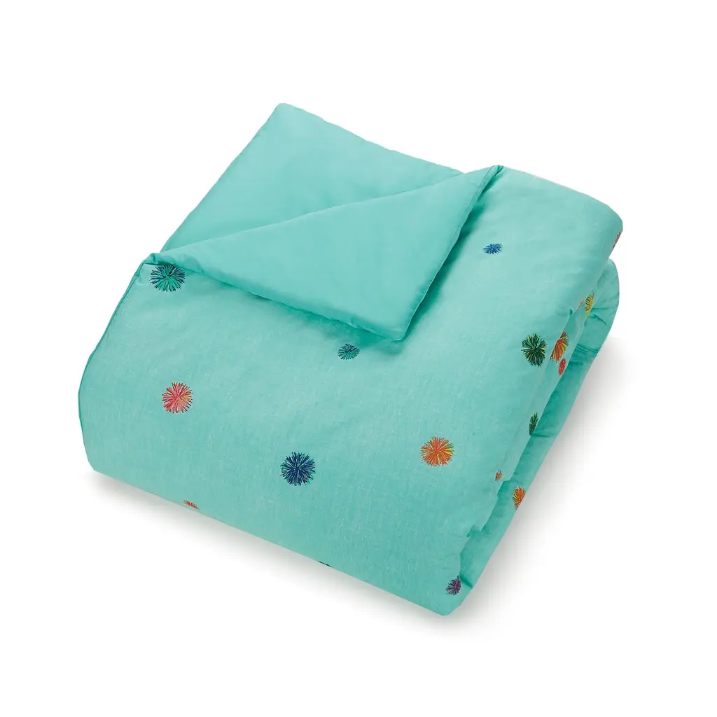 Transform your child's bedroom into a magical sleep space with this Raining Pom Pom Comforter Set. Featuring colored patterns on a turquoise background for a relaxing vibe, this comforter set is made of soft and breathable 100% cotton with polyester fill. Twin 4 Piece Set includes: 1 Comforter - 66"W x 88"L, 1 standard sham - 20"W x 26"L, and 2 decorative pillows: 16"W x 16"L, 12"W x 16"L Full/Queen 5 Piece Set includes: 1 Comforter - 86"W x 86"L, 2 standard shams - 20"W x 26"L, and 2 decorative pillows: 16"W x 16"L, 12"W x 16"L