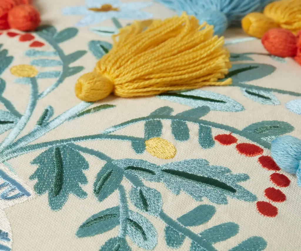 This pillow features an embroidered vase, with a charming twist: tassels have been added in place of flowers. Contrast piping gives it a finishing touch. Part of our Rifle Paper Co. × Loloi collection.