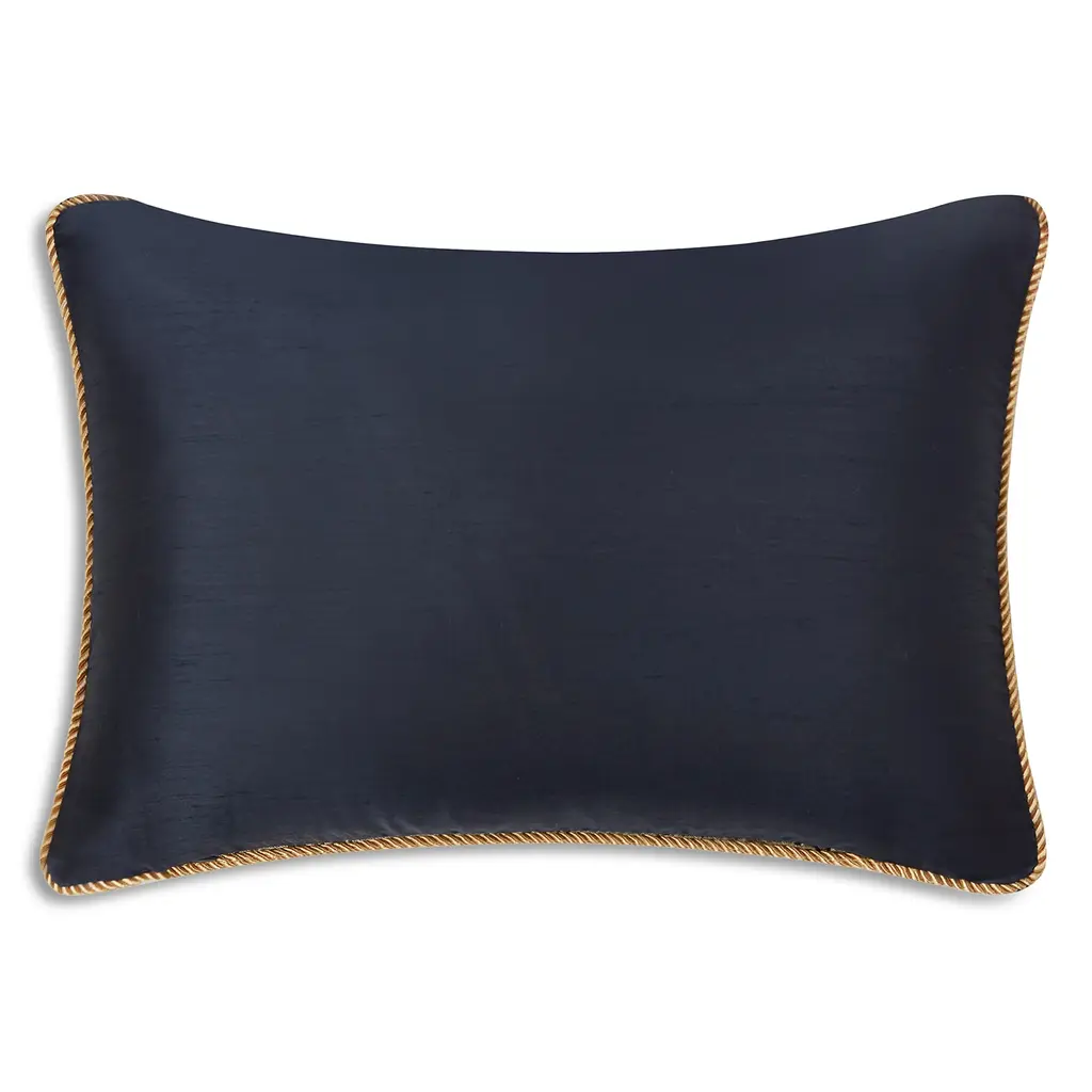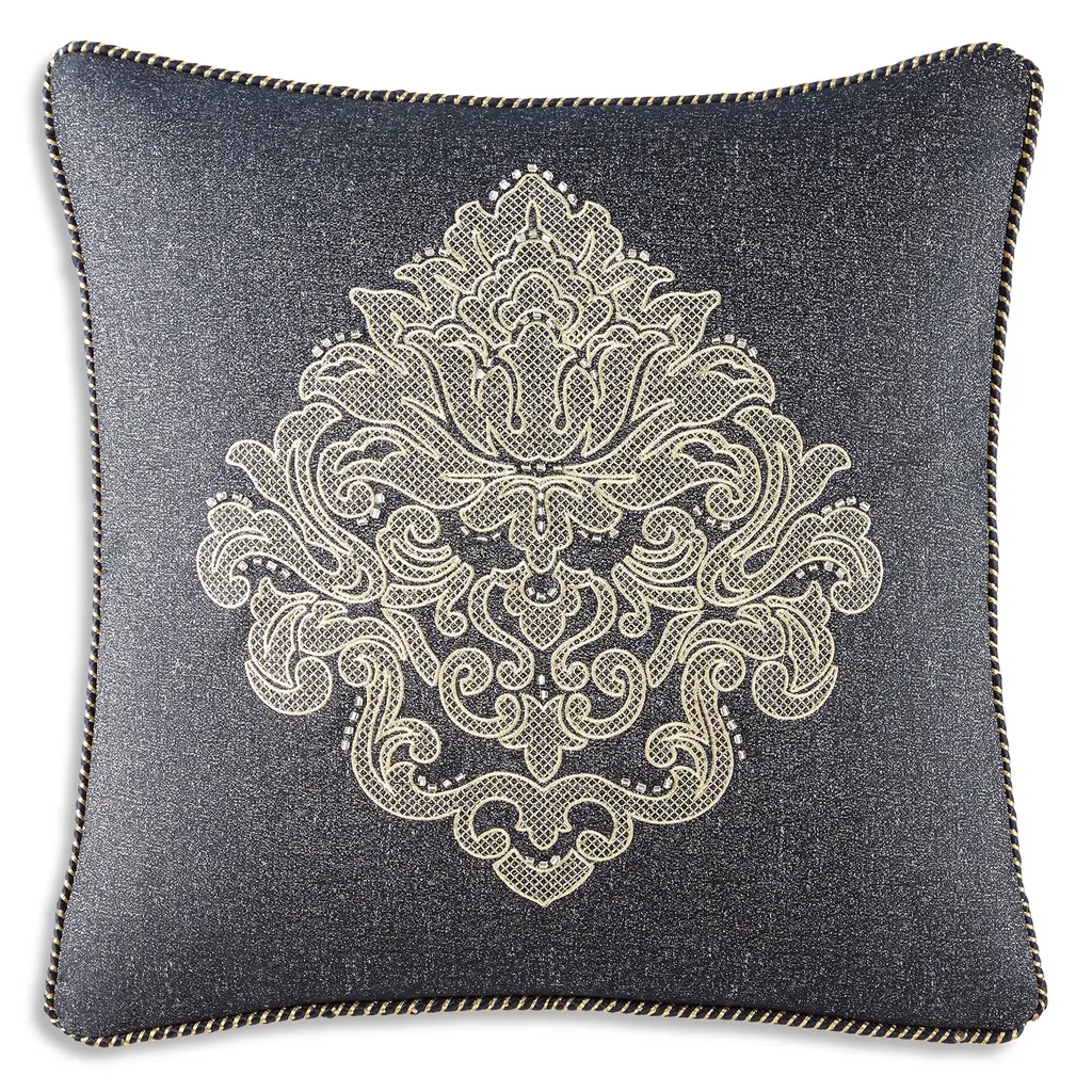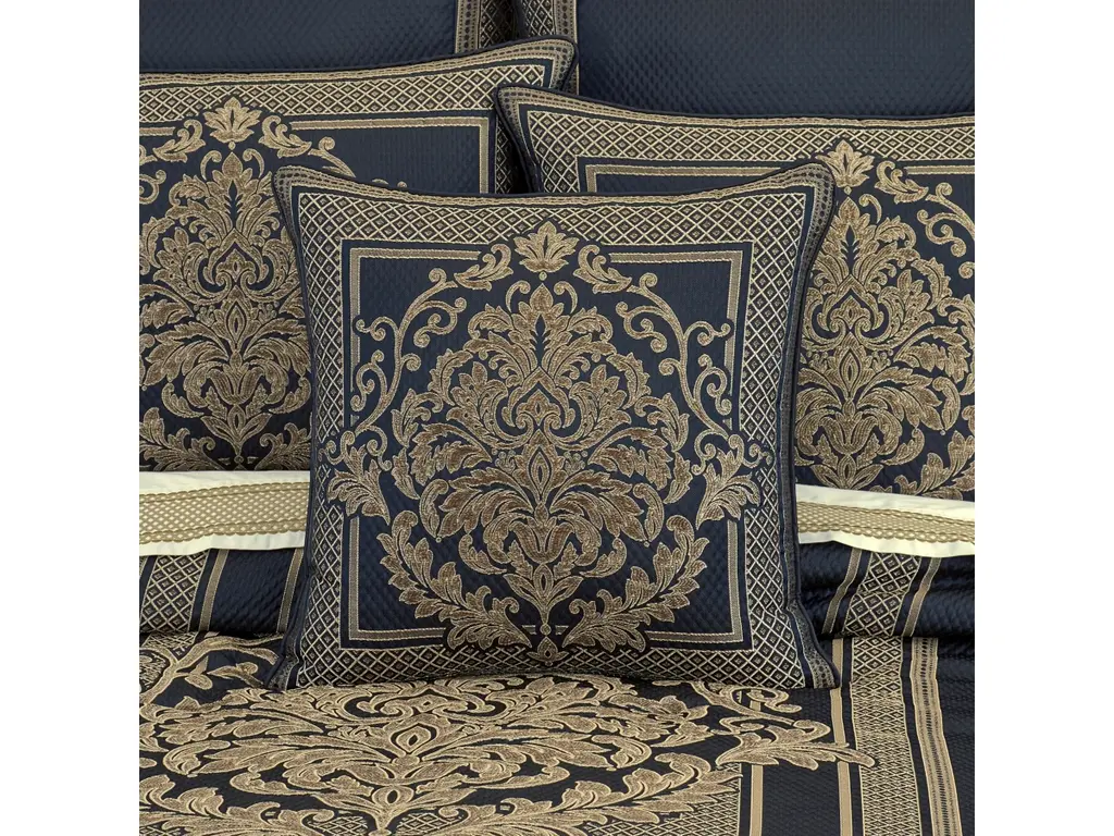 Vaughn showcases a striking over-scaled damask with a beautiful weave technique in a deep navy mixed with golds and a hint of pale blues. The comforter and shams reverse to an updated tile scroll design and are trimmed with a woven cord in navy and gold. The euro shams are solid navy with gold embroidery with a navy and gold textured reverse. The bed skirt is a solid navy with a ribbon and pleat detail.