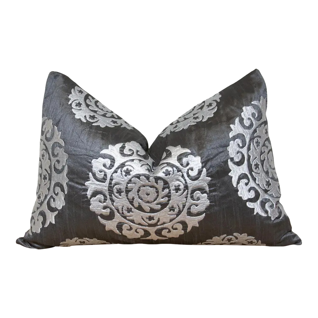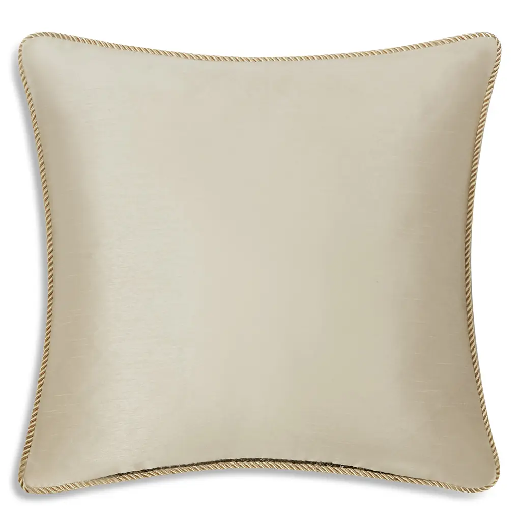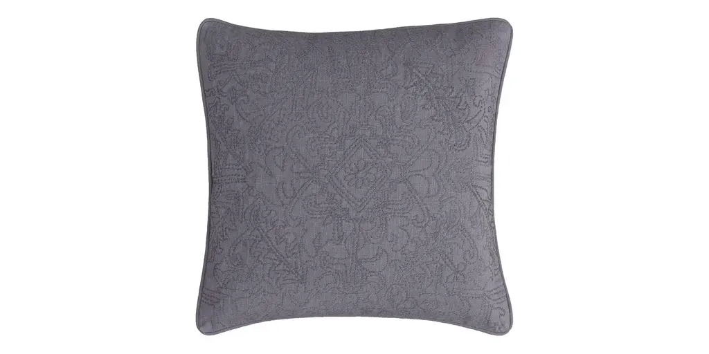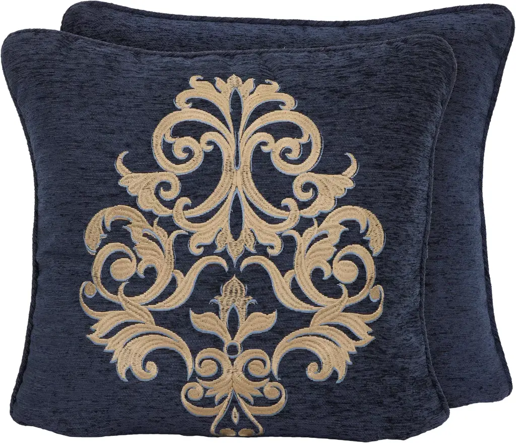 Vaughn showcases a striking over-scaled damask with a beautiful weave technique in a deep navy mixed with golds and a hint of pale blues. The comforter and shams reverse to an updated tile scroll design and are trimmed with a woven cord in navy and gold. The euro shams are solid navy with gold embroidery with a navy and gold textured reverse. The bed skirt is a solid navy with a ribbon and pleat detail.