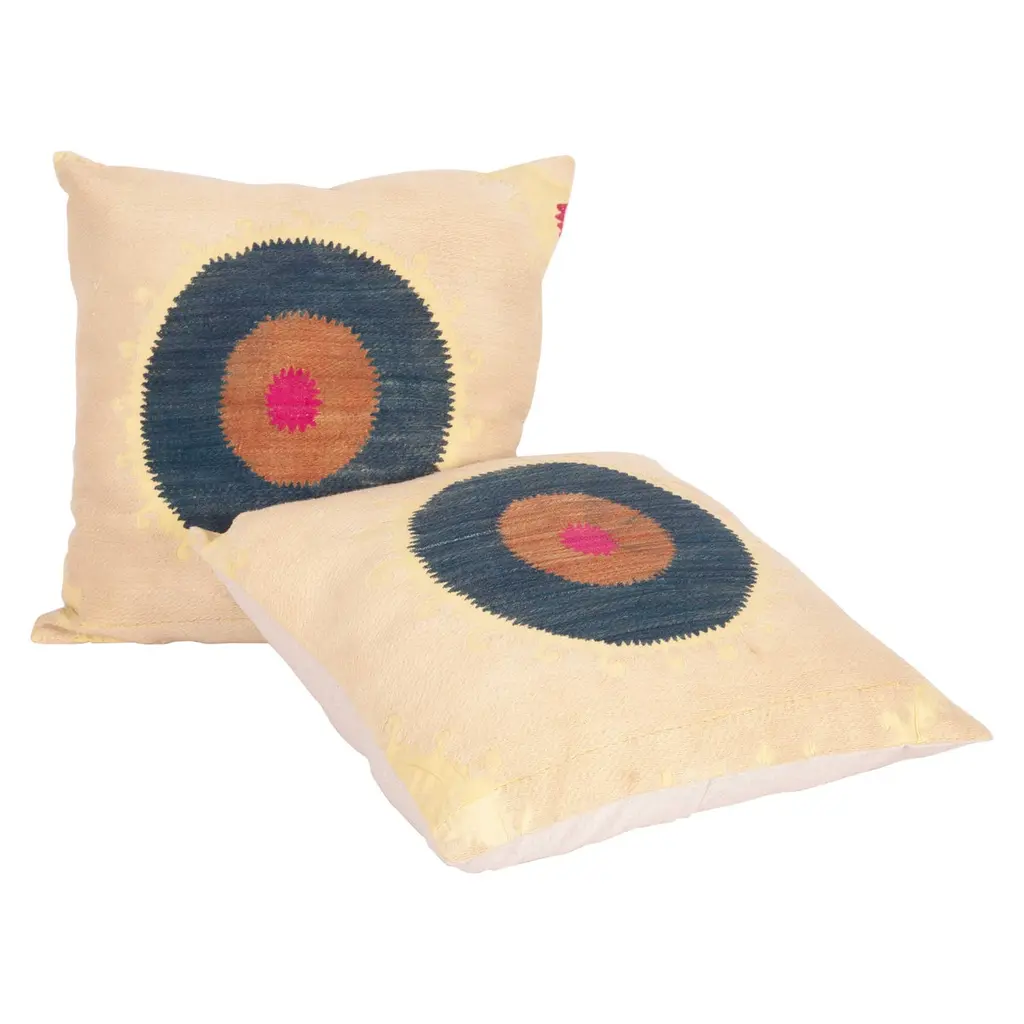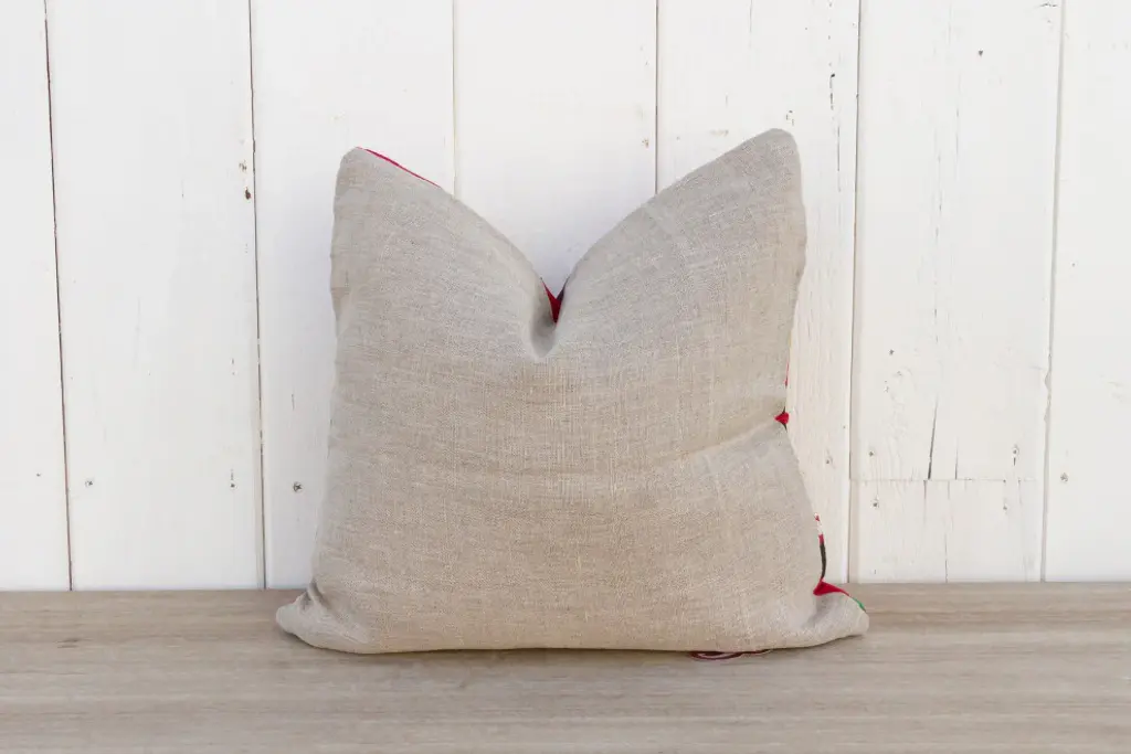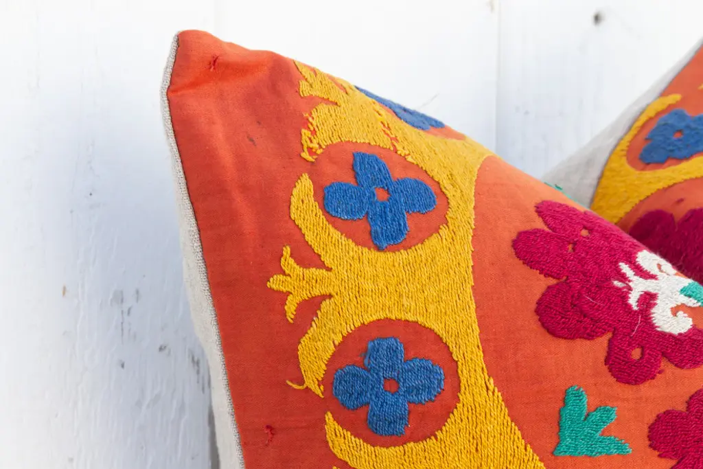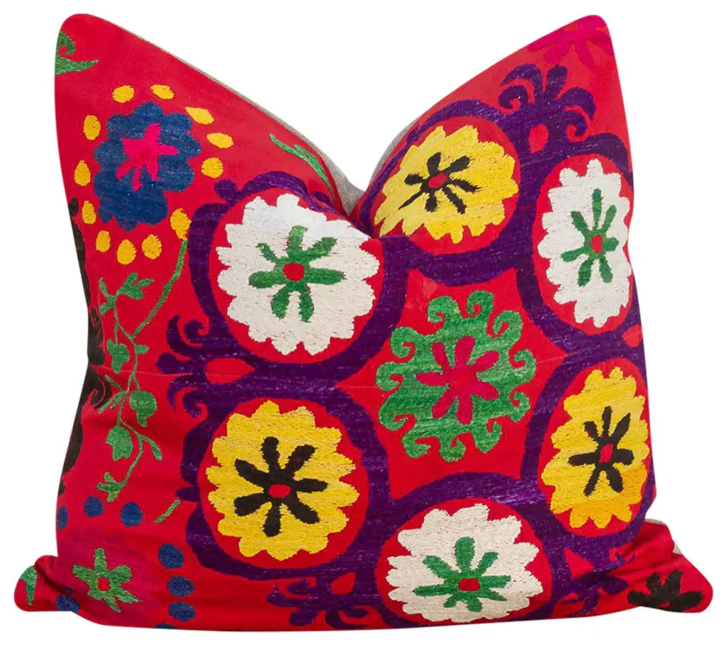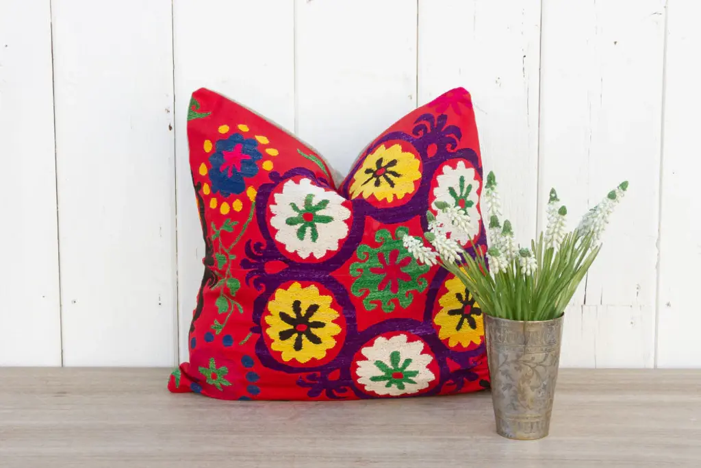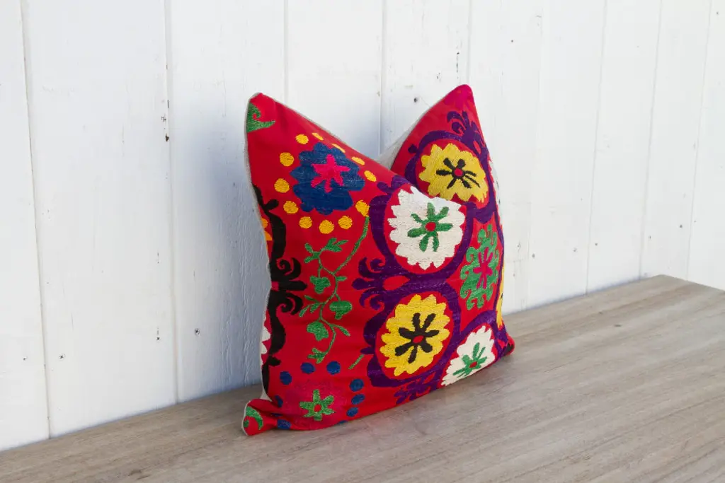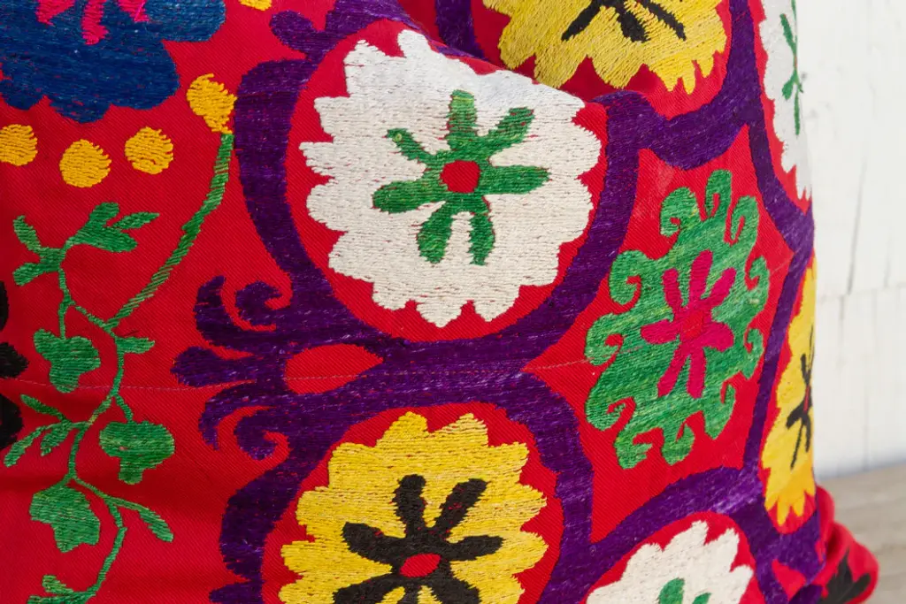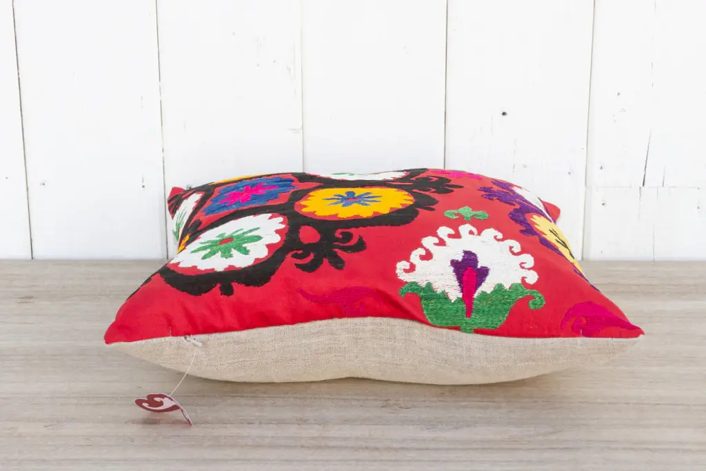 Suzani embroidery is a traditional form of needlework originating Central Asia. Suzani is a Persian word meaning "needle work"�. These antique Suzani tapestries were primarily created by women as a way to decorate their homes and to celebrate important life events, such as weddings and births. This collection of vintage Suzani textiles have been repurposed and made into a one of a kind pillows, this vintage Suzani pillow features intricate hand done embroidery on cotton or silk fabric, with colorful thread work in a variety flowers, leaves & vines motifs. This Suzani artform has been reimagined as bohemian pillow covers by carefully cutting and sewing them with a modern linen backing and hidden zipper closure. Suzani embroidery is known for its vibrant colors and intricate designs, this Antique suzani pillow can be used to create a globally-inspired look or to add pops of color and interest into any room. This pillow shows slight discolorations.