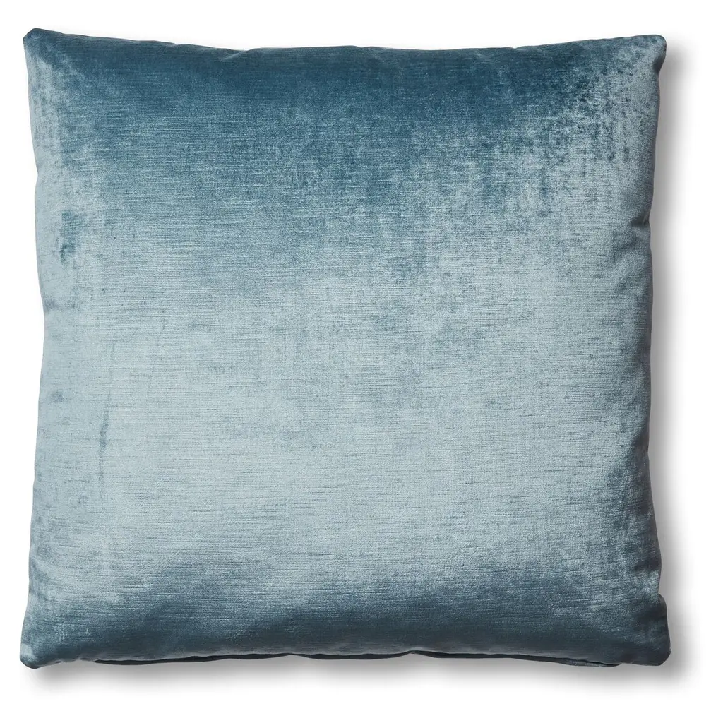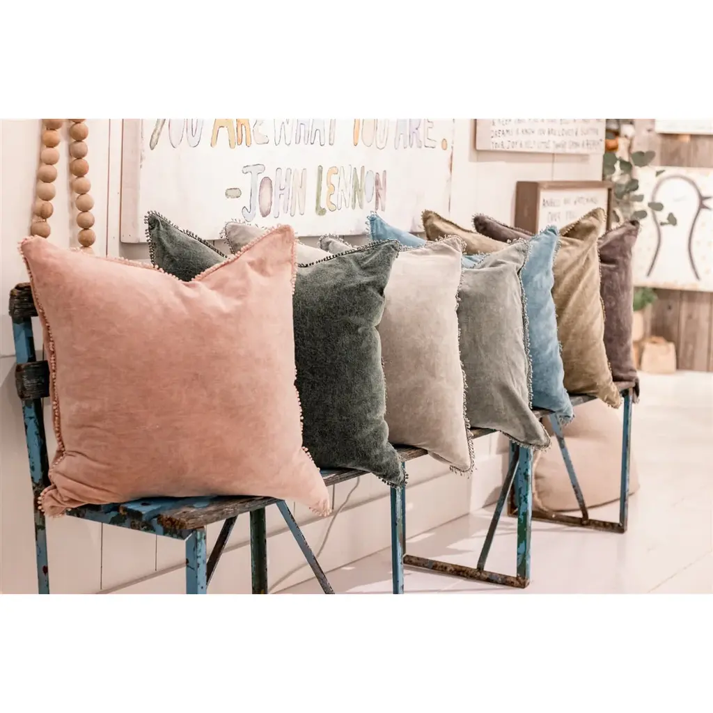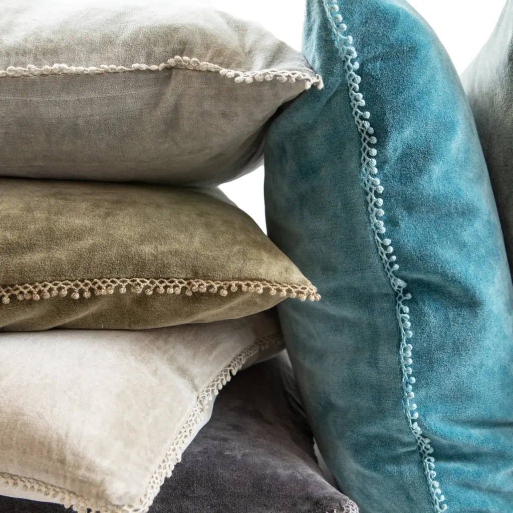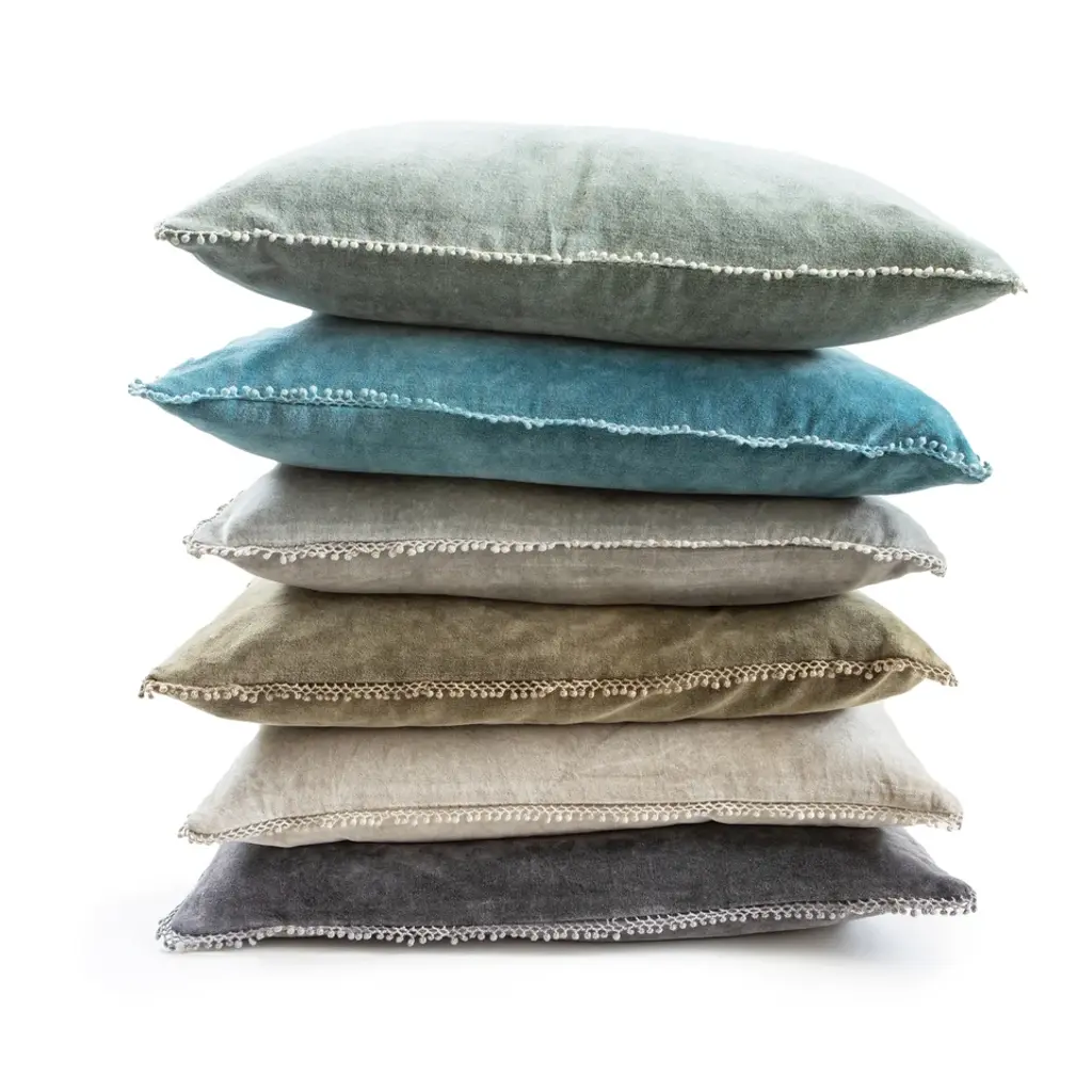 This large 22" square pillow is a lush indigo blue hue and broken down velvet to give that extra "come snuggle me" vibe. Sweetly adorned with pom pom trim this pillow would be adorable paired up on a sofa or entry bench.
