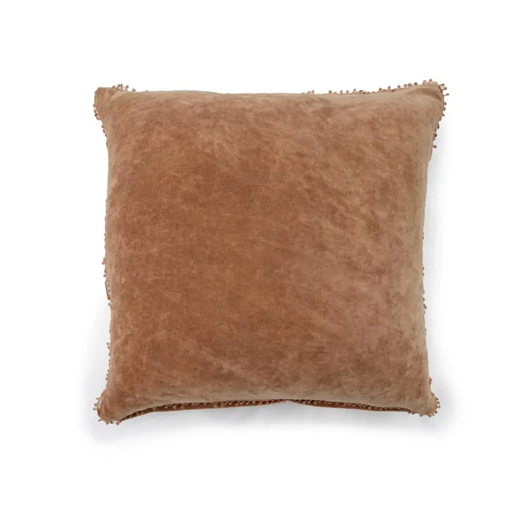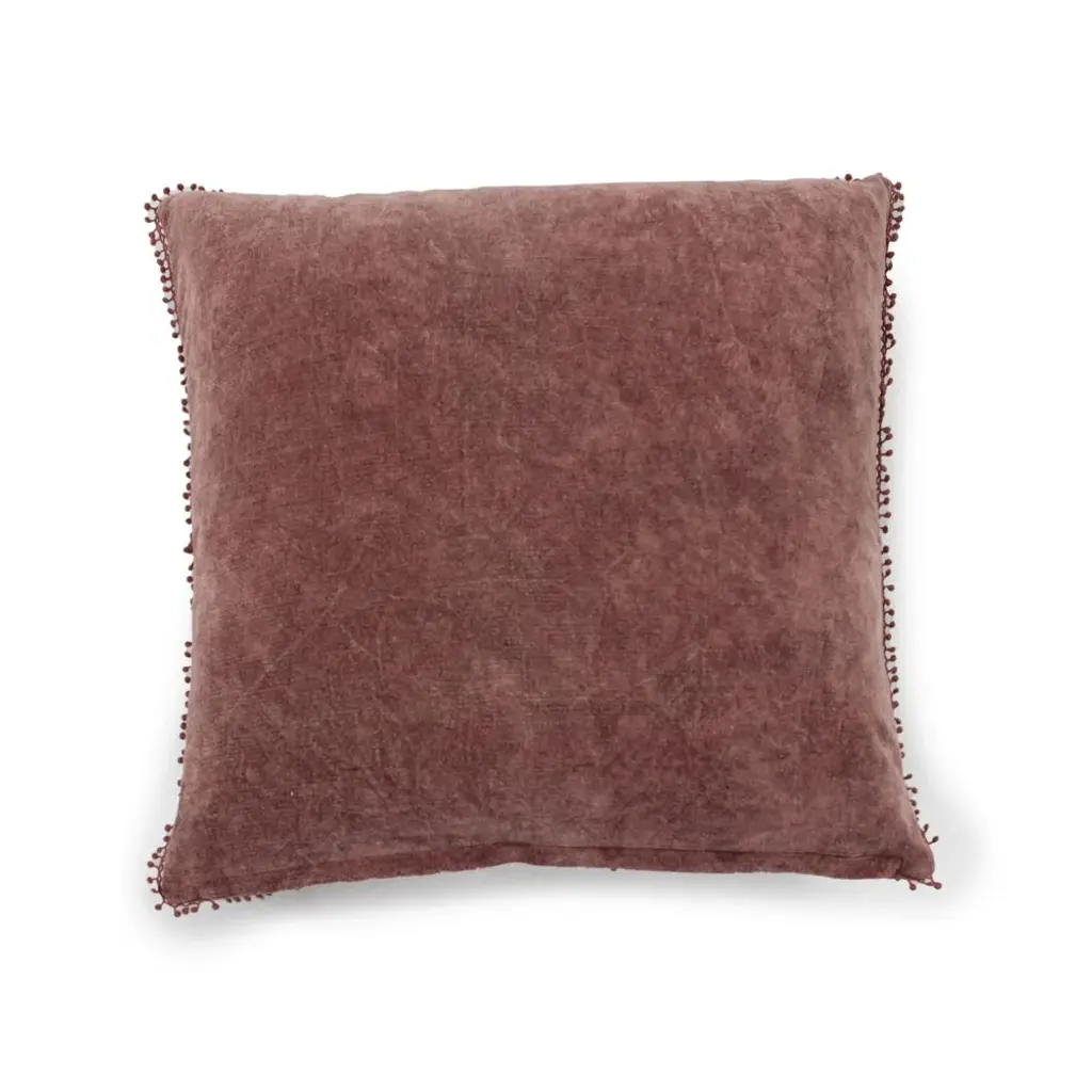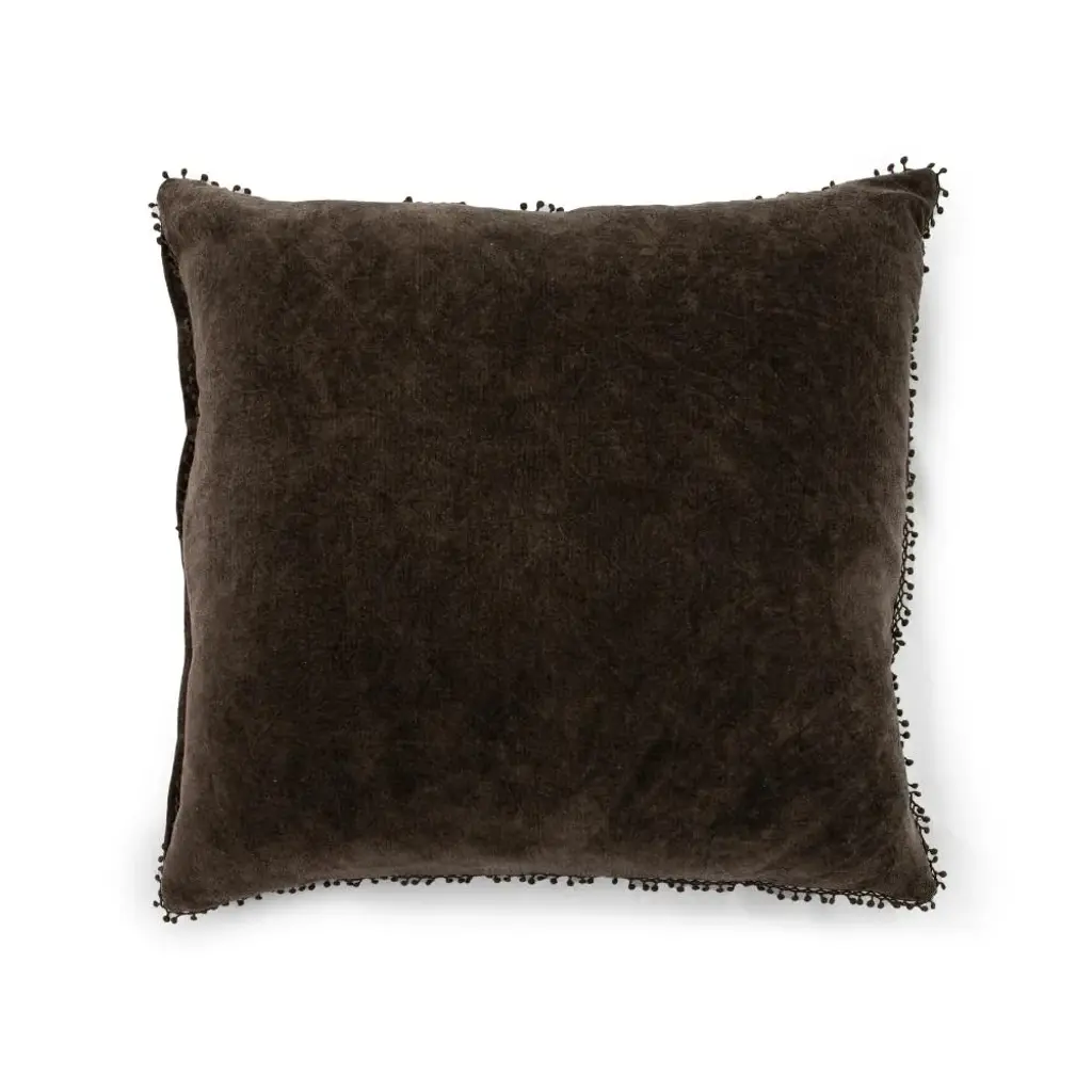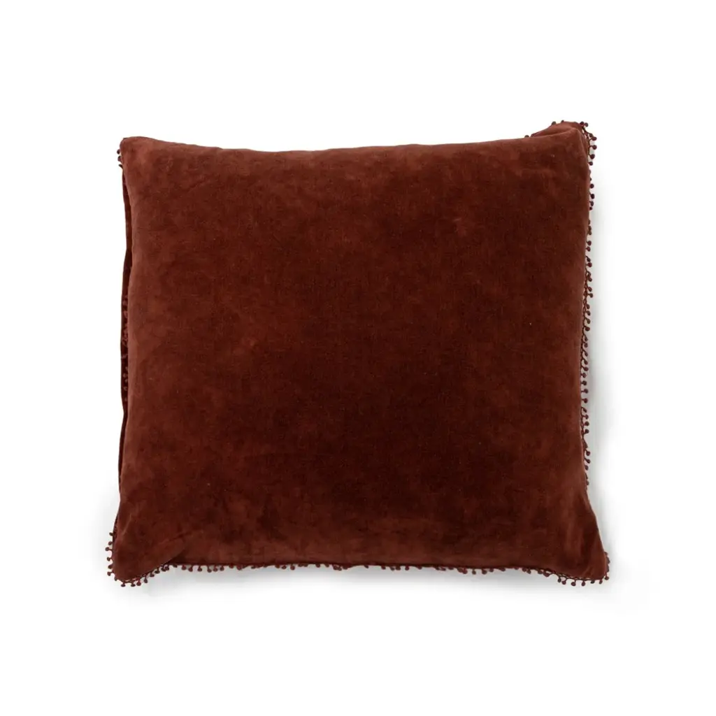 Accent pillows add a welcoming touch to a seat, bench or bed. This gorgeous velvet pillow is sweetly appointed with pom pom detailing around the perimeter.