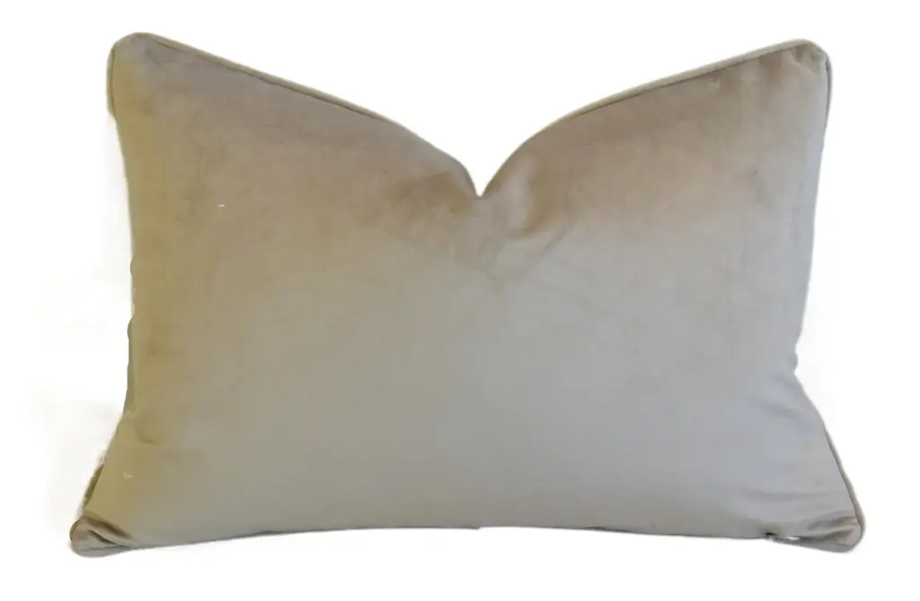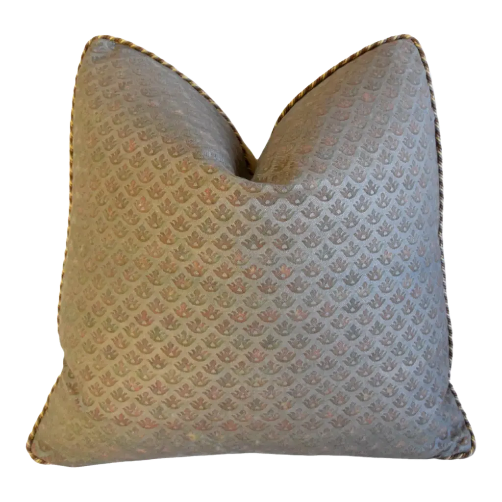 Custom-tailored pillow in Italian designer Mariano Fortuny's premium cotton fabric called "Canestrelli” in a tan, olive, plum, silvery gold, and mushroom colorway. Mushroom-colored cotton velvet fabric back. Custom cord piping trim. Zipper closure. Generous plump goose feather-and-down insert. Excellent new, unused, beautiful condition!!!! ***PLEASE NOTE: I will combine shipping whenever possible if you purchase multiple items from my shop. Warm regards, Mike Seratt ***Also, don't forget to take a look at my other current listings...you might find something you can't live without!!! It's easy. Just click on my name to the right of any listing highlighted in black, "Mike Seratt of The Prized Pig," and presto, it will bring you to my storefront!!! Cheers!!! Mike Seratt I SHIP OUT IMMEDIATELY, SO THE ESTIMATION YOU SEE FOR THE DELIVERY TIMELINE IS CHAIRISH'S OVERALL GENERAL TIMELINE, BUT I WILL GET THIS OUT THE NEXT DAY AND DELIVERY IS USUALLY 5-7 DAYS AT MOST