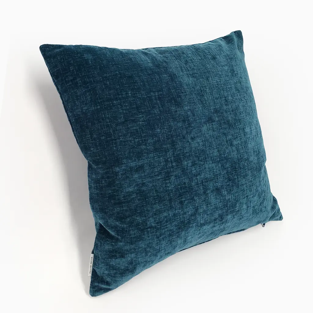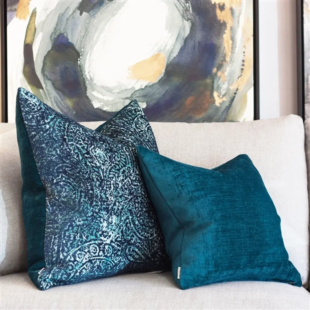 The Venetian Velvet Peacock Teal Throw Pillow is a wonderfully soft and luxurious pillow. At 17 inches square, it is a perfect size either by itself or layered in front of larger pillows. The fabric has a texture that feels half chenille and half velvet, but the luster and sheen is all velvet! This is a great pillow for all settings from traditional to contemporary, and will add lasting comfort to your home. Size: 17"x17" Square Fabric: 100% Polyester Same fabric on front and back Knife edge seams Hidden zipper closure Cold water wash separately, air dry Made in Canada: Designed and made in Pillow Decor's Vancouver workroom.