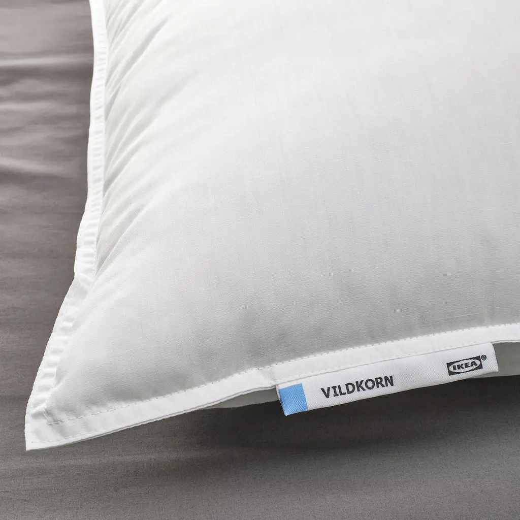 VILDKORN Pillow, stomach sleeper King. A low, easy-care pillow with a polyester and cotton blend fabric and a polyester ball fiber filling from recycled sources. The ball fiber filling is pliable, airy and easy to fluff. 186 thread count.