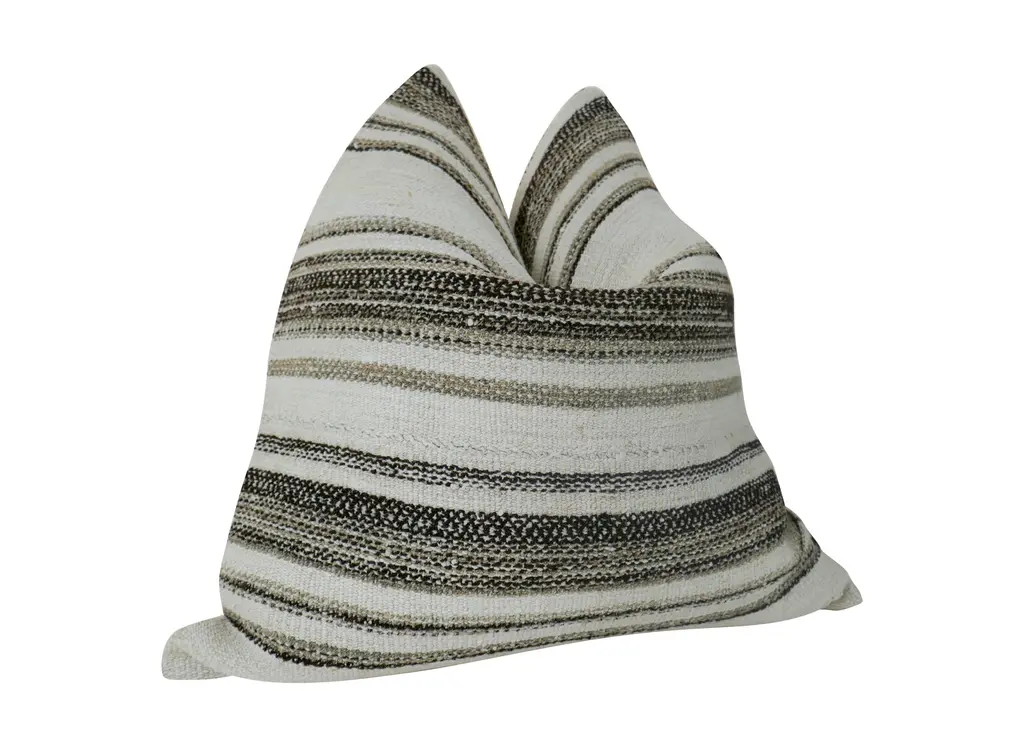 From our vintage textile collections. One-of-a-kind large pillow created from a fabulous authentic vintage Berber tribal hand-woven textural wool & goat-hair kilim textile. Beautiful natural variegated weaving, tones and texture throughout. Backed in our premium white pure linen. Ultra-Plump down-and-feather insert, hidden zipper closure. Impeccably created by Fragments Identity in sunny California!