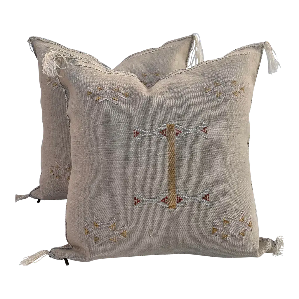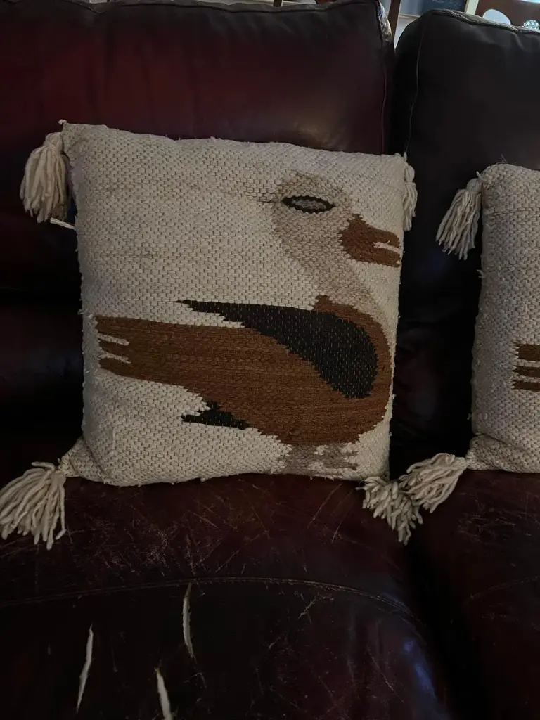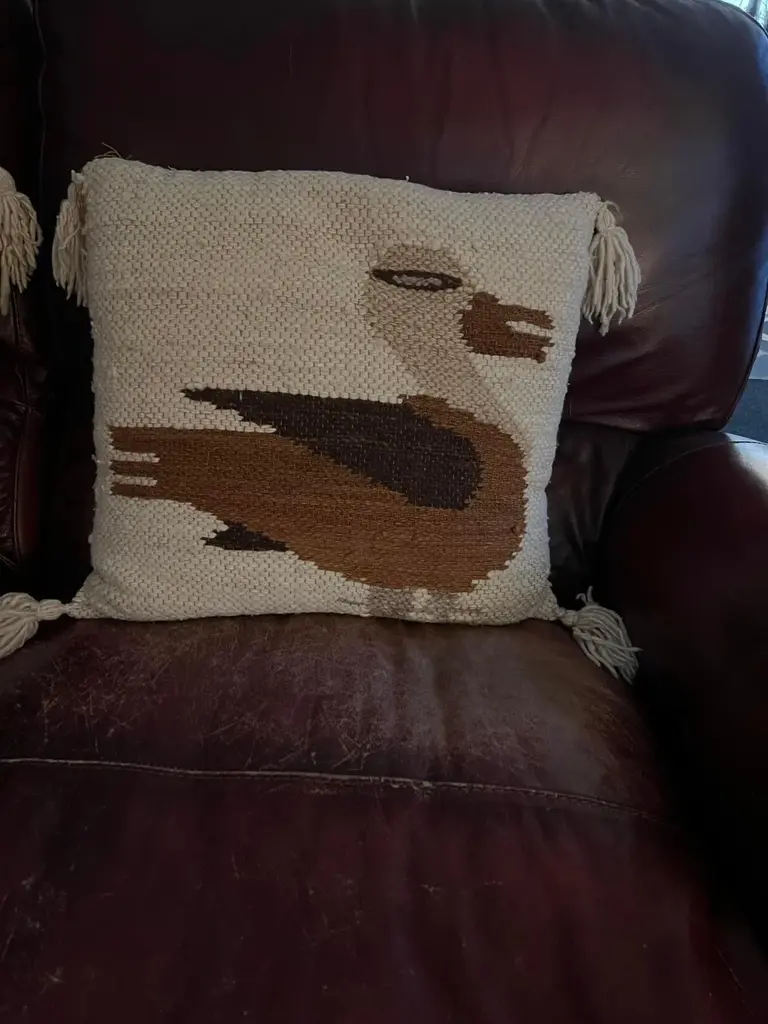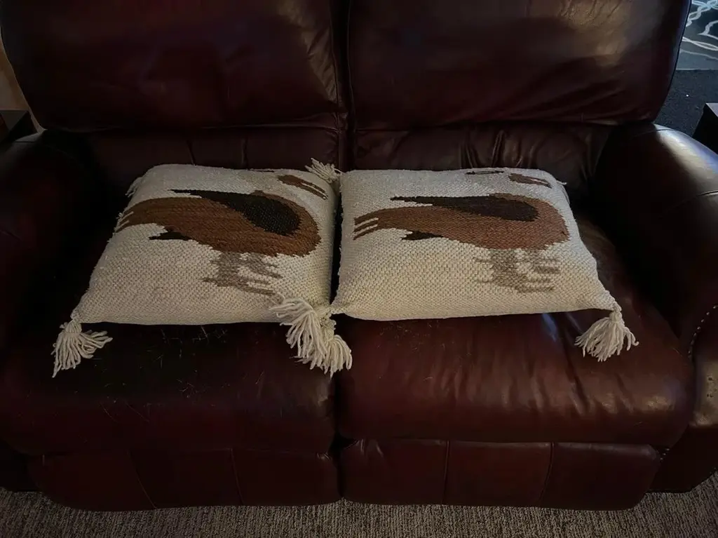 This pair of pillows would nicely accent any mid century or Danish modern home!! Each pillow is hand knit with a picture of a duck on them. Each pillow has a tassel on each corner. Background is cream with shades of brown/tan defining the features of the duck.