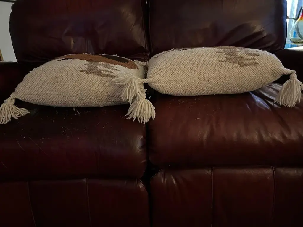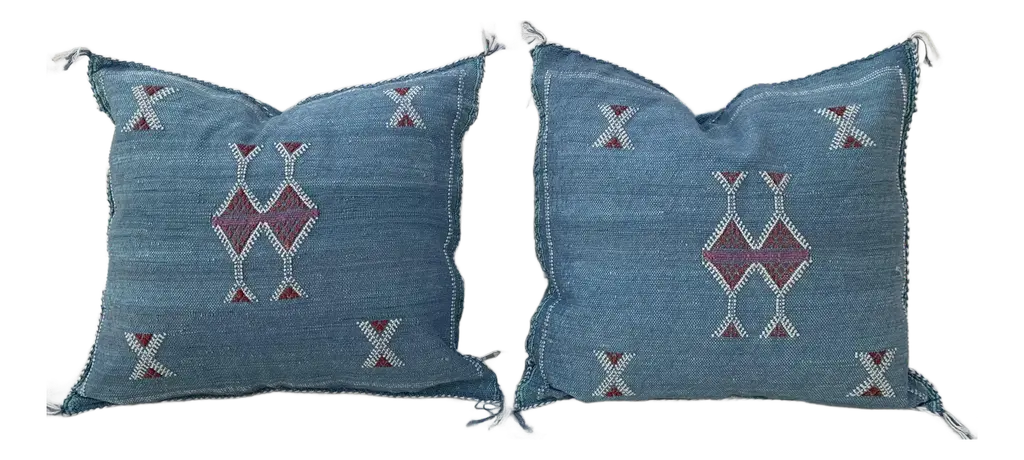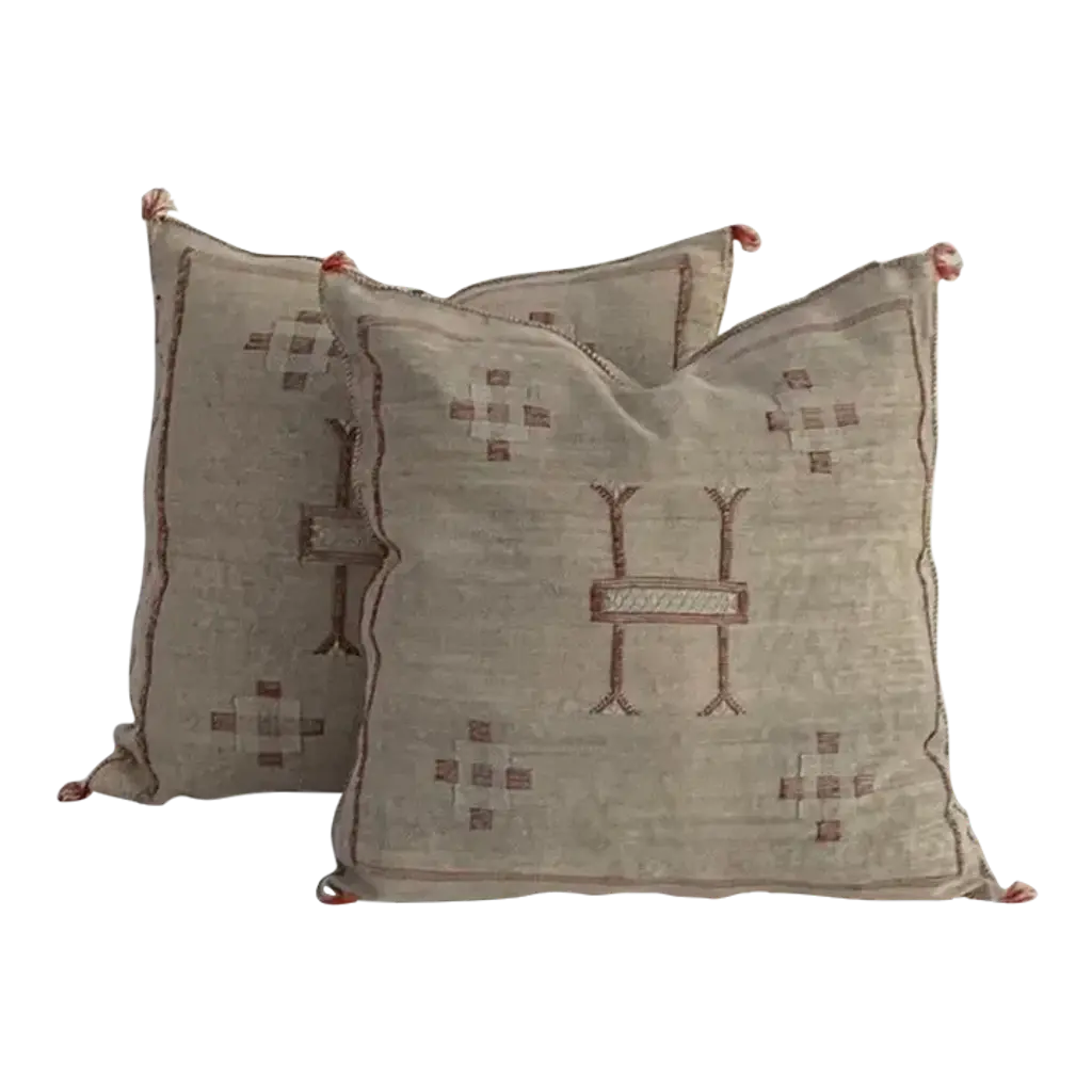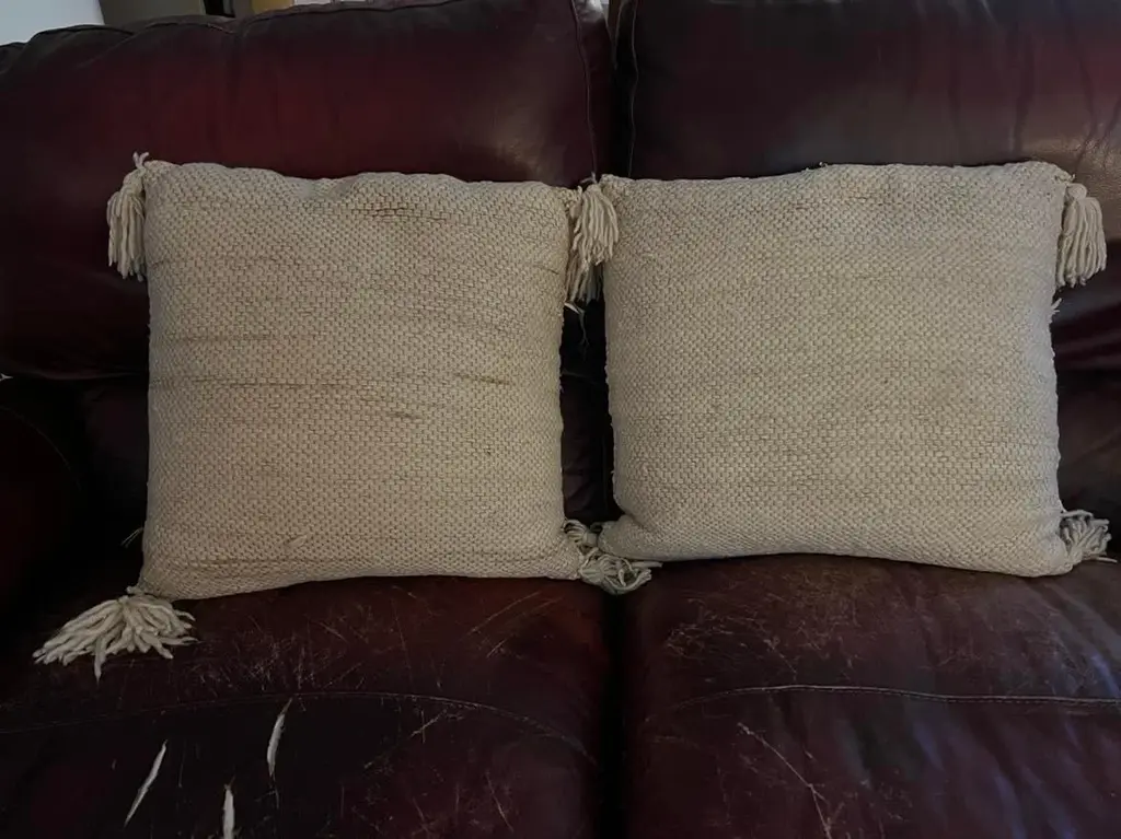 This pair of pillows would nicely accent any mid century or Danish modern home!! Each pillow is hand knit with a picture of a duck on them. Each pillow has a tassel on each corner. Background is cream with shades of brown/tan defining the features of the duck.
