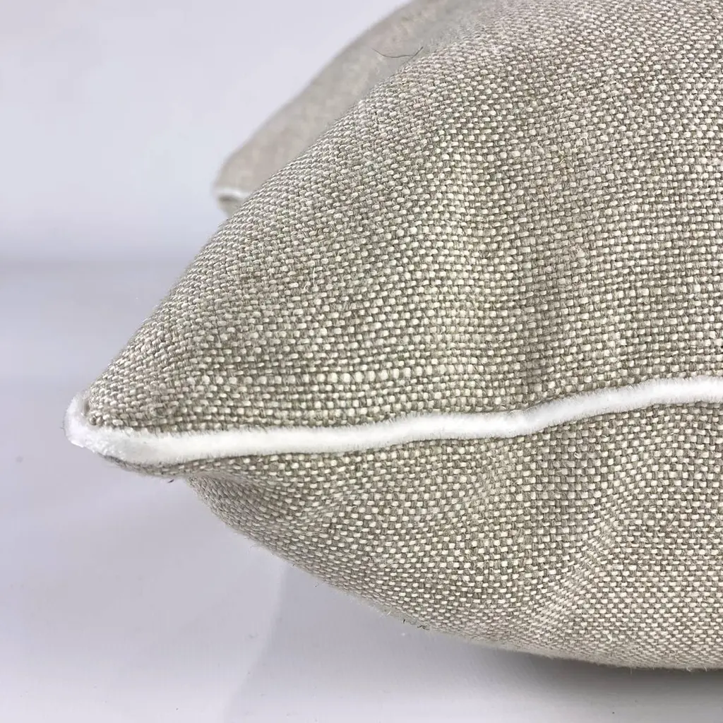 Australian artisan design and craftsmanship, this high-end, vintage linen pillow provides casual luxury fused with contemporary elegance. Showcasing the natural beauty of European linen bringing inviting soft textures to both classic and formal interiors.Trimmed with white velvet piping adds a contemporary flair and completes the luxurious and graceful design of the luxury linen pillows. The premium quality linen showcases the natural luster of flax in a two-tone weave of natural hues, fusing vintage and modern design.Sold as single units, each vintage linen pillow is fitted with a feather insert pillow and can be custom-made to any shape or size to suit your decor project needs. Direct message us for a custom-made linen pillow quote.Features:Col: VintageDimension: 50x50cm, 20x20"Heavyweight European linen Designed & Made in AustraliaFeather cushion insert includedProduct care:Gentle hand wash in cold water. Do not apply chemical agents. Professional Dry clean only.Linen is a natural product and variations may be found within the weave.