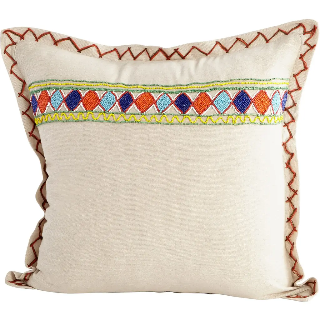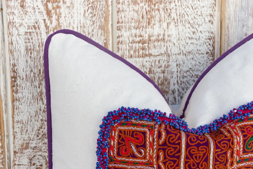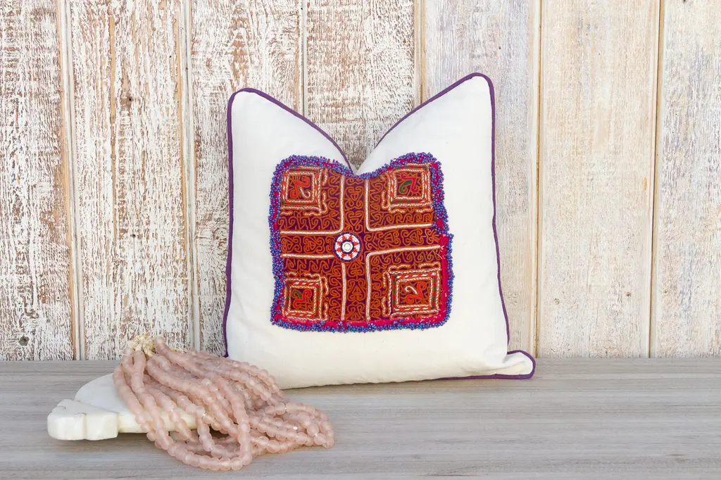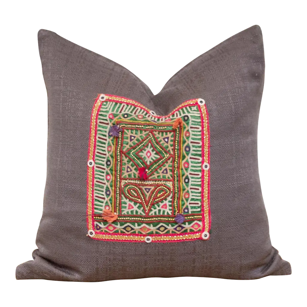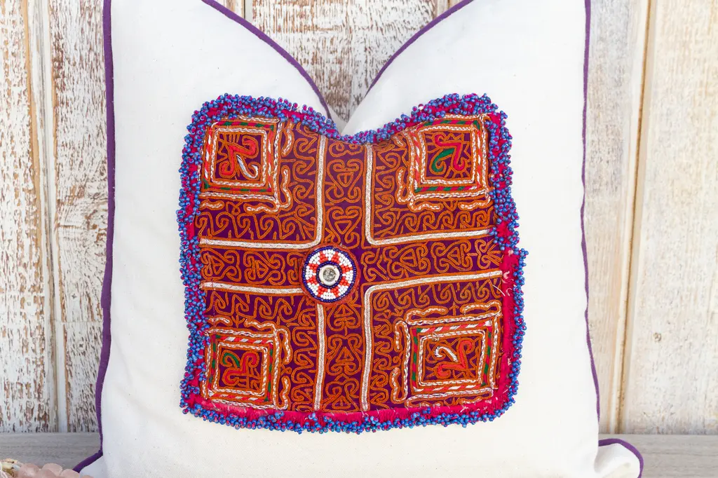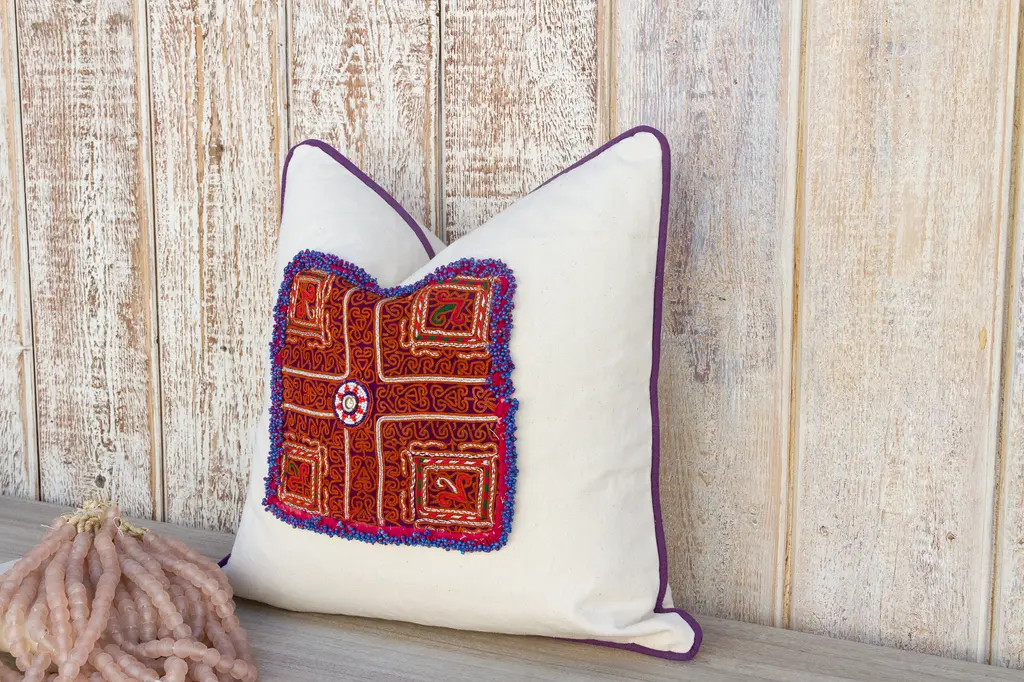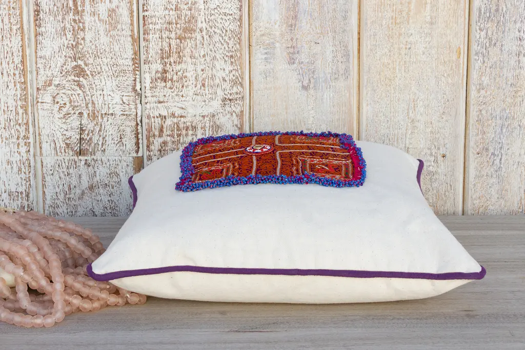 The custom designed Canvas tribal pillow highlights a vintage finely embroidered Odhanis Patch. Odhanis are veils for head and shoulders which identify tribal communities In the Indian desert. Made from canvas with color piping, the pillow will be suitable for indoor or outdoor use. The vintage decorative patch showcases intricate embroidery, stitching and beadwork. Has a back button closure.