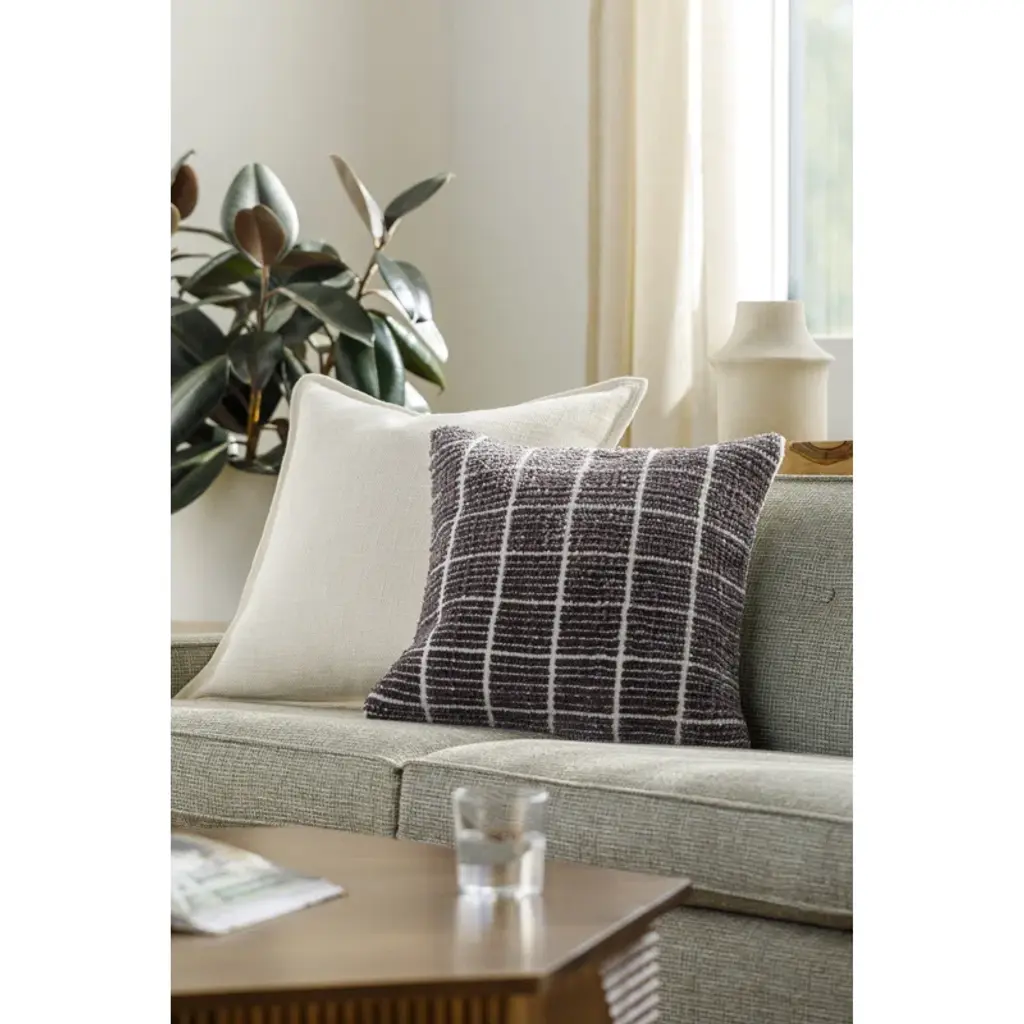 Blocks of dimensional stripes resolve into a subtle grid, adding pattern + texture to the face of this throw pillow. An understated color palette grounds the look in modern minimalism. This pillow arrives with your choice of plush insert secured by a zippered closure – or on its own, ready to dress up your current favorite pillow. Spot clean only with mild detergent to keep it looking fresh.
