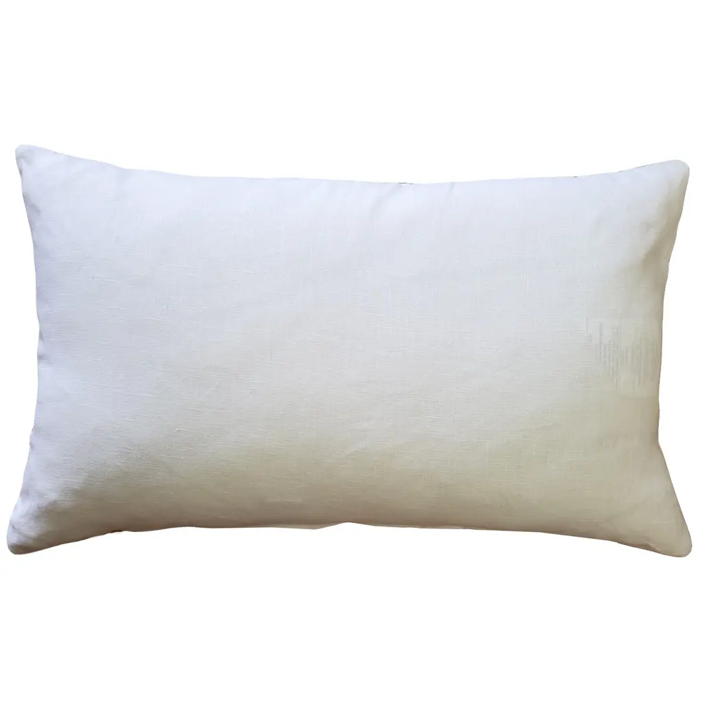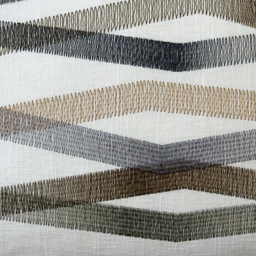 The 12x19 rectangular Wandering Lines Forest Grove Throw Pillow, features an overlapping, embroidered zig zag pattern in shades of olive green, copper, and gray. The white linen-blend fabric gives this pillow a crisp, summery look. A perfect pillow to finish off a bed, window seat or to liven up a sofa. Size: 12"x19" Rectangular Fabric: 50% Linen/35% Cotton/15% Polyester Design on front only. Solid white back. Knife edge seams. Inside seams are serged for strength and durability. Hidden zipper closure in bottom seam of pillow cover Dry Clean Only Made in Canada: Designed and made in Pillow Decor's Vancouver workroom.