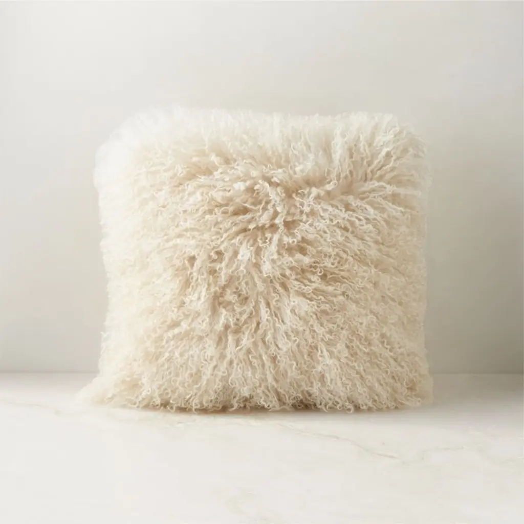 Made from 100% Mongolian natural sheepskin, this remarkably soft warm white throw pillow has enviable natural curl. Since no two are exactly alike, pillows will vary in density and length. Sheepskin pillow flips to a solid warm white cotton back. CB2 pillows include a pillow insert in your choice of feather down or down alternative. CB2 exclusive.