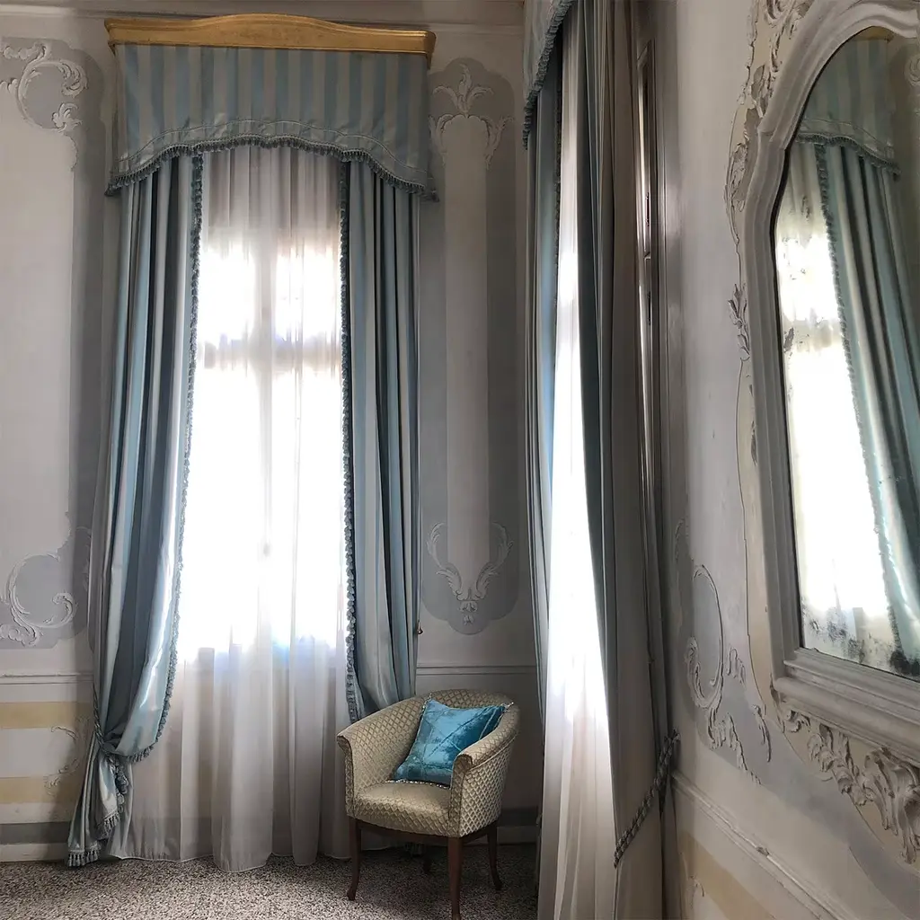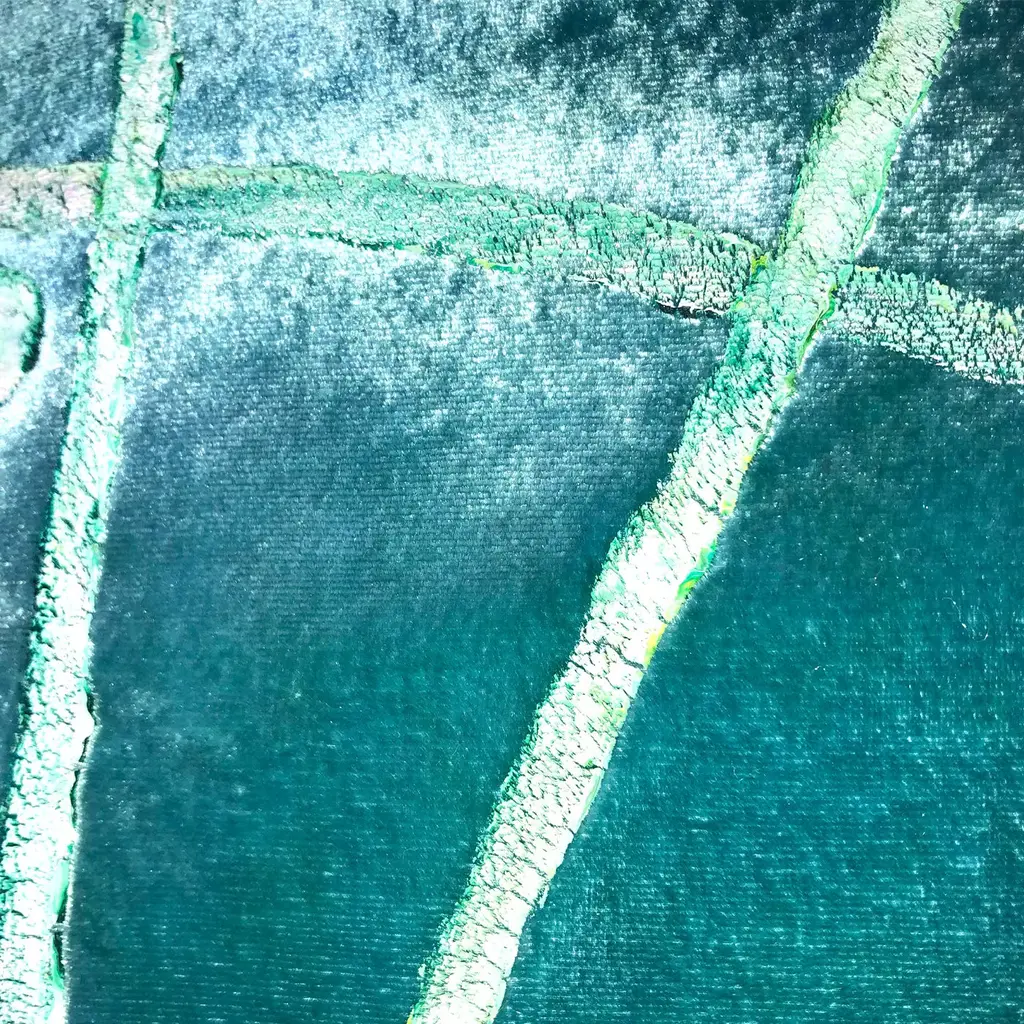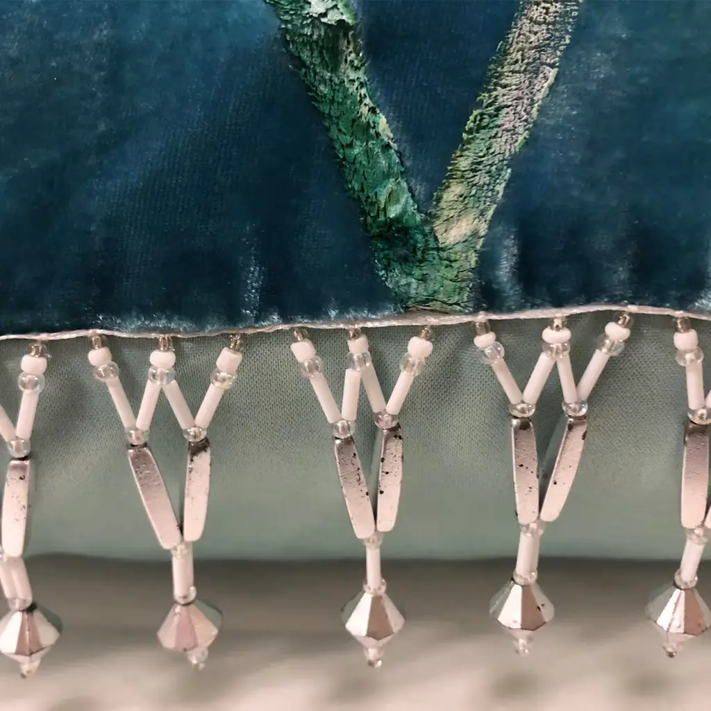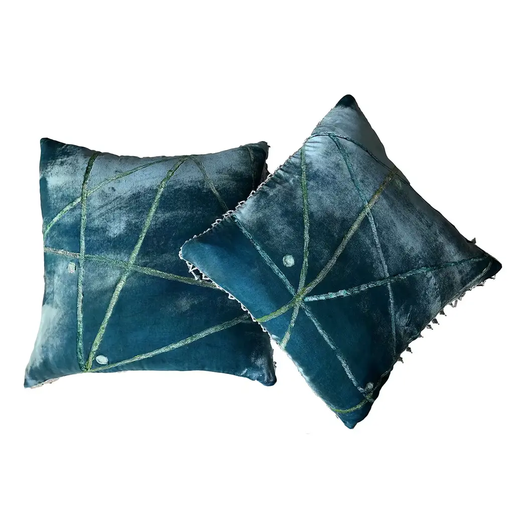 A contemporary velvet cushion with light blue and green color pigments and finished by hand to obtain an elegant marine color. The piece is embellished with an elegant pearl trimming. This cushion will be a sophisticated addition to both a classic living room and a modern study.