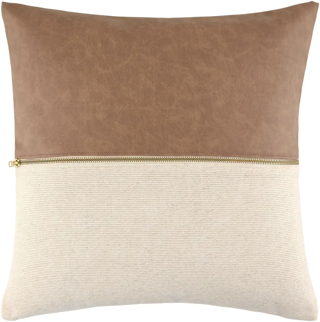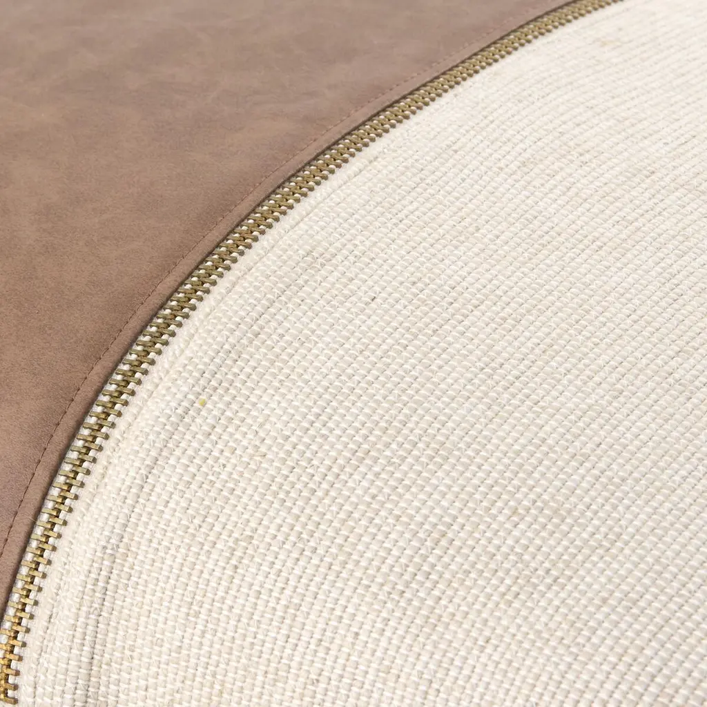 The Waylon accent pillow, designed by Galey Alix, combines classic elements in a fresh way. Crafted from linen, viscose, and vegan leather, its contrasting colors and textures meet in the middle with a classic brass zipper. Available in different color options.