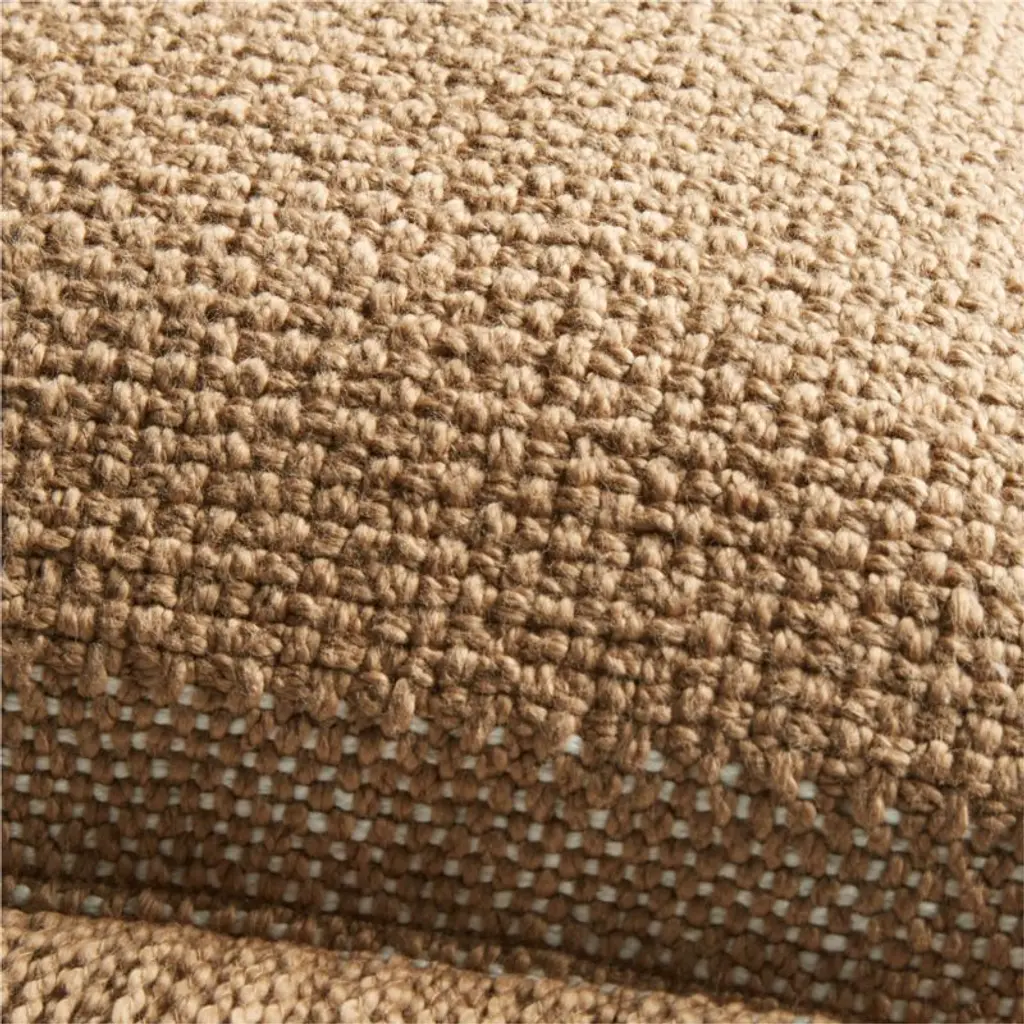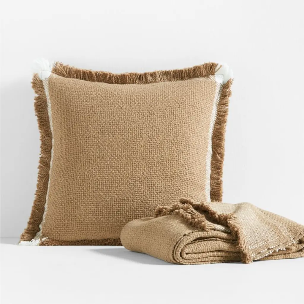 Our camel brown Weekend pillow graces sofas, beds or chairs with rich color, loads of texture and border-stripe detail. White yarn combines with the brown in a flat weave along the edges, framing the seed-stitched pillow in a band of light brown and going solo at the corners to give pops of white to the brushed fringe. We love the organic cotton pillow's well-crafted appeal, achieved by skilled textile artists who put hours into perfecting each pillow. Pair with the matching throw for a coordinated and graphic look. For maximum comfort, our exclusive square pillow includes your choice of a plush feather-down or lofty down-alternative insert.