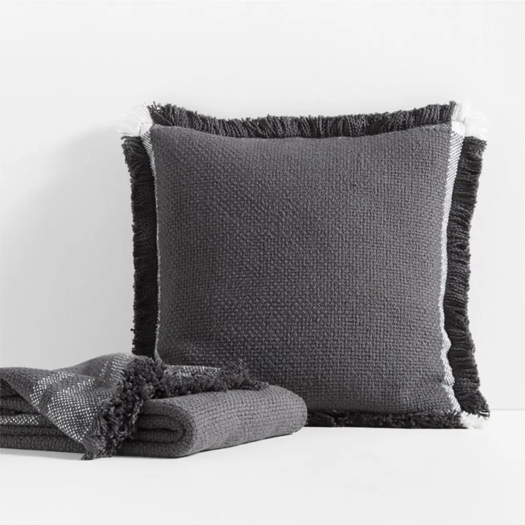 Our grey Weekend pillow graces sofas, beds or chairs with rich color, loads of texture and border-stripe detail. White yarn combines with the dark grey in a flat weave along the edges, framing the seed-stitched pillow in a band of light grey and going solo at the corners to give pops of white to the brushed fringe. We love the organic cotton pillow's well-crafted appeal, achieved by skilled textile artists who put hours into perfecting each pillow. Pair with the matching throw for a coordinated and graphic look. For maximum comfort, our exclusive square pillow includes your choice of a plush feather-down or lofty down-alternative insert.