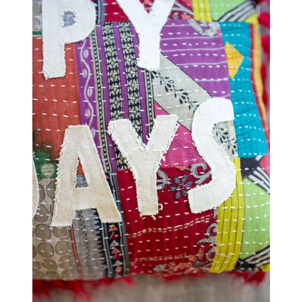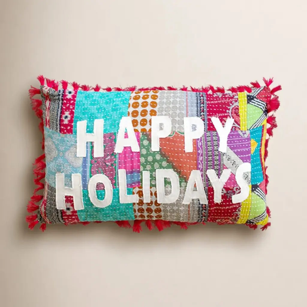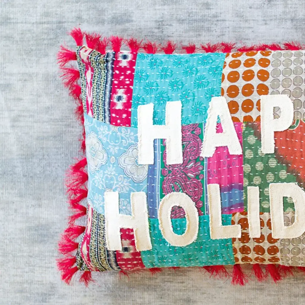 Handmade in India using recycled kantha fabric, our colorful happy holidays pillow is guaranteed to be a comforting addition to your home this holiday season.