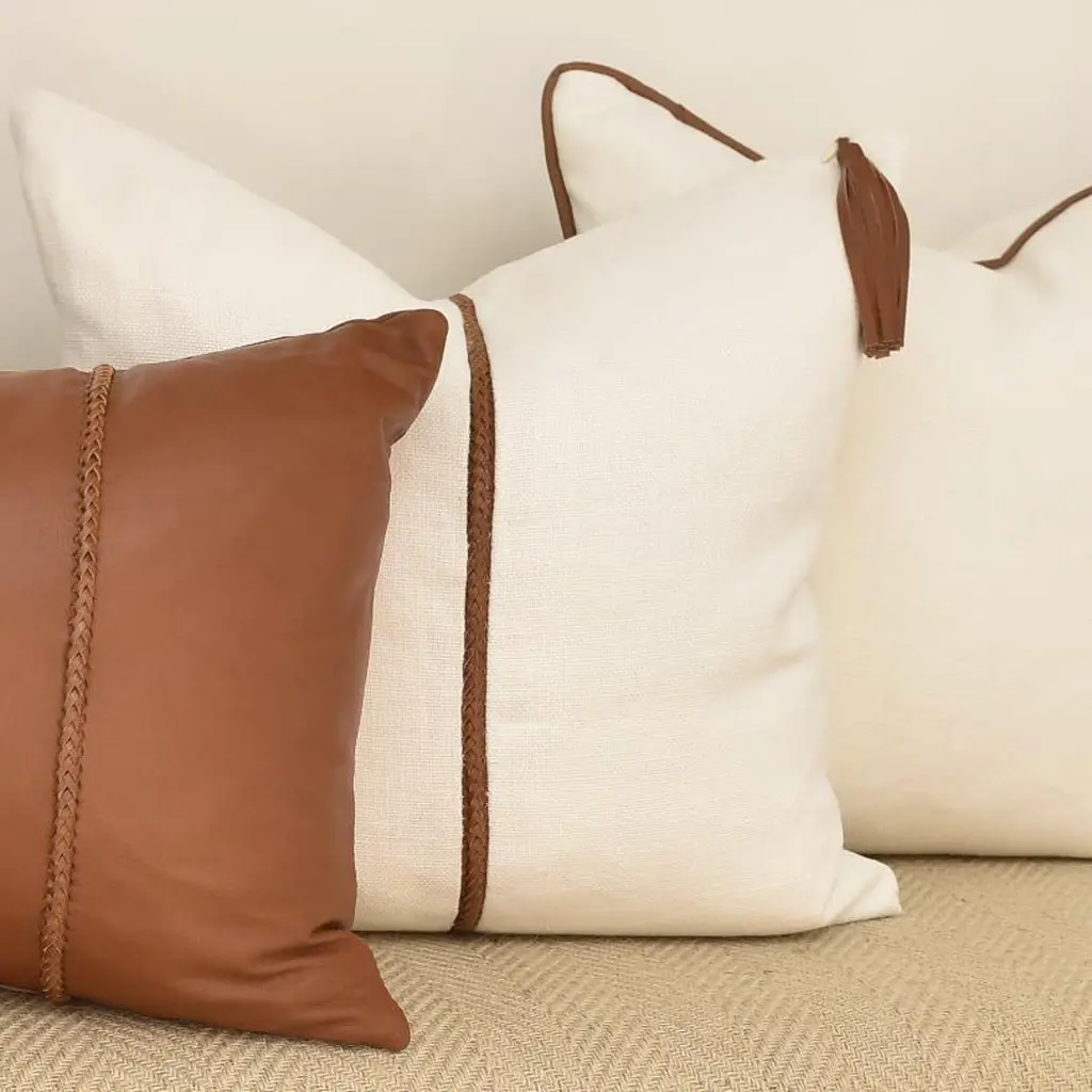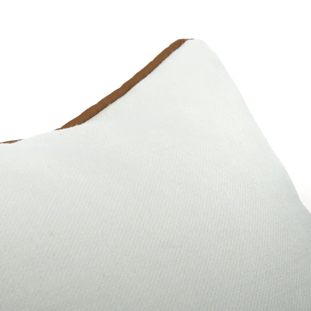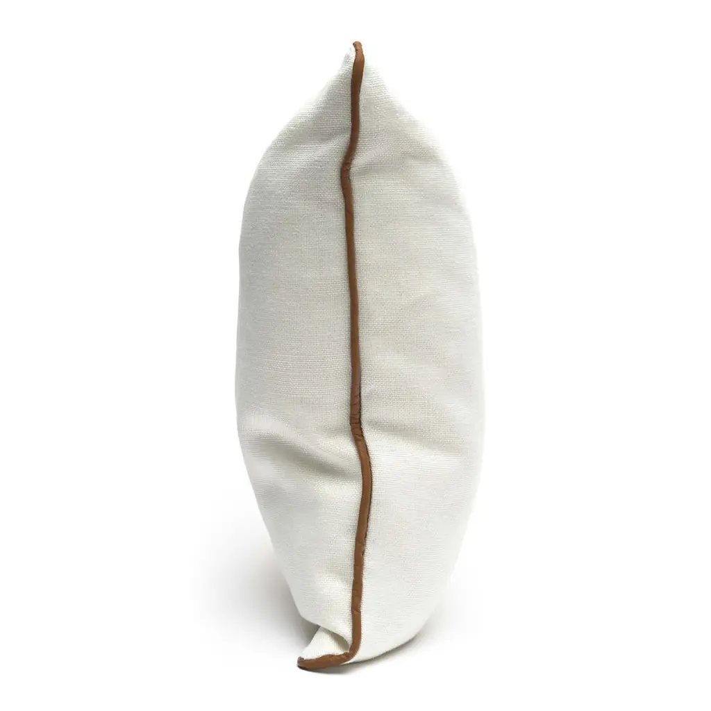 Add refreshing elements to your interiors with this Cabana, linen and leather pillow. A contemporary classic cushion made from 100% upholstery, textured linen trimmed with Italian tan leather edging that adds an elegant contrast to the design. Australian designer, Emily Barbara has used the combination of leather and linen capturing the beauty of styling with natural textures, while minimizing greatly the usage of synthetic fibers in her collection.The natural white linen pillow elevates the luxury and elegance of a room, whether styled on its own or mixed with other Cabana and cross stitch cushions from its linen and leather cushion range.Individually handcrafted in Australia by leather artisans, each pillow comes double sided in the natural white linen, has an invisible zipper closure and is fitted with a 100% feather insert completing the luxurious natural living comfort of this linen and leather cushion. Samples:Designer, Emily Barbara works closely with her clients needs, offering linen and leather swatches to assist them individually on their styling projects.Custom Make:Each linen cushion is individually-crafted by leather artisans making each order unique and personal. If you require a variation in size or leather color, please contact us with your details.Features:Color: natural white linen / tan leatherDimensions: 45 x 45cm100% textured upholstery linenLeather piped edgeInvisible Zipper closureFeather insert includedMade in Australia.