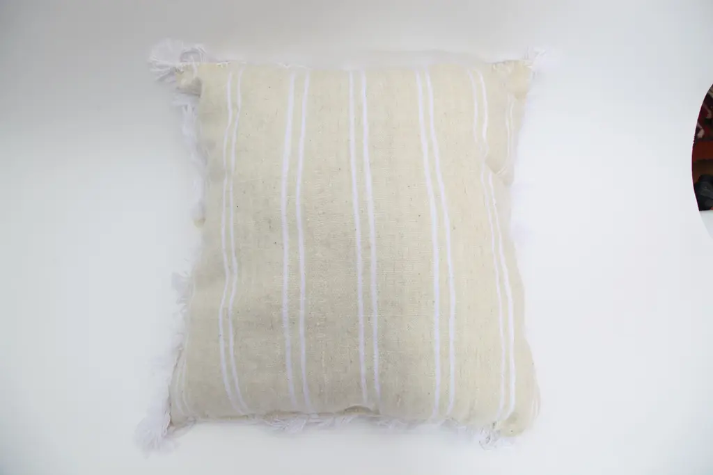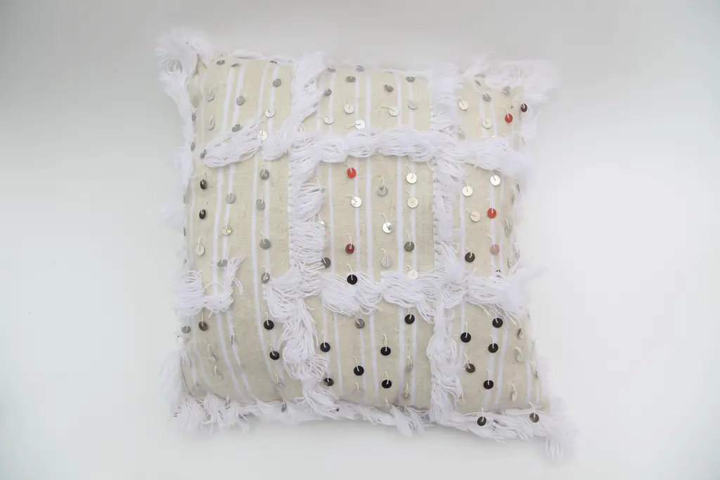 Hand-woven by Berber women in the Azilal region of Morocco. Made in the Boucherouite style of recycled vintage fabrics and unique color schemes. Embellished with sequins and featuring lovely fringed edges. Seller has multiples available, listing is for a single pillow. Please use the "Ask a Question" feature if interested in more than one.