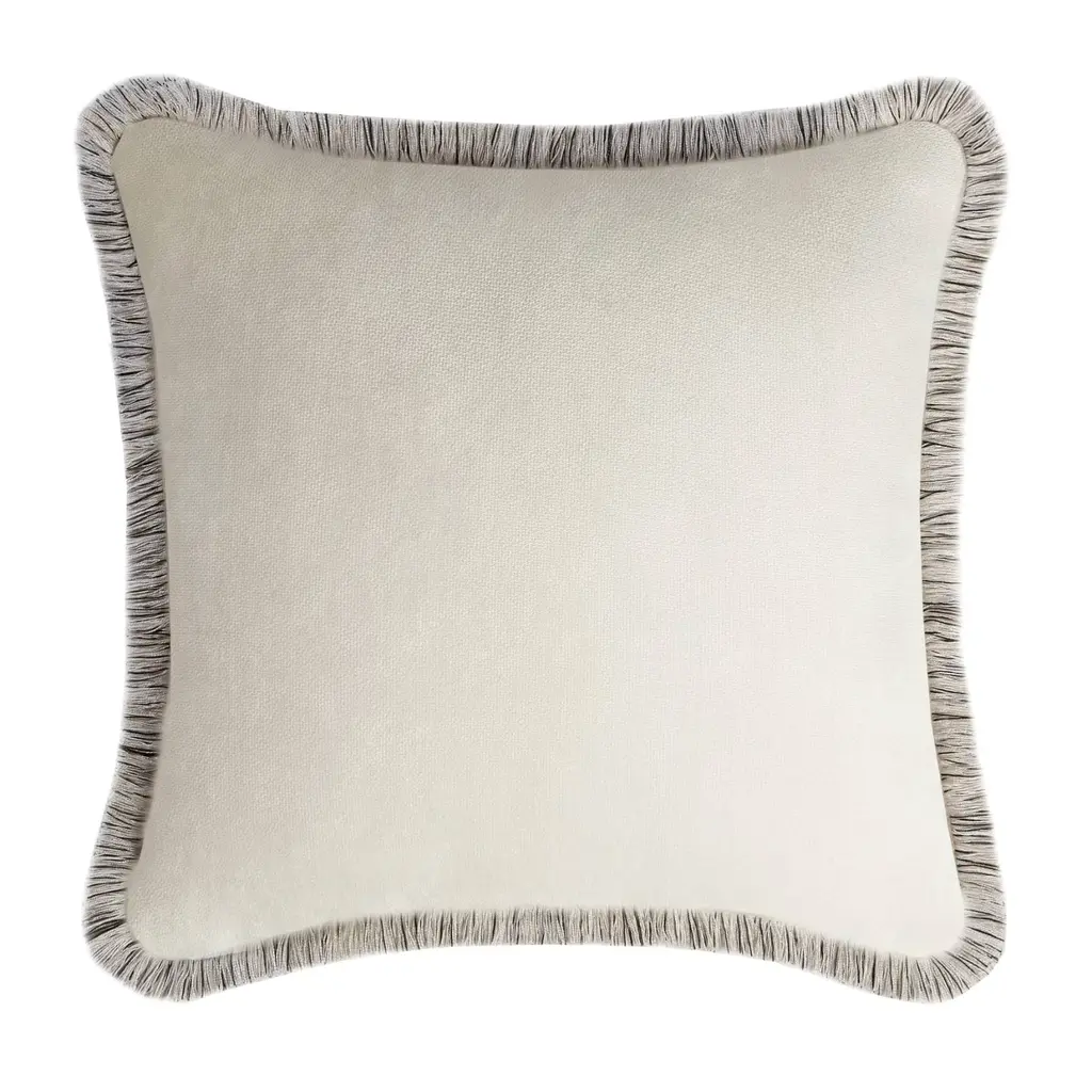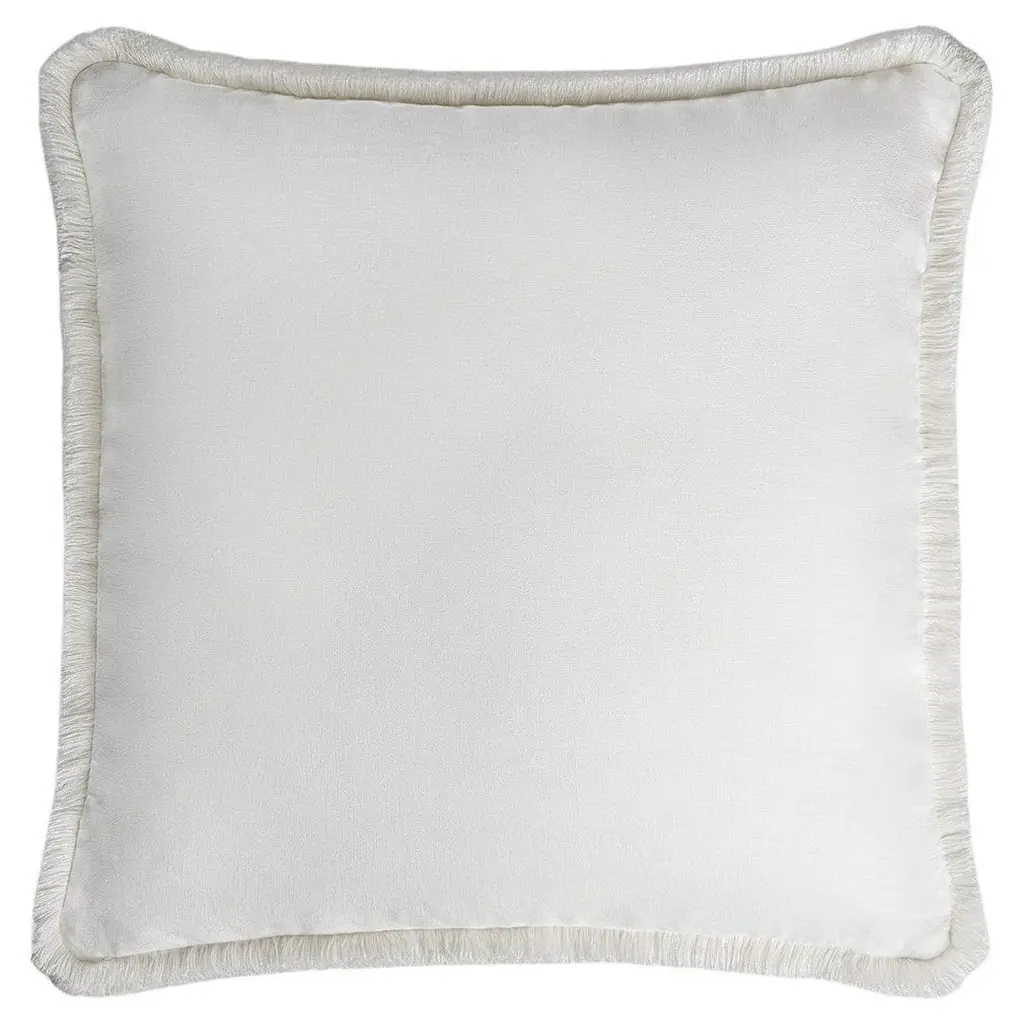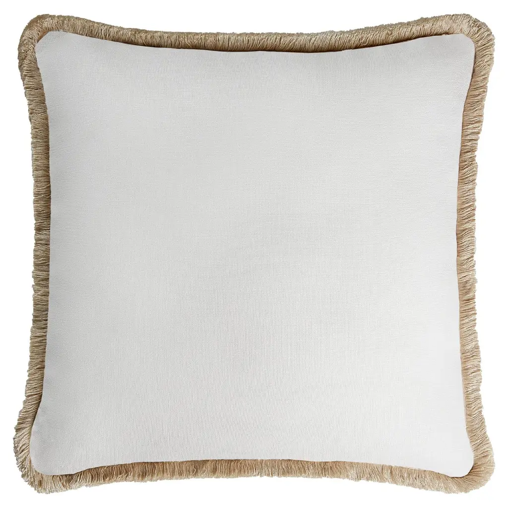 White With Gray Fringes Happy Linen Cushion