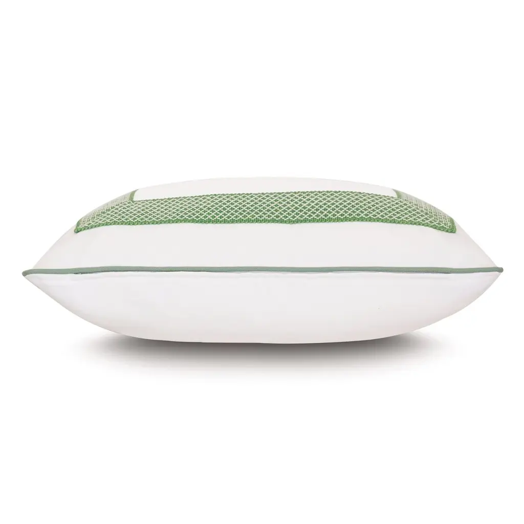 Designed by us and available only at One Kings Lane: With its trellis-pattern embellishment and crisp green welting, this bolster pillow is certain to enliven your patio, porch, or sunroom. Because it's made with fade-resistant, easy-to-clean performance fabric designed to withstand the elements, you'll be able to enjoy it now and for seasons to come. Solid back. Hidden zipper closure. Insert included.