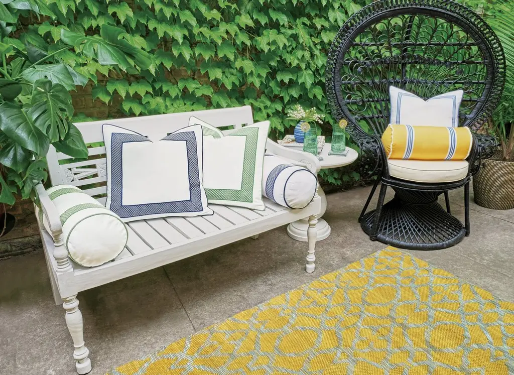 Designed by us and available only at One Kings Lane: With its trellis-pattern embellishment and crisp navy welting, this bolster pillow is certain to enliven your patio, porch, or sunroom. Because it's made with fade-resistant, easy-to-clean performance fabric designed to withstand the elements, you'll be able to enjoy it now and for seasons to come. Solid back. Hidden zipper closure. Insert included.
