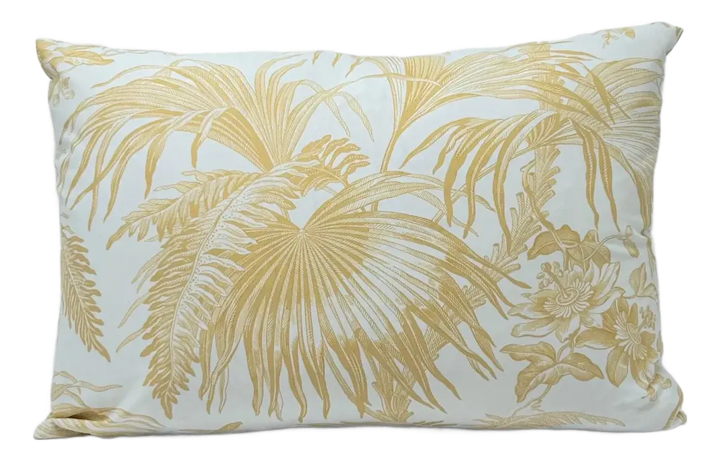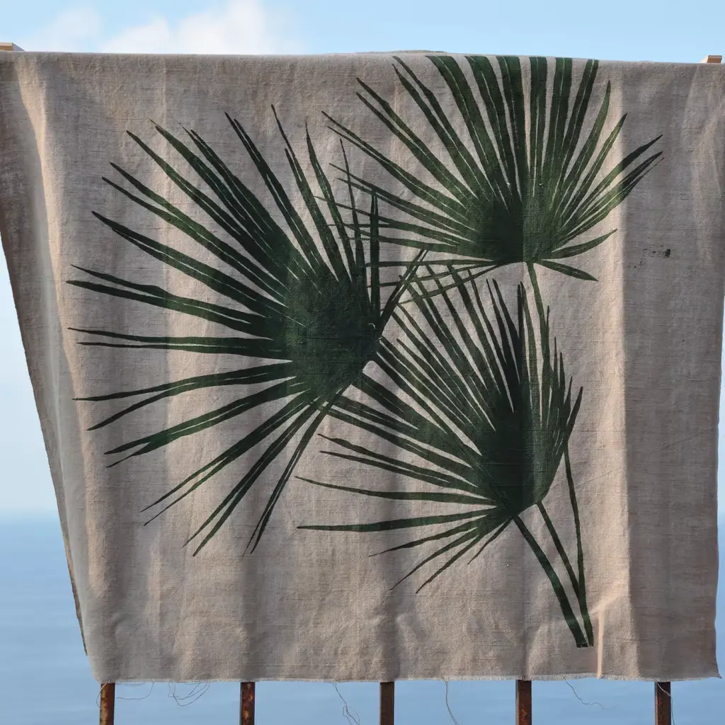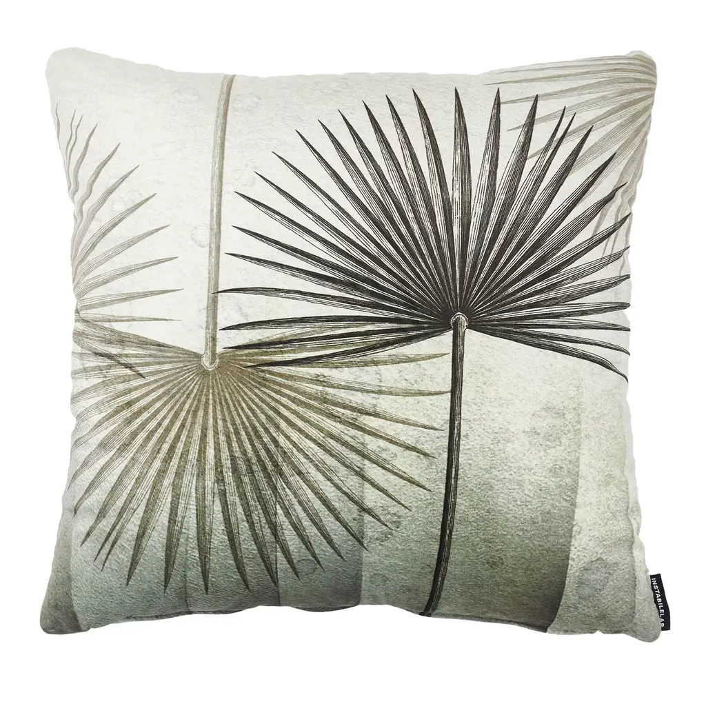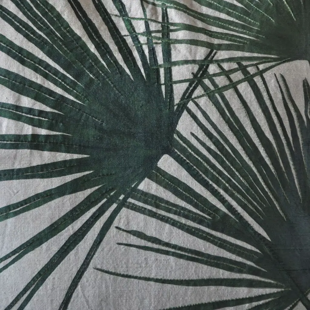 Windmill Palm cushion is part of the Giardino collection. Finely hand painted and embroidered on Linen. Velvet piping. Silk lining. Back of the cushion can be in different material. Limited edition. Giardino is a collection inspired by the beauty and grace of flowers. The spirit of the collection is to create a blend between images from Italian countryside and British gardens. Flowers, plants, leaves are reinvented and interpreted in a modern and creative way.