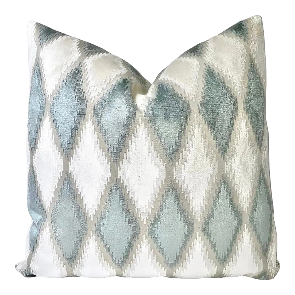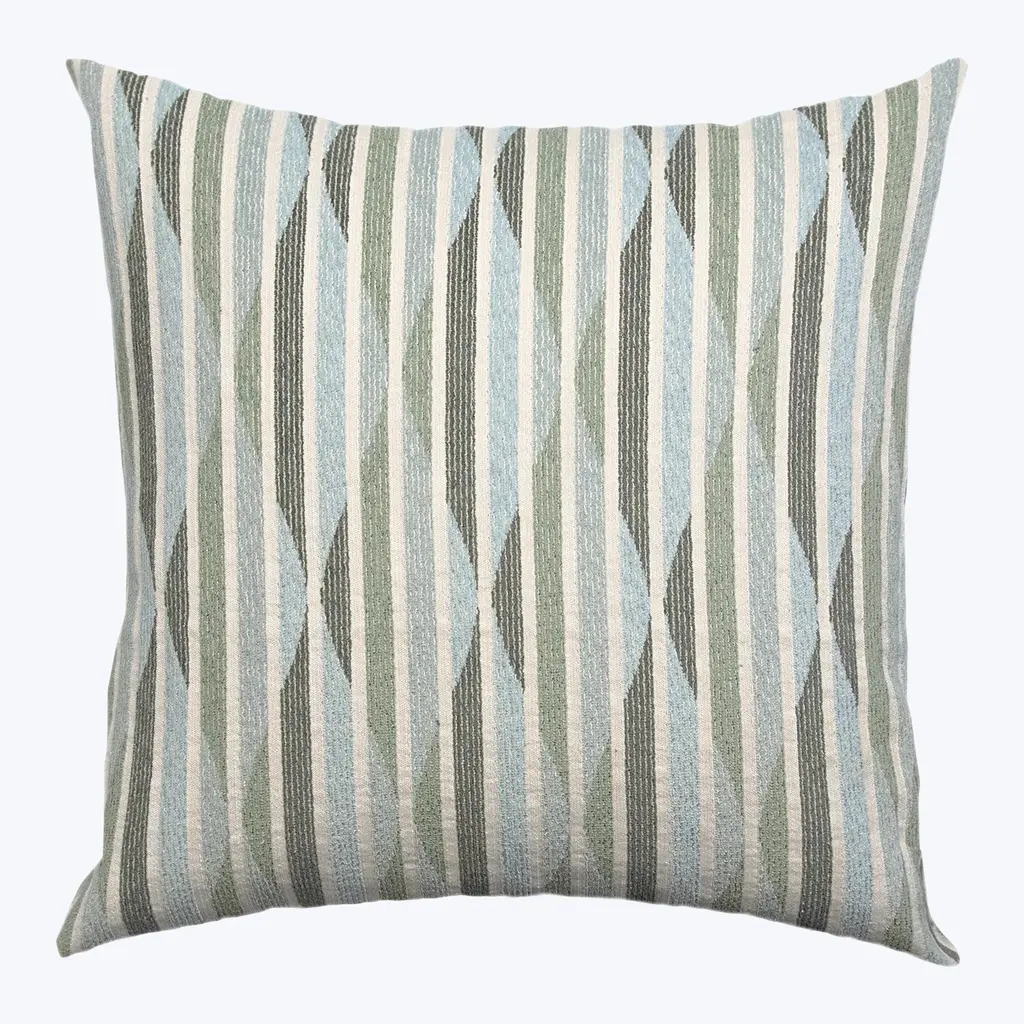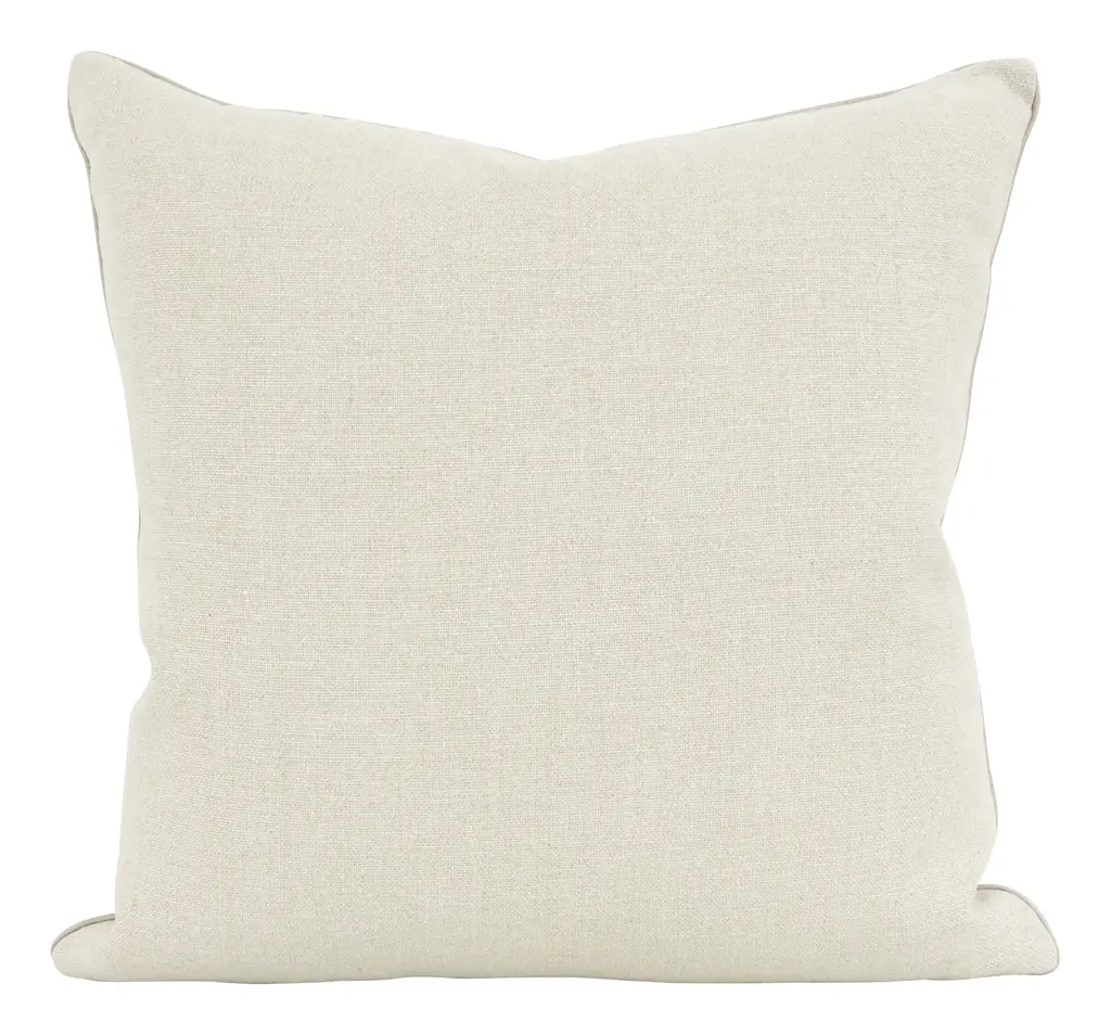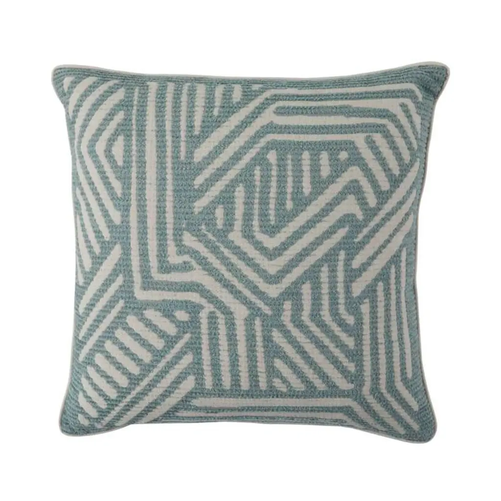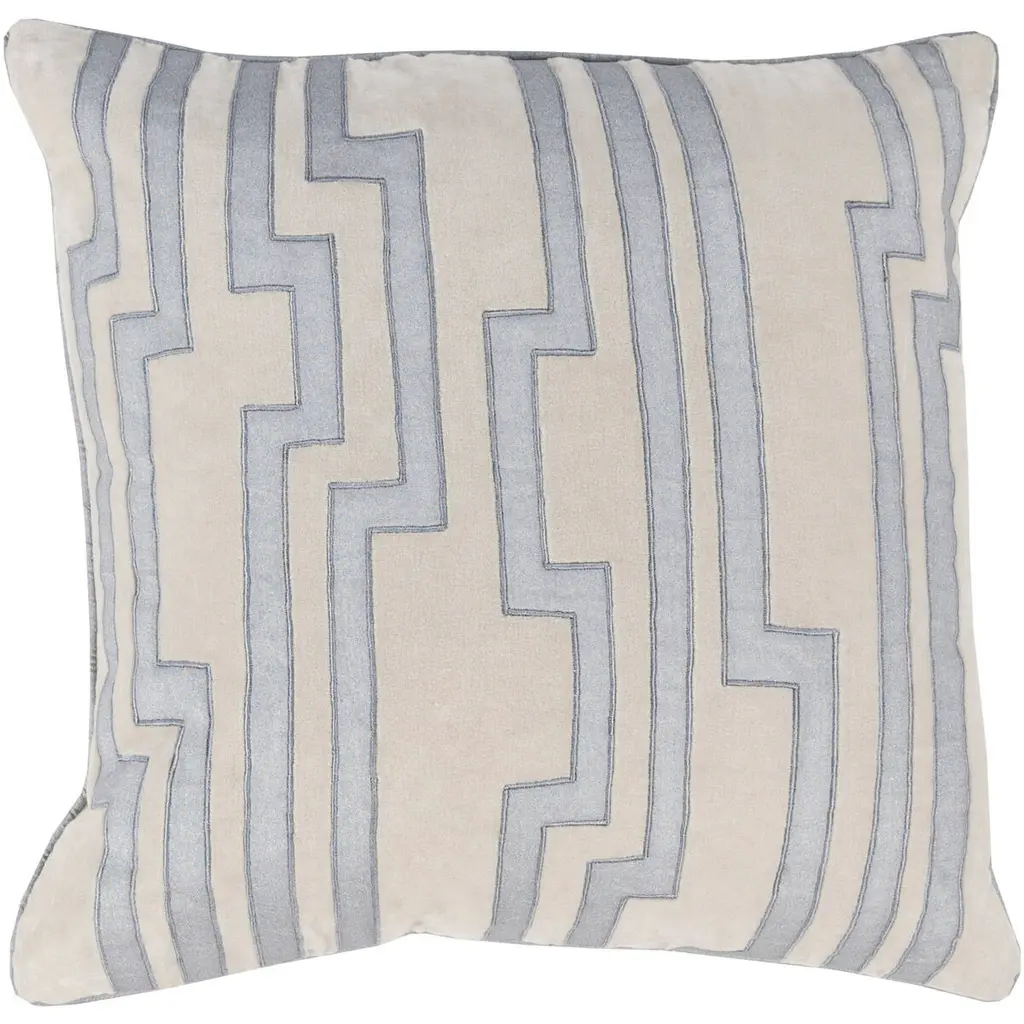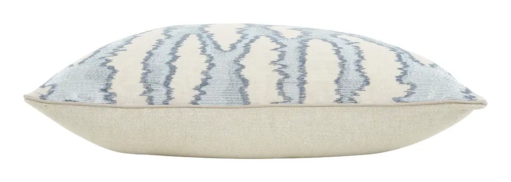 With its cool, neutral palette, subtle metallic sheen and abstract motif, our Winslow Pillow would make a welcome addition to any fresh, modern space. This lovely layer features a solid, cream-colored ground, which has been embroidered with shimmery, pale blue thread to create a series of biomorphic shapes with wavering lines for a ripple-like effect. It’s finished with a neutral linen backing fabric, matching cream-colored silk piping, a hidden zipper closure and a luxe down and feather pillow insert for a plush feel. Great sitting solo or mixed in with other pillows and blankets in similar hues, Winslow is the perfect finishing touch for a chic, sophisticated living room or a serene bedroom retreat. •cotton and linen blend front •viscose embroidery •neutral linen backing •neutral silk piped edges •hidden zipper closure •down and feather insert Dimensions •22" x 22"