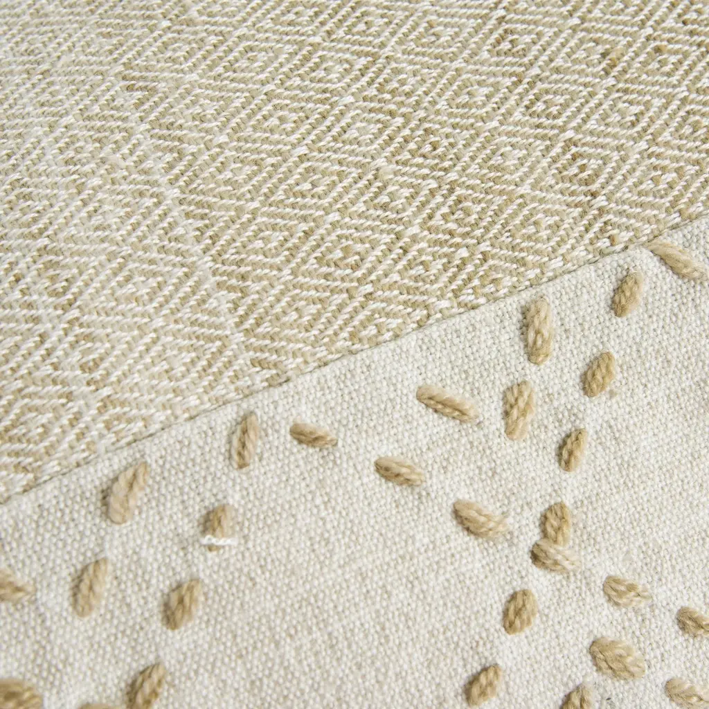 Add some flare to your decor with this modern, industrial, multi-stranded accent pillow. This 20 X 20 100% poly-pet woven pillow features a transitional two-tone diamond weaving pattern in a modern craft-inspired design. Accented with a heavy-stitched multi-strand Kantha stitch, this stylish piece is framed with four corner tassels of recycled materials for an eye-catching contrast. The back side of this accent pillow has a solid coordinating color block design with a hidden zipper closure. Topped with shades of khaki and ivory, this is the perfect pillow for adding a chic and sophisticated touch to any décor, and versatile enough for both indoor and outdoor use.
