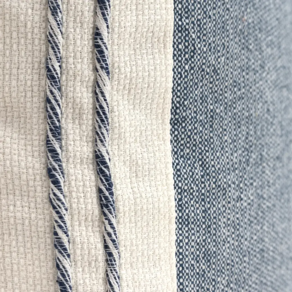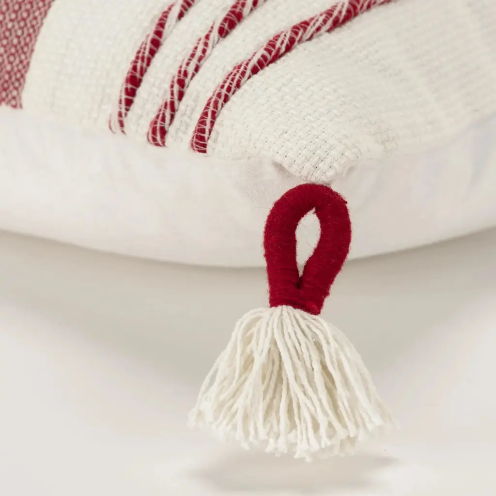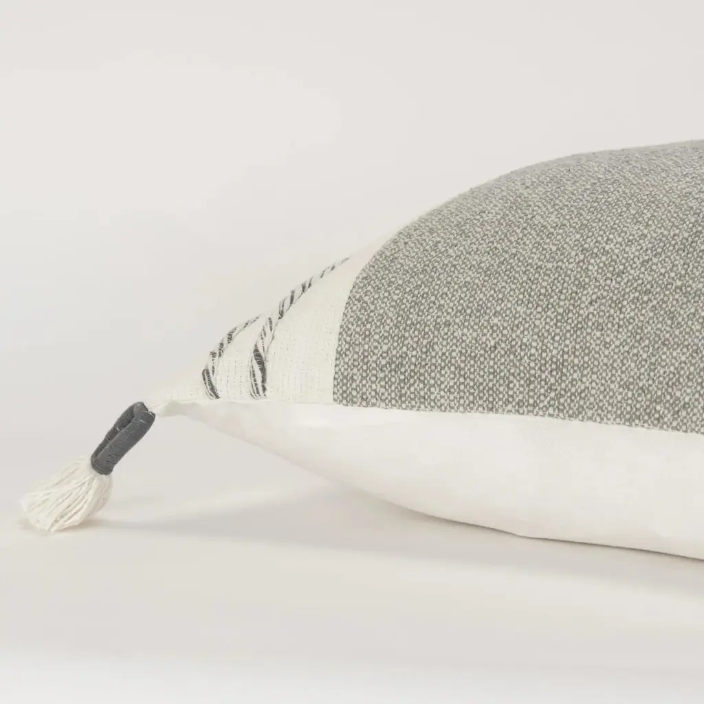 This color blocked; knife-edged pillow is composed of two distinct fabrics. The central panel is a two-color weave allowing both colors a voice. The side panels are an in and out cotton solid weave with a contrasting texture to the center panel. These side panels are embellished with twisted coordinating cotton cord that is applied to that white side panel with a sheer threading keeping it secure with use but not distracting from the overall appeal of the pillow. Four looped hand tied corner tassels grace this pillow- their banding matches the color in the weave and twisted yarn accent patterning. This pillow features a solid coordinating cotton back with a hidden zipper closure for ease of fill. 100% Cotton