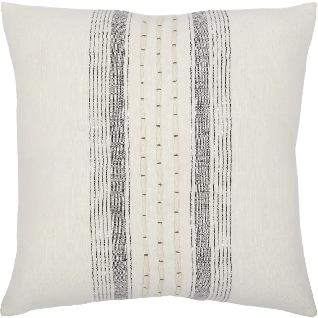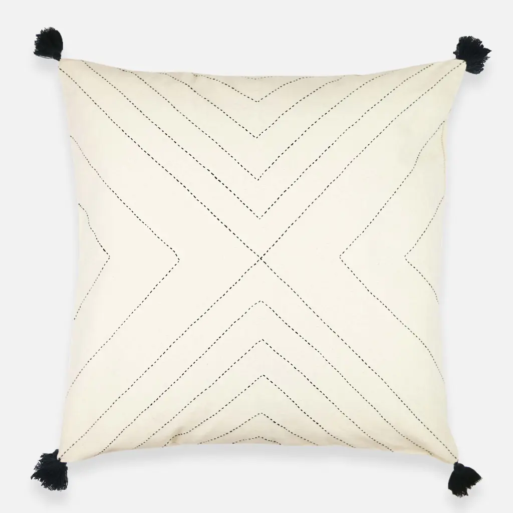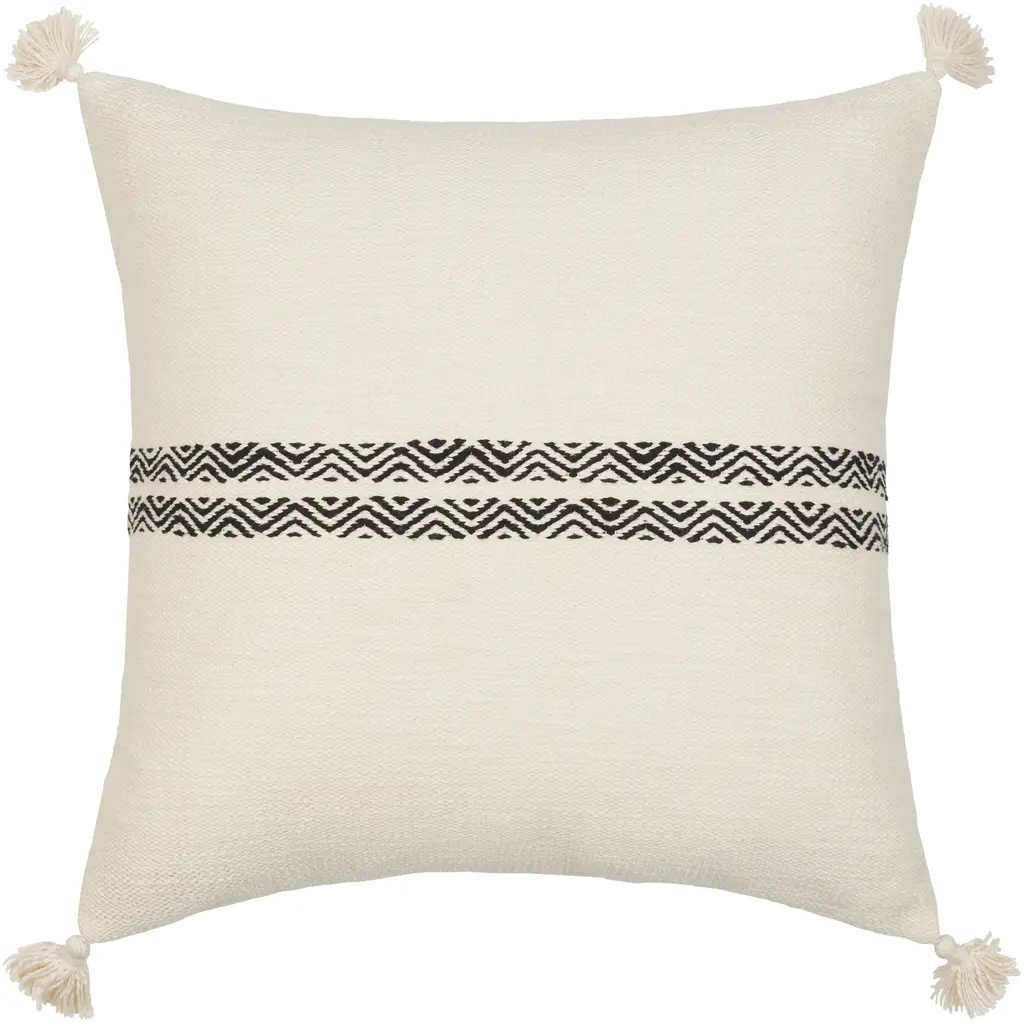 This color blocked; knife-edged pillow is composed of two distinct fabrics. The central panel is a two-color weave allowing both colors a voice. The side panels are an in and out cotton solid weave with a contrasting texture to the center panel. These side panels are embellished with twisted coordinating cotton cord that is applied to that white side panel with a sheer threading keeping it secure with use but not distracting from the overall appeal of the pillow. Four looped hand tied corner tassels grace this pillow- their banding matches the color in the weave and twisted yarn accent patterning. This pillow features a solid coordinating cotton back with a hidden zipper closure for ease of fill. 100% Cotton