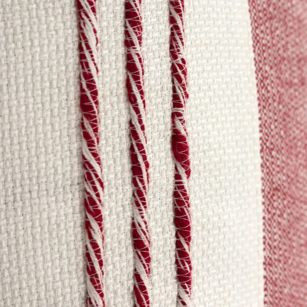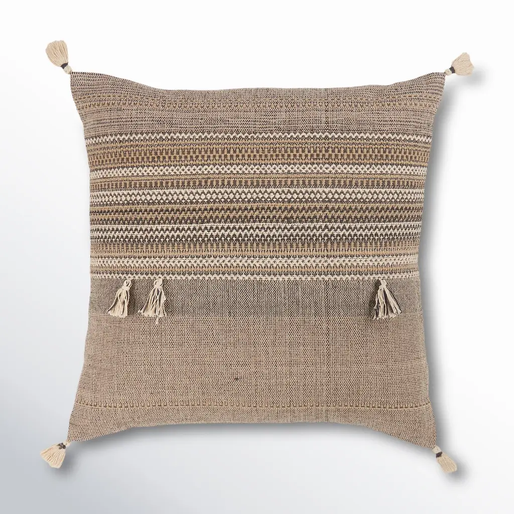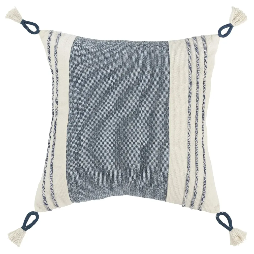 This color blocked; knife-edged pillow is composed of two distinct fabrics. The central panel is a two-color weave allowing both colors a voice. The side panels are an in and out cotton solid weave with a contrasting texture to the center panel. These side panels are embellished with twisted coordinating cotton cord that is applied to that white side panel with a sheer threading keeping it secure with use but not distracting from the overall appeal of the pillow. Four looped hand tied corner tassels grace this pillow- their banding matches the color in the weave and twisted yarn accent patterning. This pillow features a solid coordinating cotton back with a hidden zipper closure for ease of fill. 100% Cotton