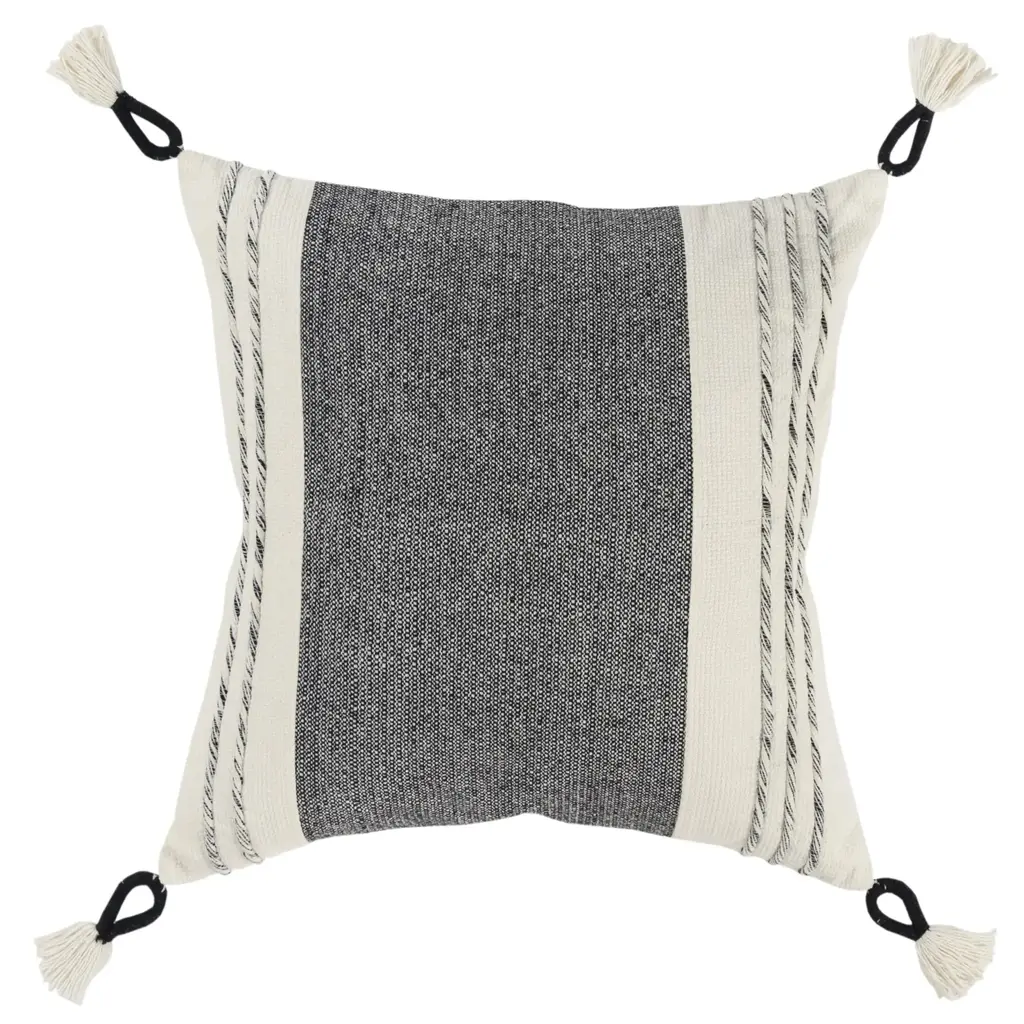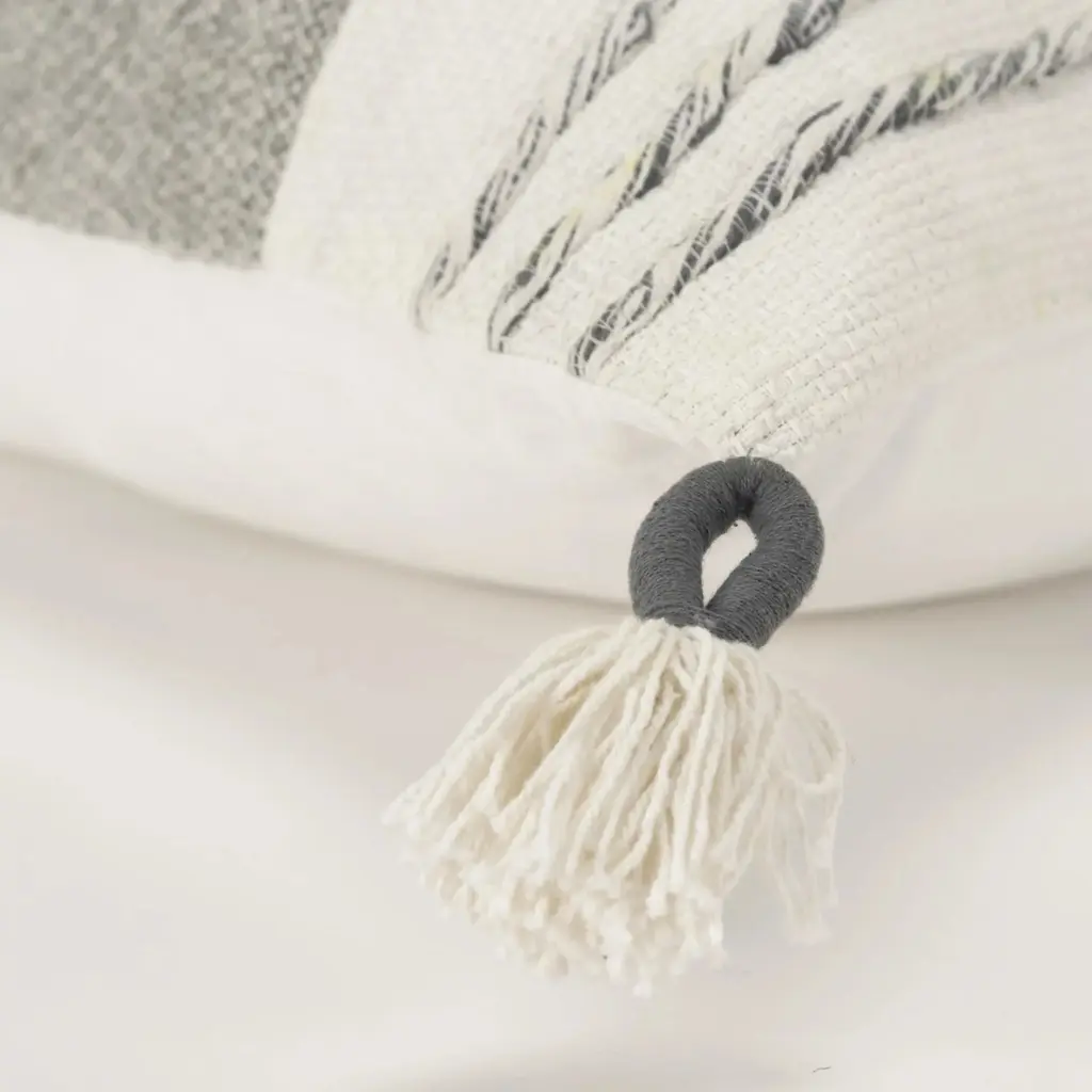 This color blocked; knife-edged pillow is composed of two distinct fabrics. The central panel is a two-color weave allowing both colors a voice. The side panels are an in and out cotton solid weave with a contrasting texture to the center panel. These side panels are embellished with twisted coordinating cotton cord that is applied to that white side panel with a sheer threading keeping it secure with use but not distracting from the overall appeal of the pillow. Four looped hand tied corner tassels grace this pillow- their banding matches the color in the weave and twisted yarn accent patterning. This pillow features a solid coordinating cotton back with a hidden zipper closure for ease of fill. 100% Cotton