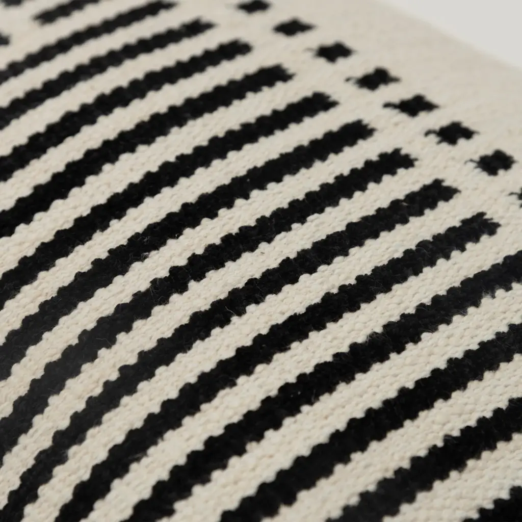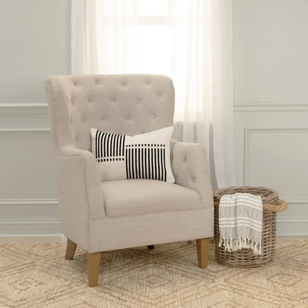 This 14" x 20" accent pillow brings together the best of modern industrial and ultramodern design elements. Constructed in a cotton and rayon blend, this woven pillow is both ultra soft and super durable, perfect for lounging on your couch or adding an extra layer of comfort and trendy design to your bedding ensemble. The knife edged pillow is crafted with cotton chenille woven in as a color element, giving it a textural offset stripe block design that adds a touch of sophistication to your space. The coordinating solid back with hidden zipper closure allows for easy removal and cleaning. This accent pillow features a classic colorway of natural and black that is both elegant and on-trend. The stark contrasting tones creates a clean and modern design that will elevate the look of any room in your home.