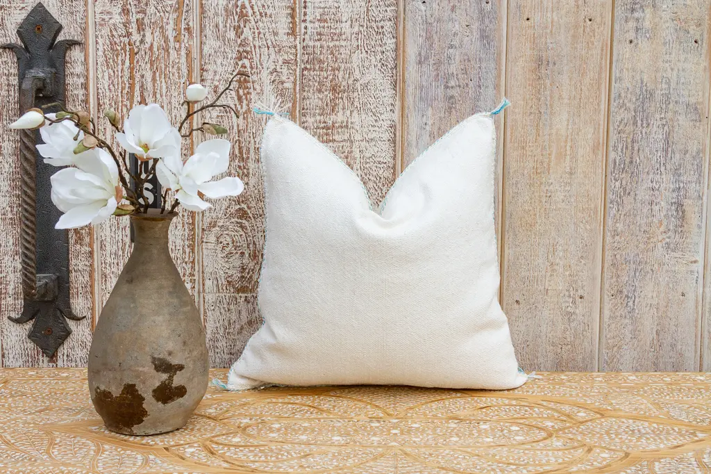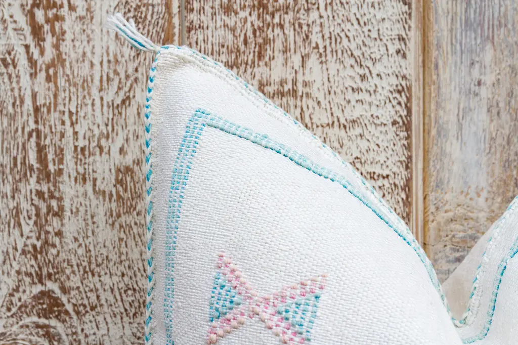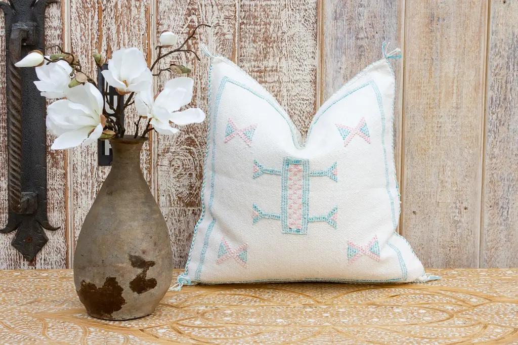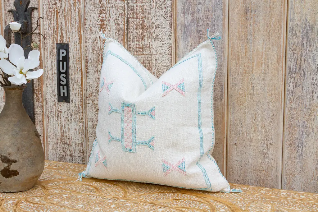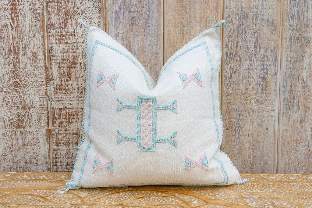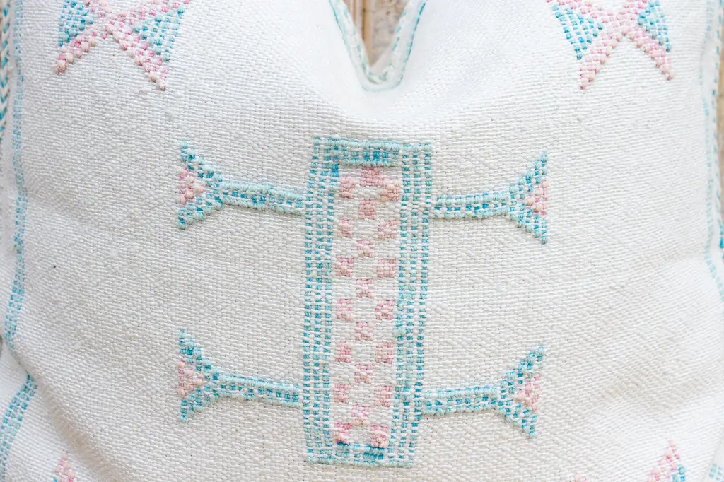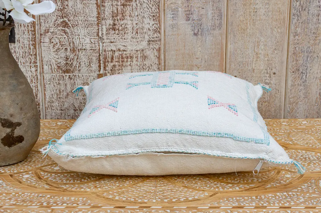 This gorgeous pillow is entirely hand-woven from silk that comes from a Sabra cactus plant. Every pillow is beautifully embroidered with a unique tribal motif that varies from every other pillow. Each pillow is dyed using vegetable dye using a special hand dying technique that gives each one their own lovely faded and beautifully aged colors. This pillow has a zipper closure, down blend insert is included.