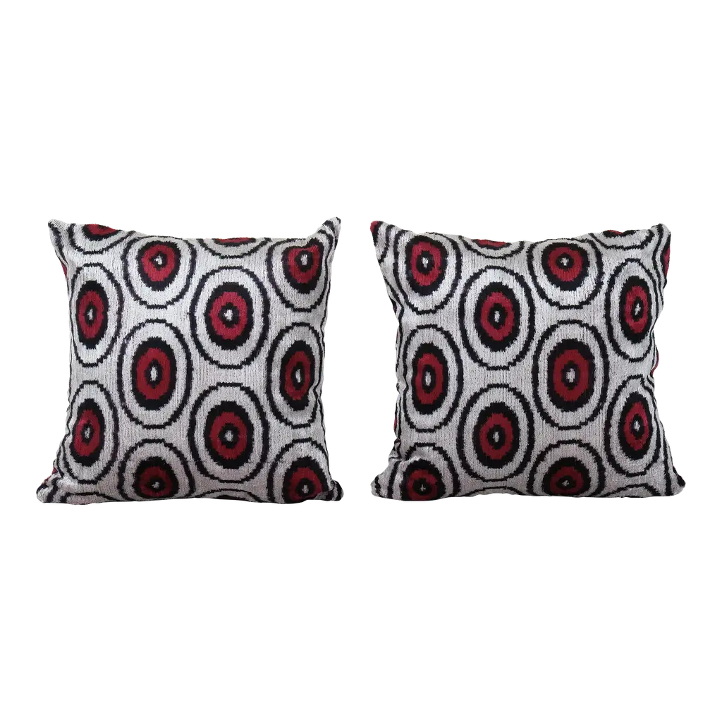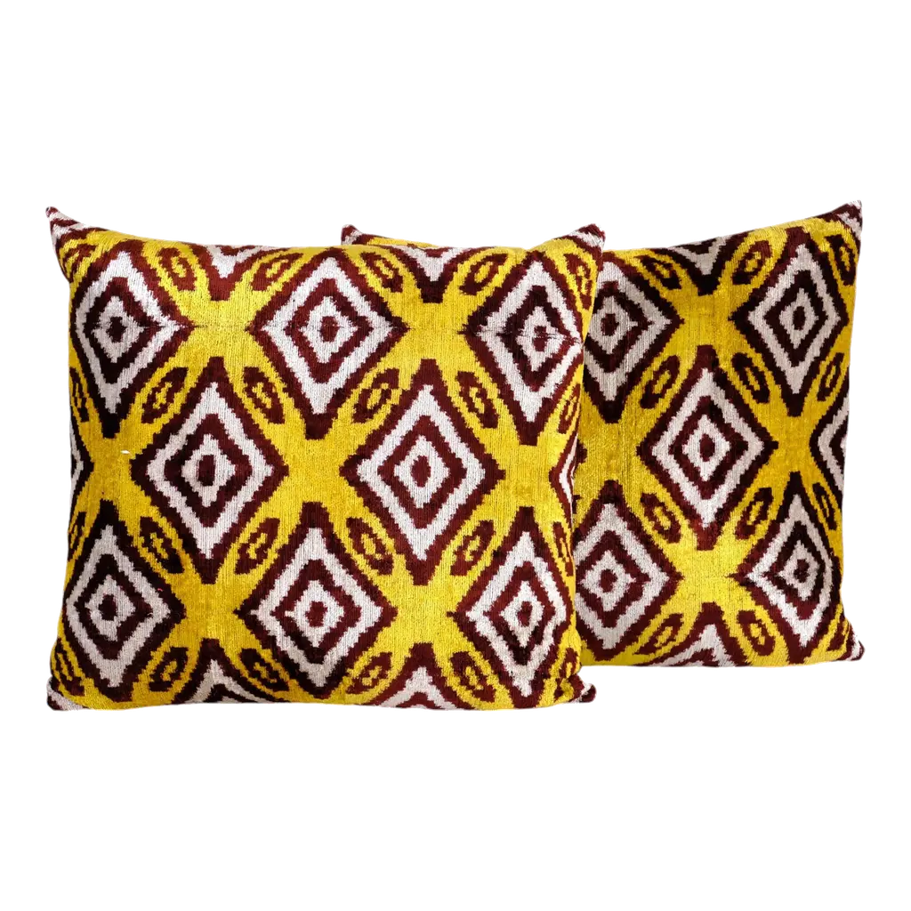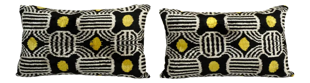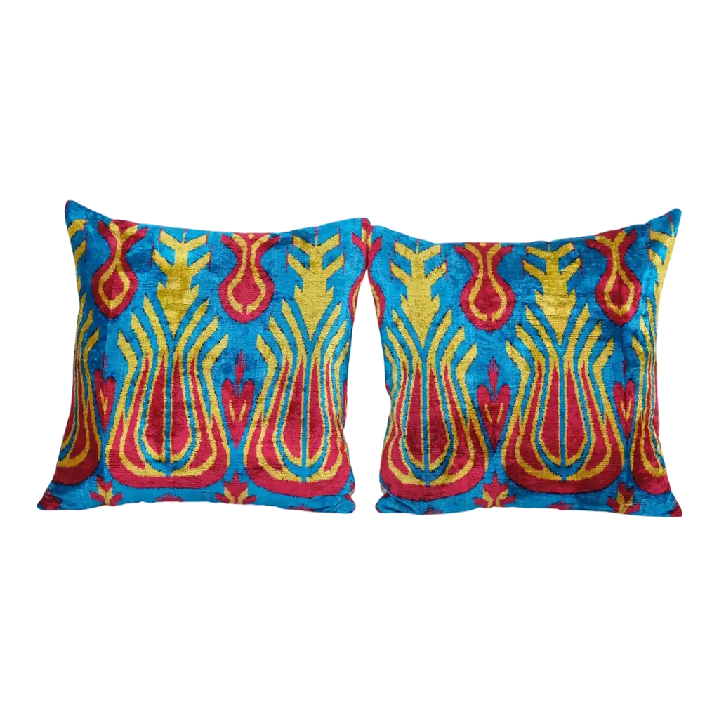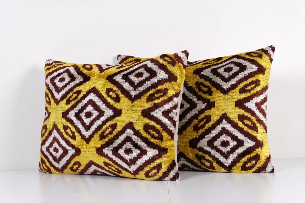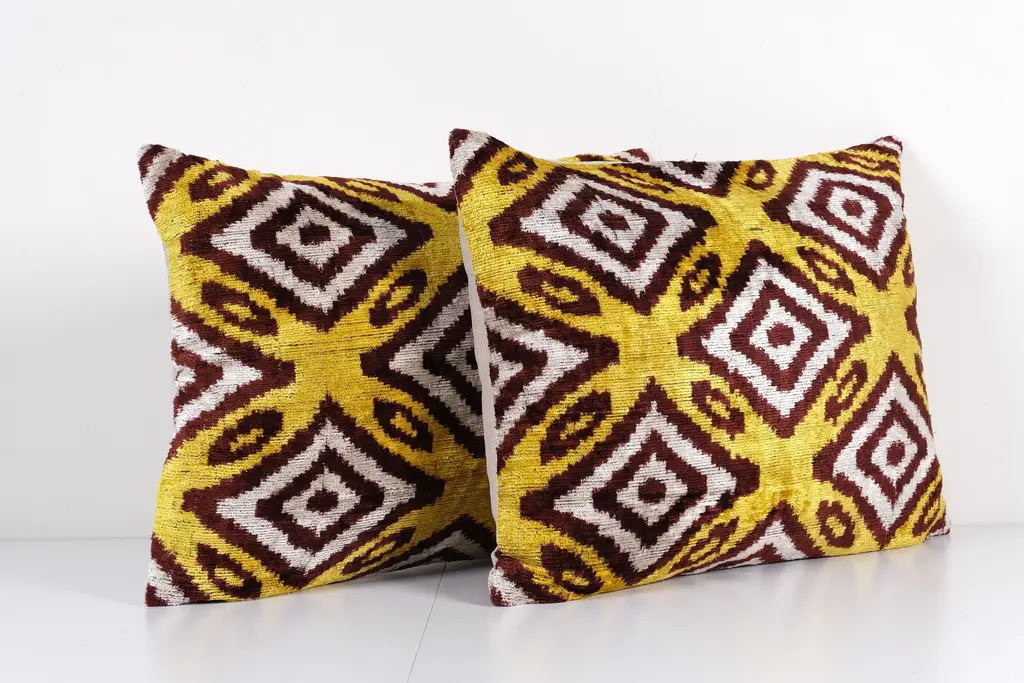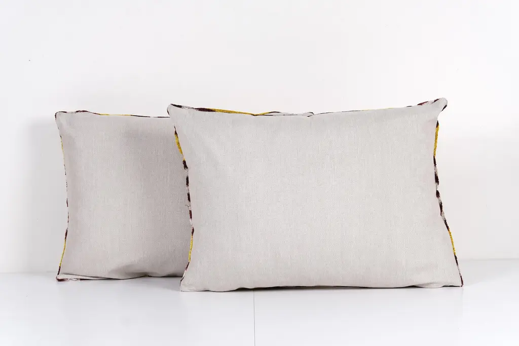Decorative Throw Velvet Ikat Pillow -Luxurious cushion cover of handloomed ikat fabric -Insert is NOT included -Color: Orange and Beige -Ikat is an beautiful fabric, every pillow is unique but can also contain small imperfections; the charm of a handmade product. Dimensions: 17ʺW(42 Cm) × 6.0ʺD(15 Cm) × 22ʺH( 57 Cm) approx Warning: Since ikat is a handmade fabric, the width and length of the throw pillow can be a few inches smaller or larger. -Handloom 80% silk velvet 20% cotton -Back side is cotton fabric and with hidden zipper. -Handwoven velvet pillow case only, -Hand wash 30 C or dry clean -Colors may be slightly different in reality from those shown on the photos, due to the nature of photographing and device monitor settings. -Custom duties may apply.