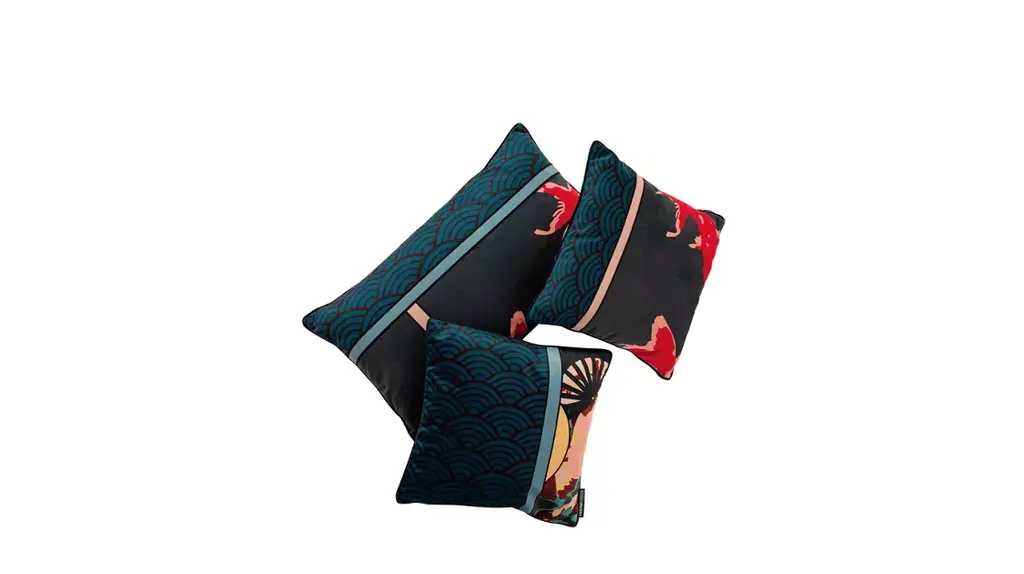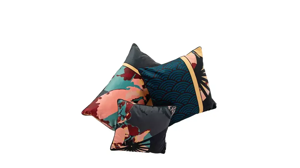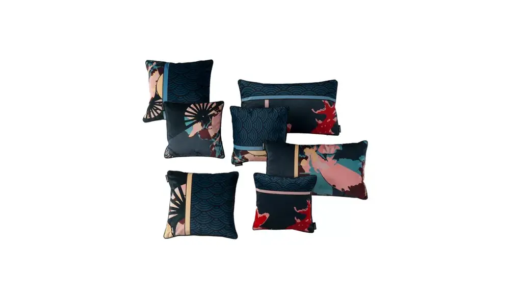 The designers Messieurs have created a collection of cushions based on the color codes and Japanese-inspired motifs of the Yumi rug.