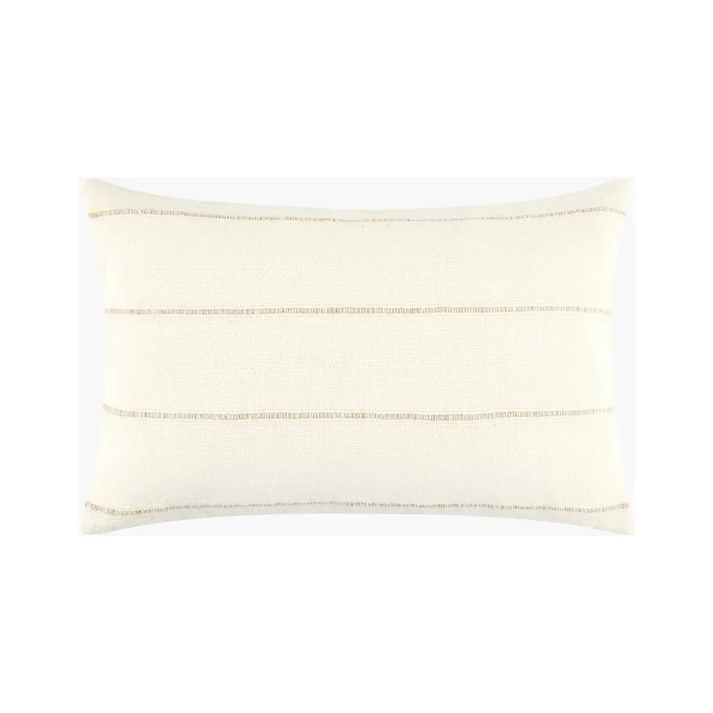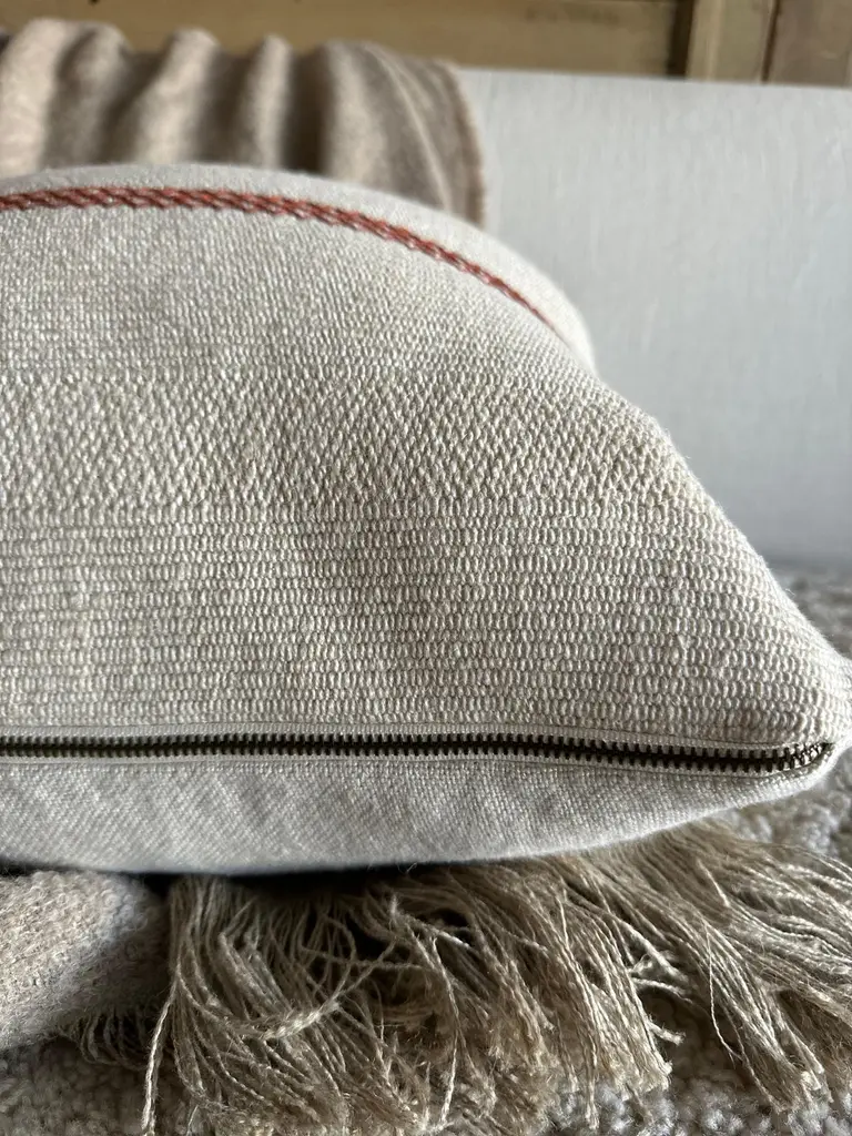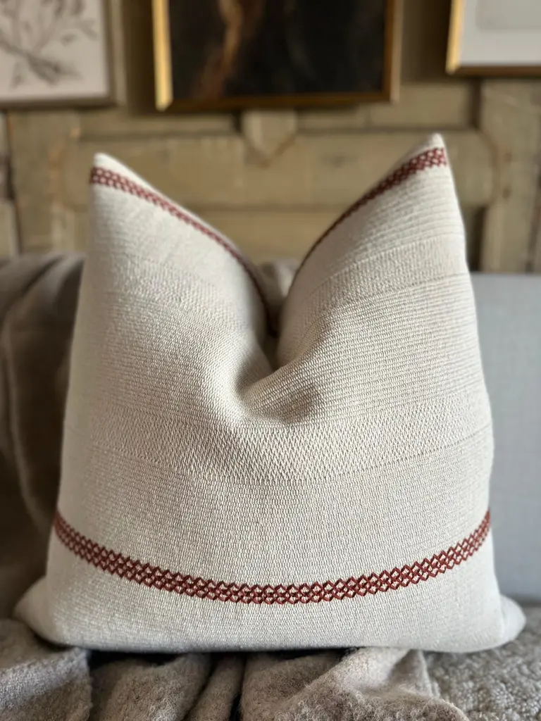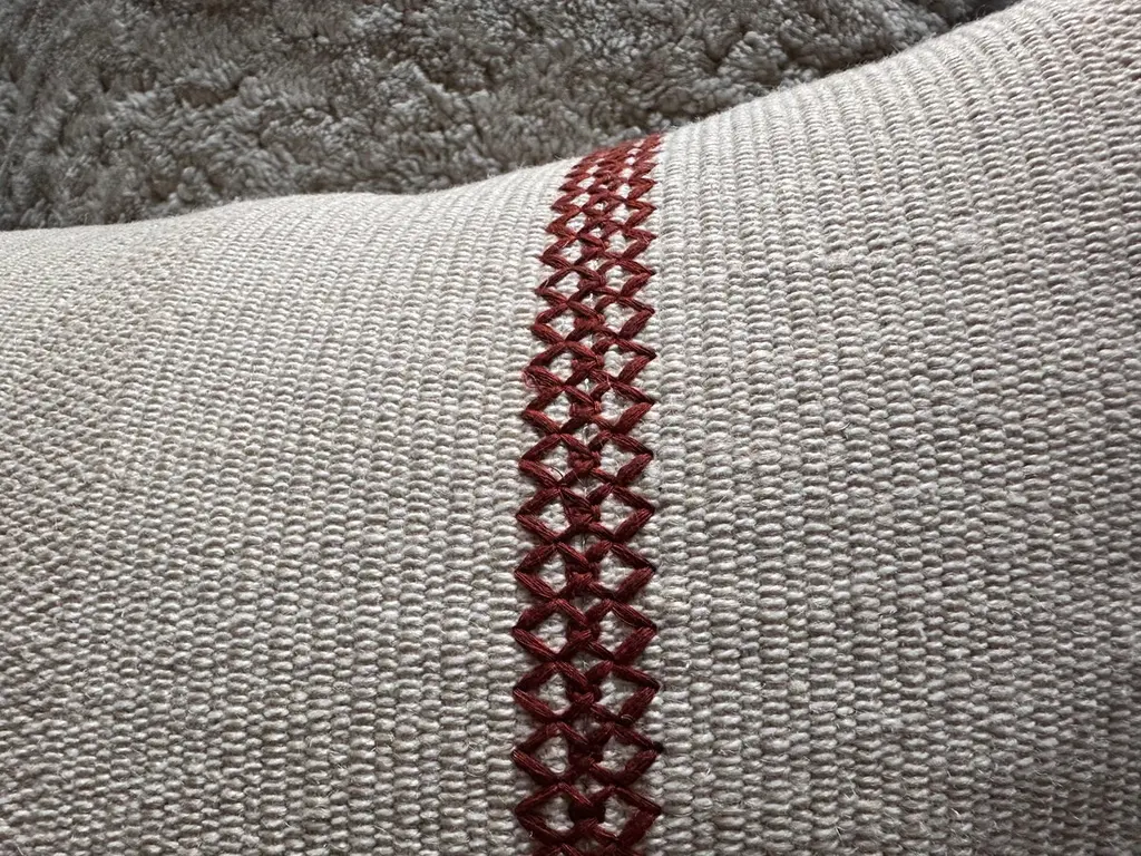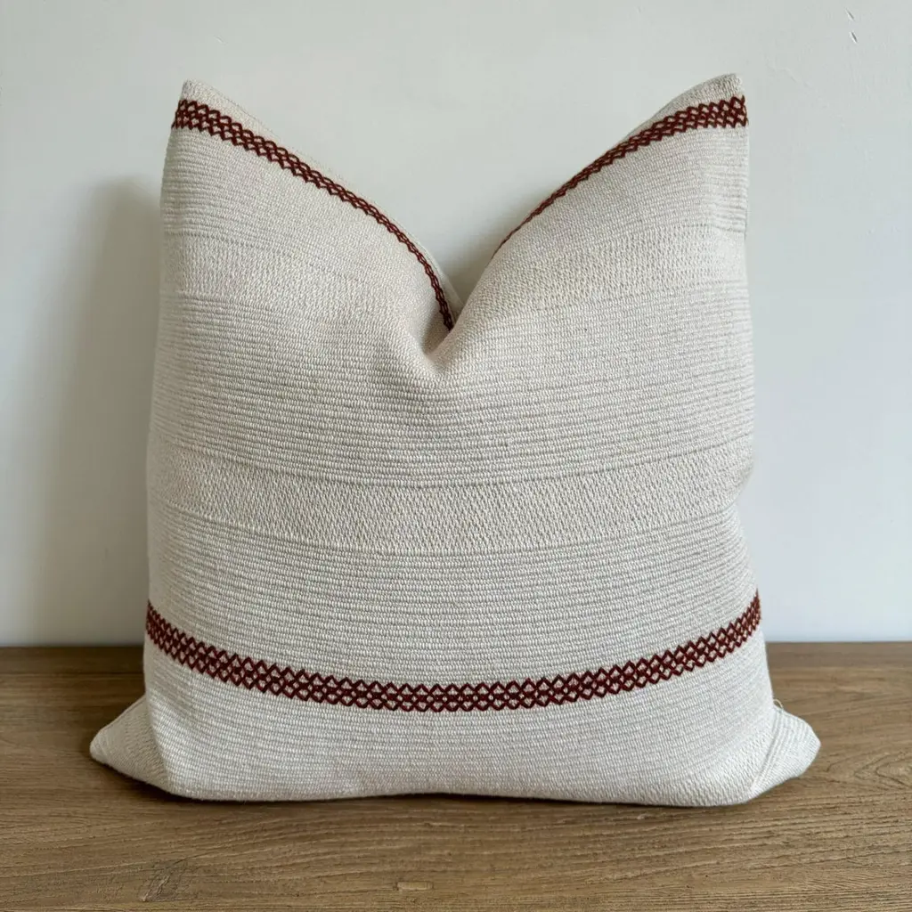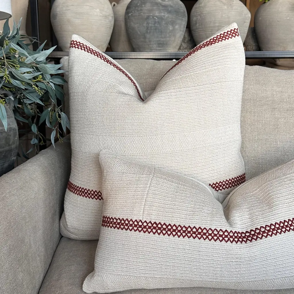 ZAK + FOX hemp jute and cotton blend Baratillo in naturel with red embroiderySize: 22x22Antique brass zipper closureoverlocked stitched edgescolor: natural / redWoven by hand, cut, patched and embroidered, Baratillo’s mystique comes from its elaborate and intensive construction process. Named for the infamous “smuggler’s market” in Peru, its extraordinary heft and complexity give it the markings of a rare and treasured find.Embroidery is placed 14″ apart. Due to the pattern’s unique construction, a small horizontal seam occurs within the panels in a half-dropped formation every 53″. Measurements may shift slightly as this is a handwoven product.