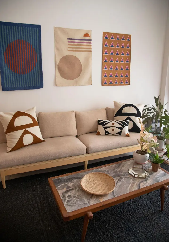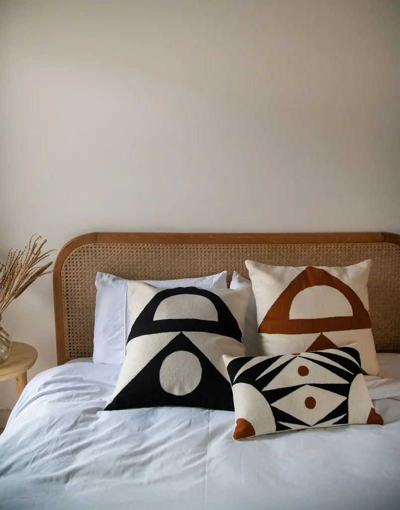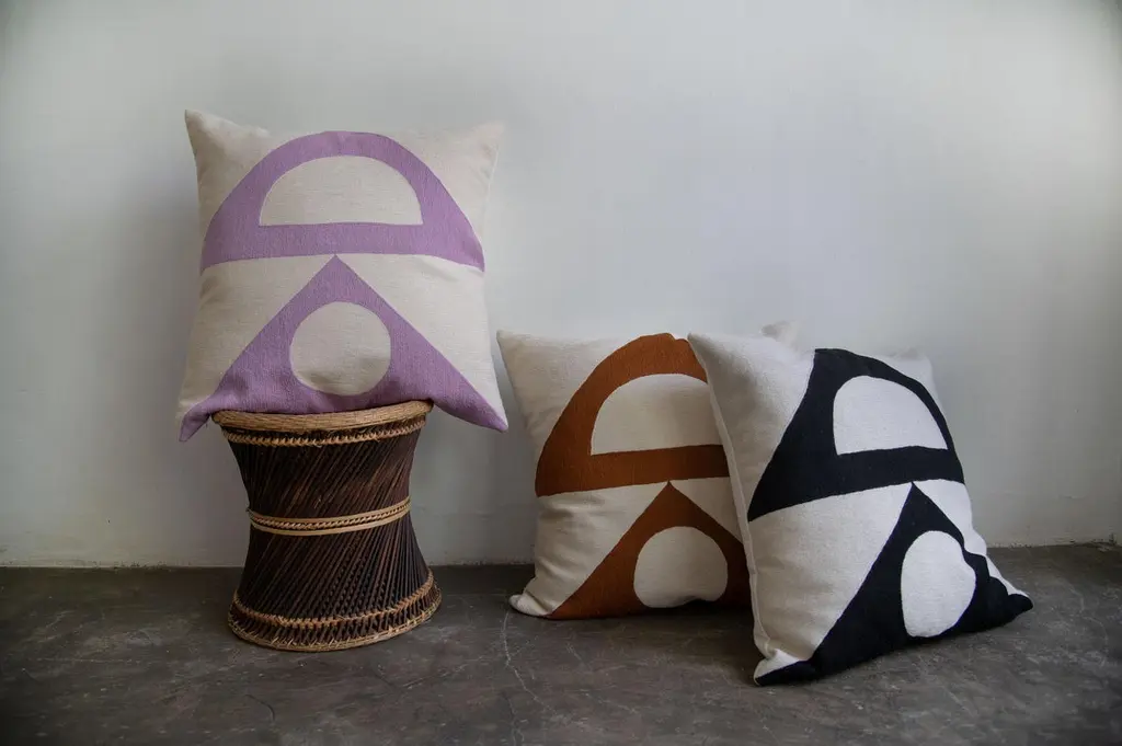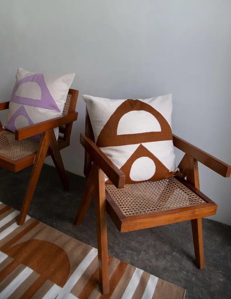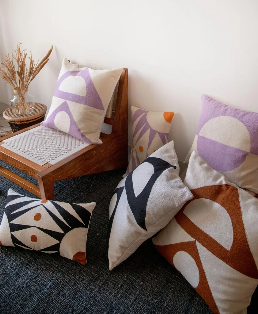 This geometric throw pillow has been ethically hand embroidered by artisans in Kashmir, India, using a traditional embroidery technique which is native to this region.The purchase of this handcrafted pillow helps to support the artisans and preserve their craft.Each piece may vary slightly due to the nature of handcrafted goods.Face: wool embroideryReverse: cottonConcealed zipper closure Measures: 22" x 22"Dry cleanInsert not included.