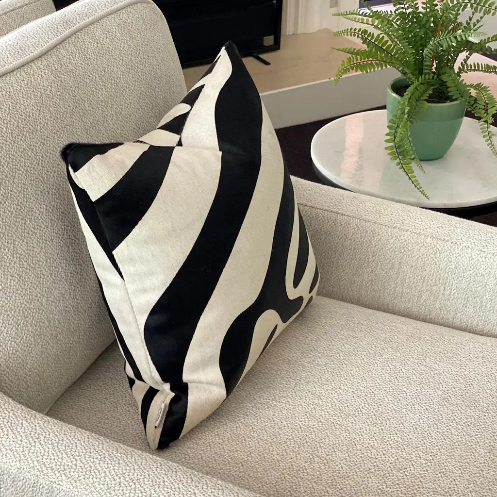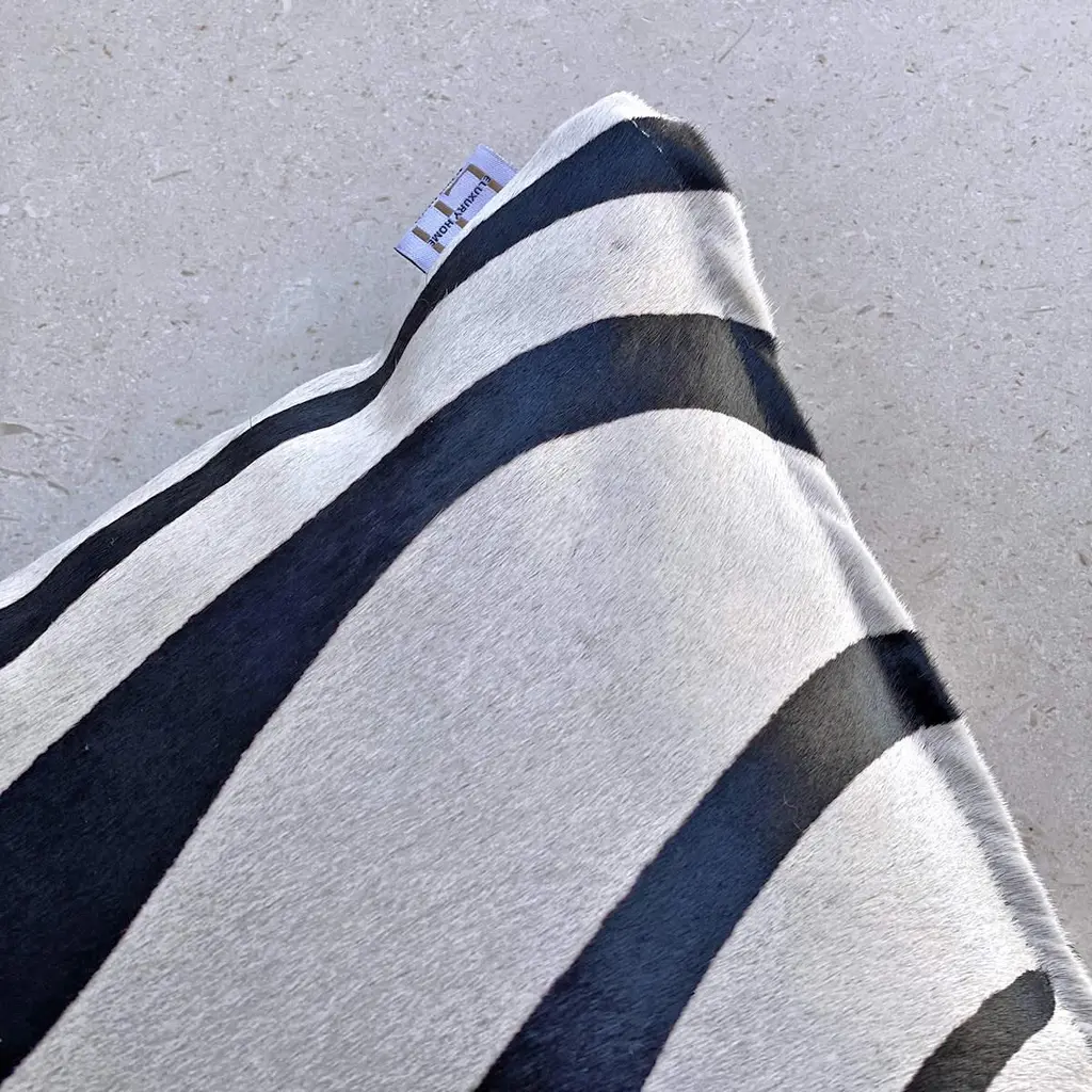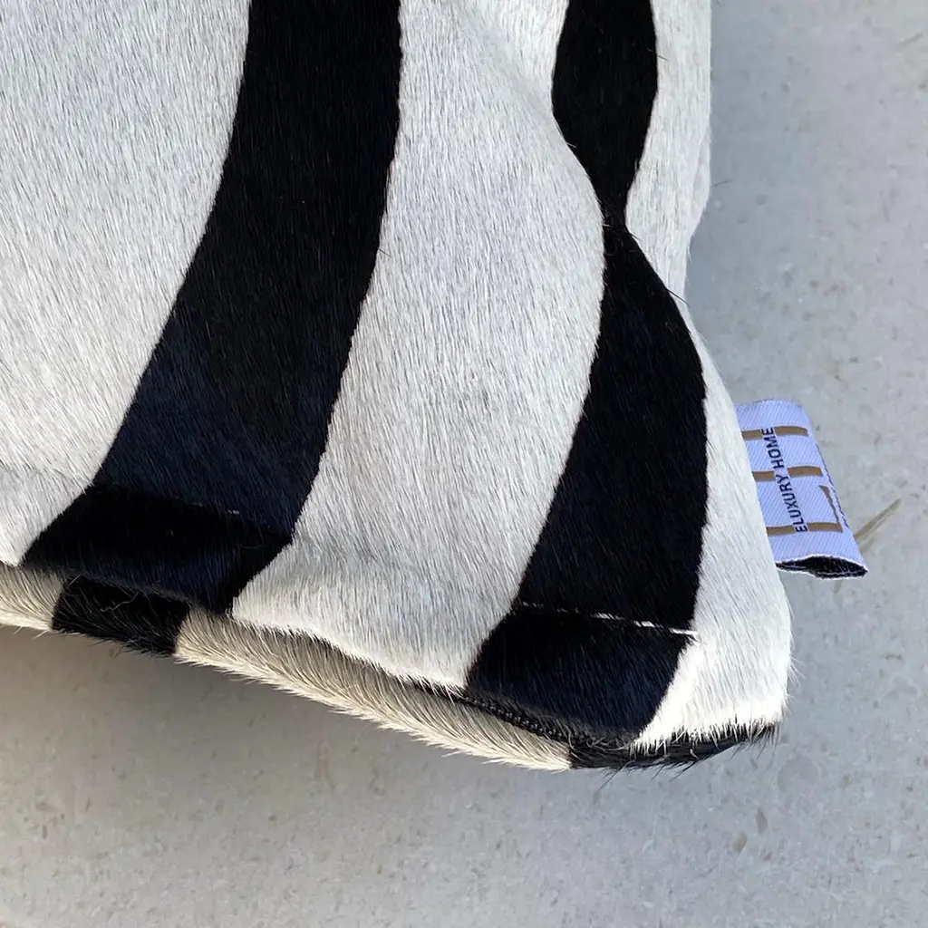 Add exotic flair to your interiors with this zebra print pillow. Australian Designer and Artisan, Emily Barbara personally pre-selects and pre-patterns the zebra print cowhide skins to capture the striking pattern and color tones prior to creating the zebra pillows.Each zebra pillow is handcrafted in Australia from high-quality zebra printed cowhide skins deriving from natural by-product, Southern Brazilian cattle. With a short hair pile, the zebra print is screen printed over a cowhide that features natural off white tones to embrace the beauty of an authentic zebra print while preserving the wild zebra animal. The 18x18" zebra cushion comes with the cowhide print on the front and back and fitted with a feather insert.Features:Printed cowhide skinScreen printed zebra print designZipper closureFitted with feather insertMade in Australianatural by-product.This zebra print cushion is a natural product therefore no two cushions will ever be identical. Variations in pattern, print, and colour tone will vary and are classed as natural characteristics.