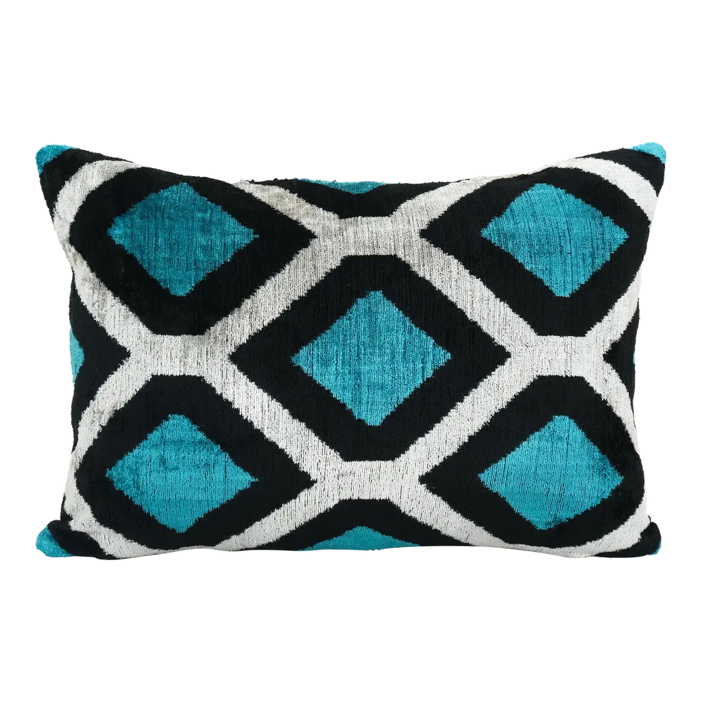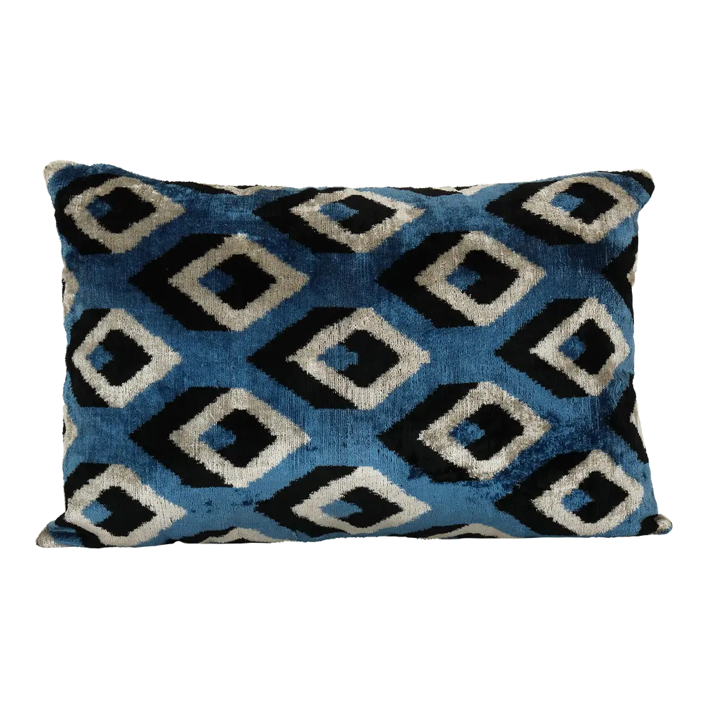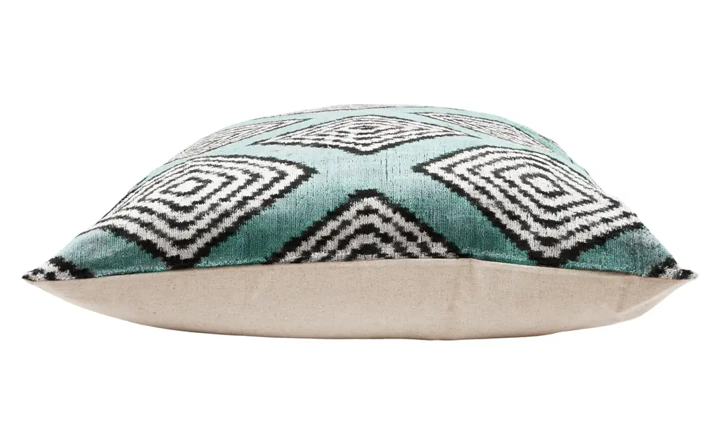 Bring a global-chic feel to your sofa or bed with our Zev Pillow. Made from super-soft silk velvet, Zev is crafted using traditional ikat techniques — a centuries-old resist-dyeing process that originated in Central Asia. In this method, threads are wrapped around a frame and individually tied off with pigment-resistant palm fibers before dyeing and weaving. With each dye color, fibers are added or removed to create colorful and uniquely intricate motifs. Simple yet striking, Zev features a soft blue hue, decorated with a mesmerizing black and cream diamond pattern. Perfect as a layer in modern and boho spaces alike, we love Zev on its own or mixed in with other pillows in a similar palette. •silk velvet •backed in neutral linen fabric •knife edges •hidden zipper closure •down and feather insert •each is unique Dimensions •approximately 24" x 24"
