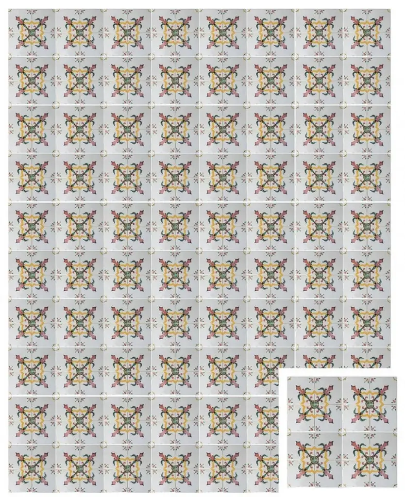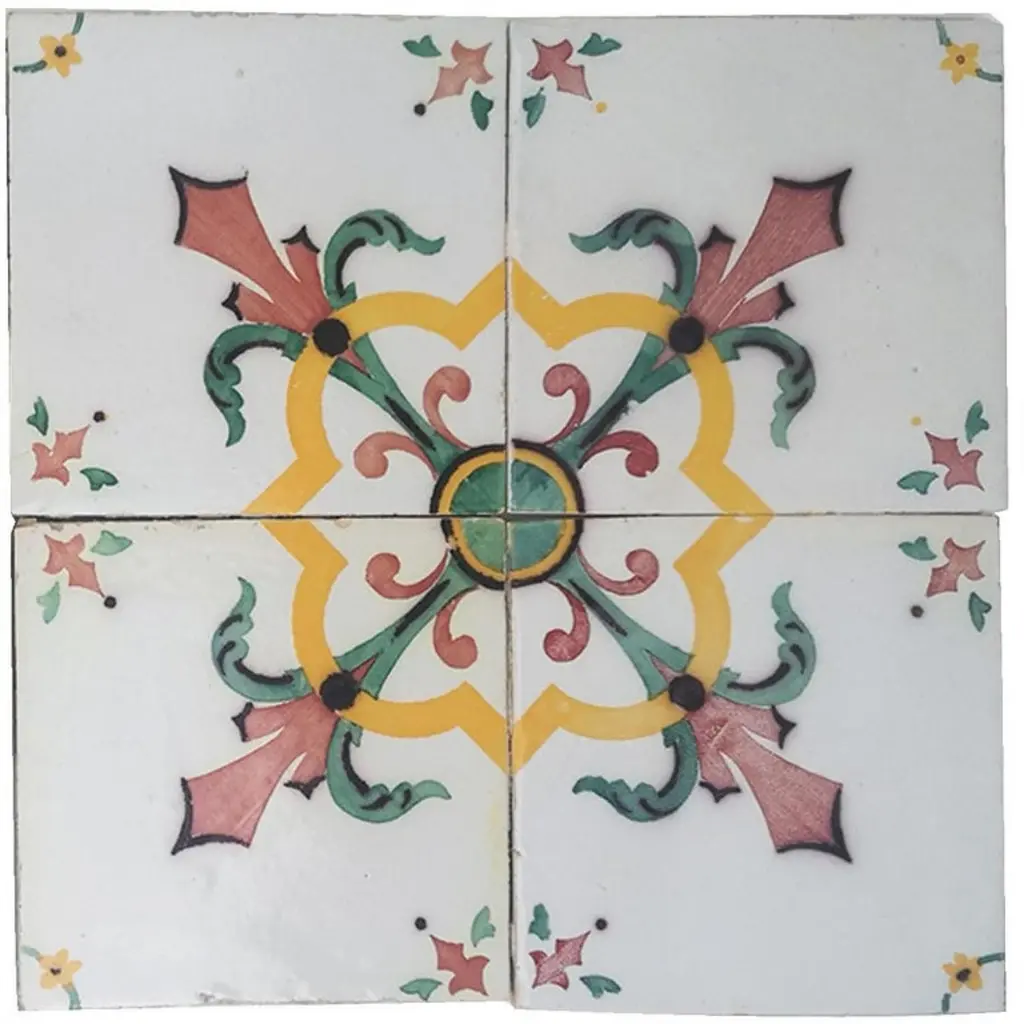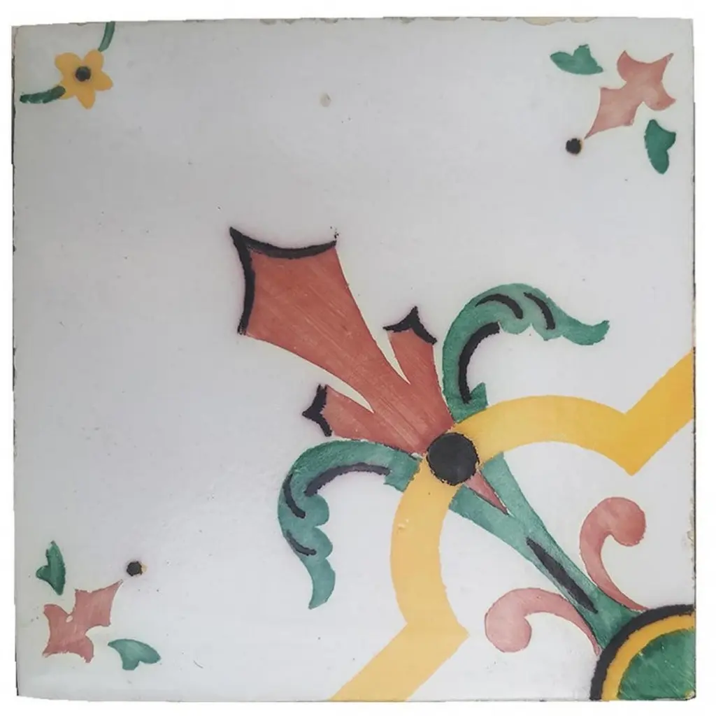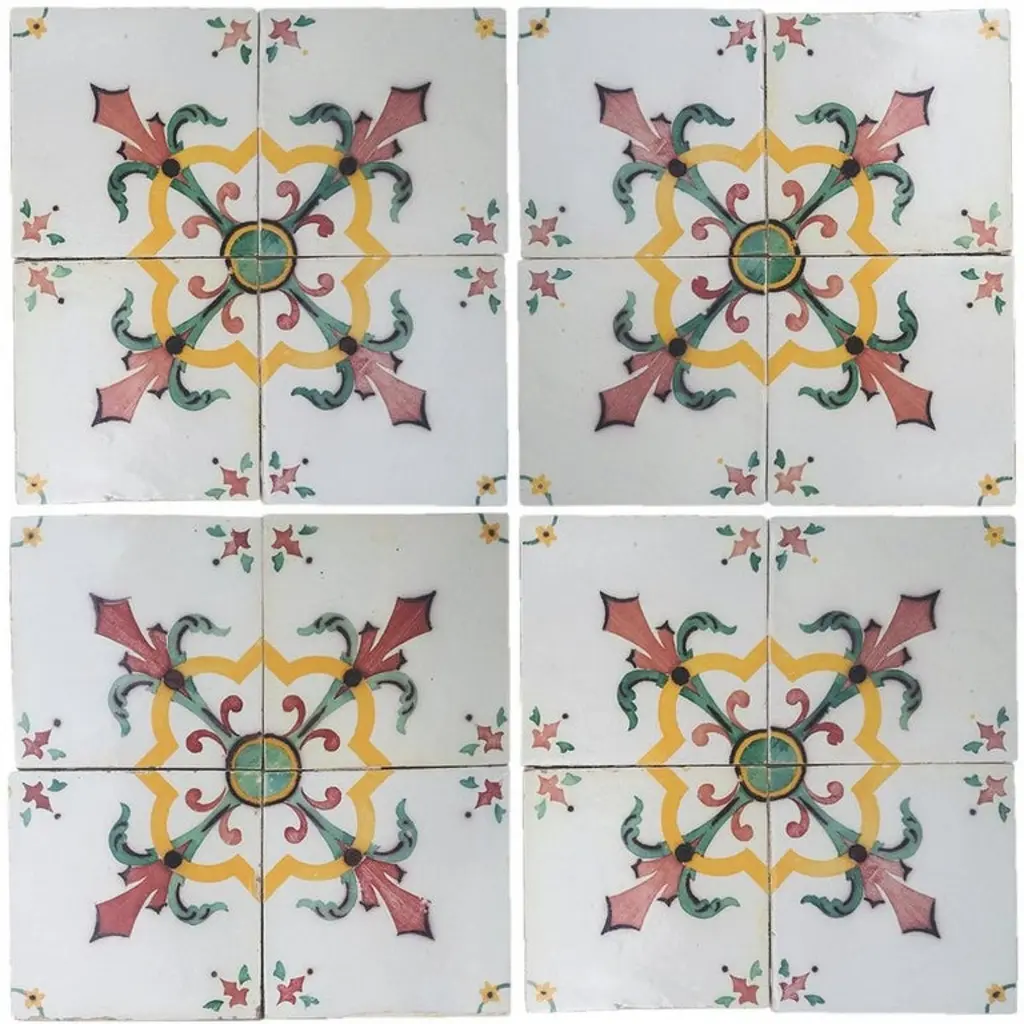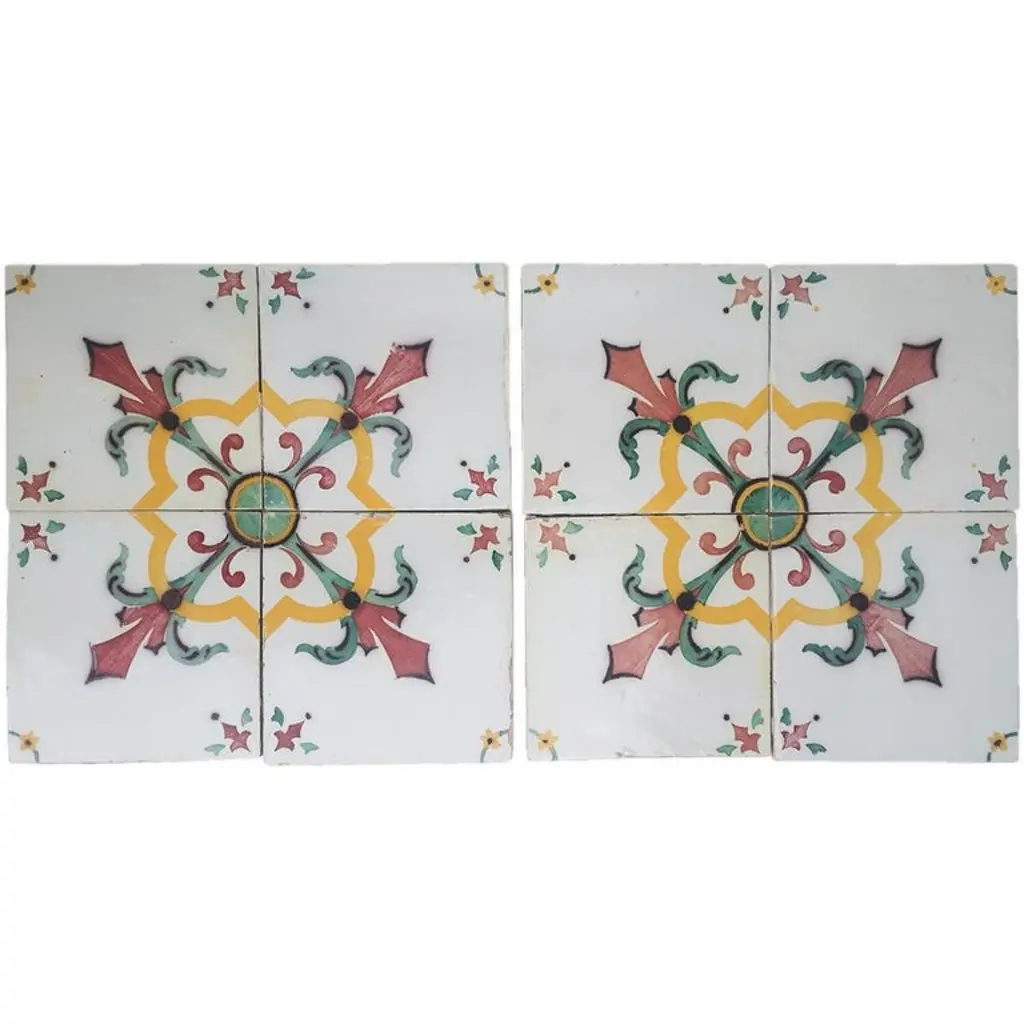 One of 52 antique French handmade ceramic tiles. Manufactured by Devres, circa 1920s. Colorful pattern in yellow, red and green. These tiles would be charming displayed on easels, framed or incorporated into a custom tile design.Please notice the price is for 1 piece. Each pattern consists of 4 separate tiles.Size each tile: 6.4 inches (16.3 cm) width x 6.4 inches (16.3 cm) height.xa0Condition is generally very good. Minor chips, scuffs, color different and wear associated with age. Some crazing to the glaze is part of the historical design. This tiles are handmade and antique. There can be slight variations in each tile's size because of their age and craftsmanship.